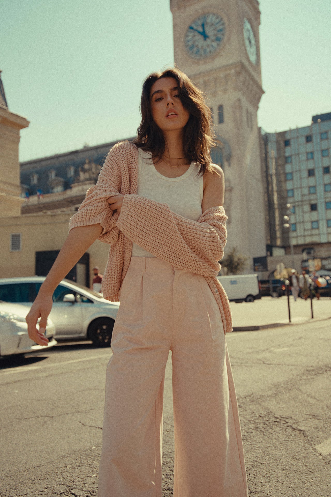 L’incontournable cardigan Cyliane s’impose comme l’allié idéal des journées d’été parisiennes un peu plus fraîches. On le porte ouvert ou en superposition, ici associé à un pantalon Henia large en Tencel pour un look à la fois moderne, fluide et résolument dans l’air du temps !