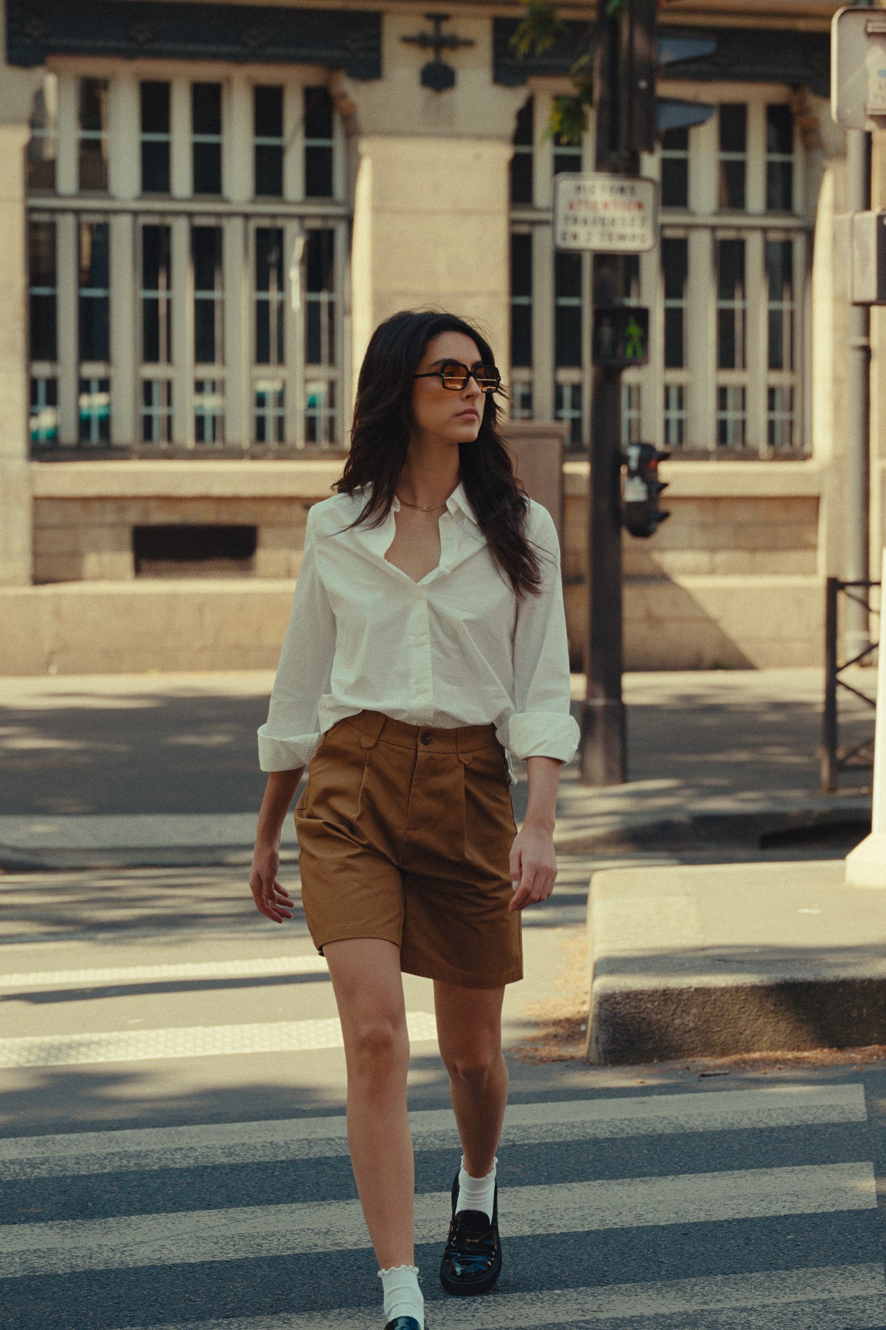 Le bermuda signe son grand retour et s’impose comme l’indispensable de la saison. Confortable, structuré et ultra tendance, on l’adopte sans hésiter pour une allure chic et urbaine, ici revisité avec une chemise blanche pour un look à la fois pointu et intemporel.