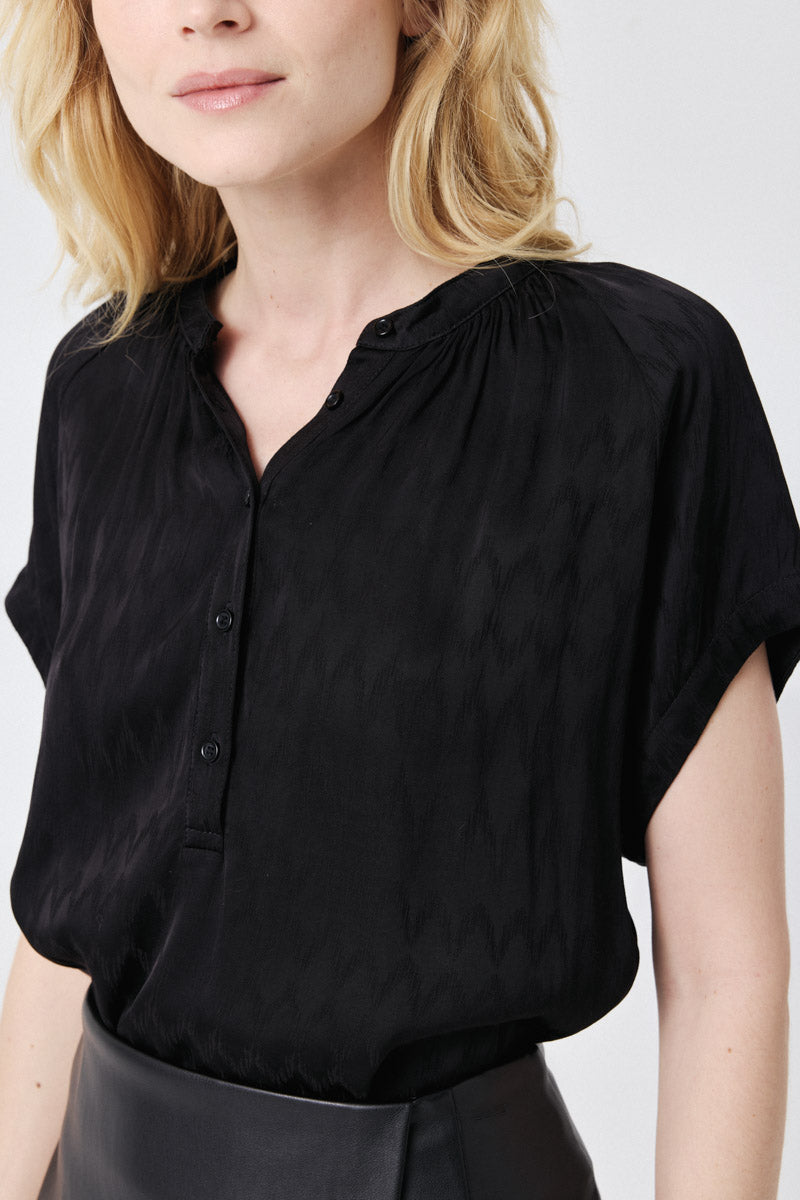 Blouse à col montant avec boutons. Élégance et raffinement pour un look professionnel et sophistiqué.
