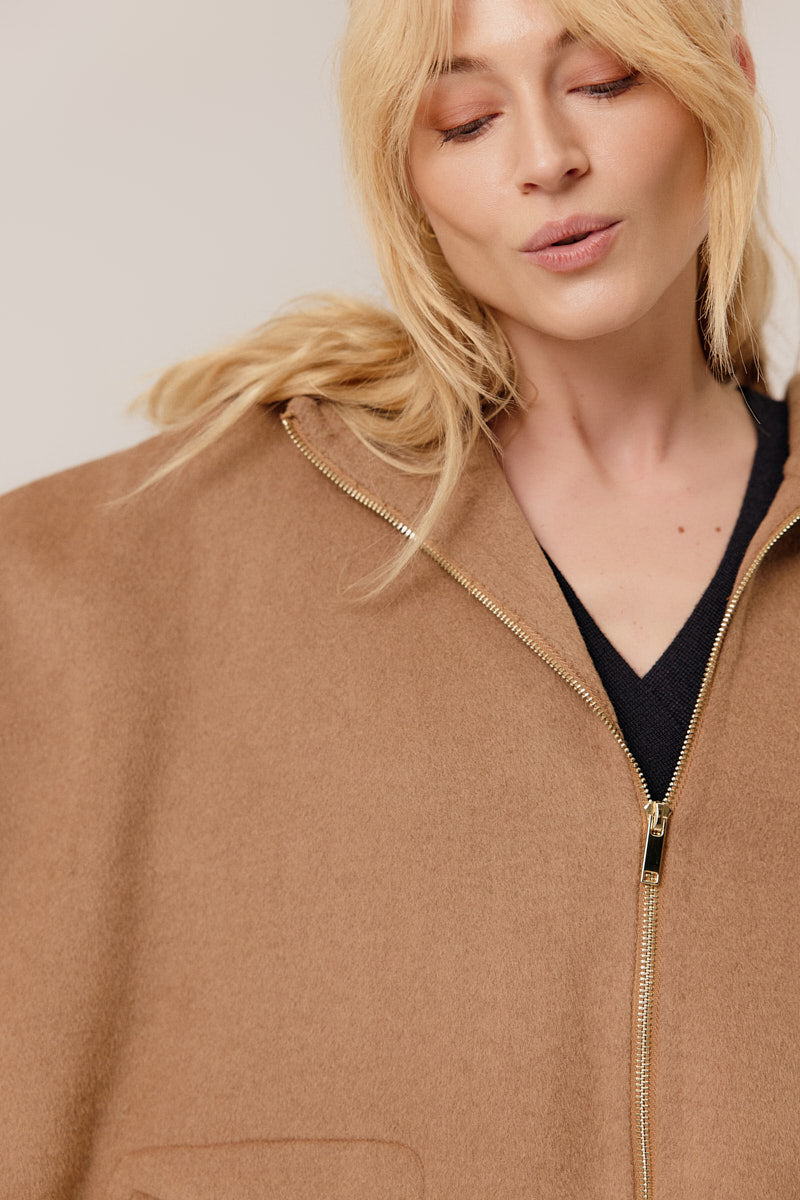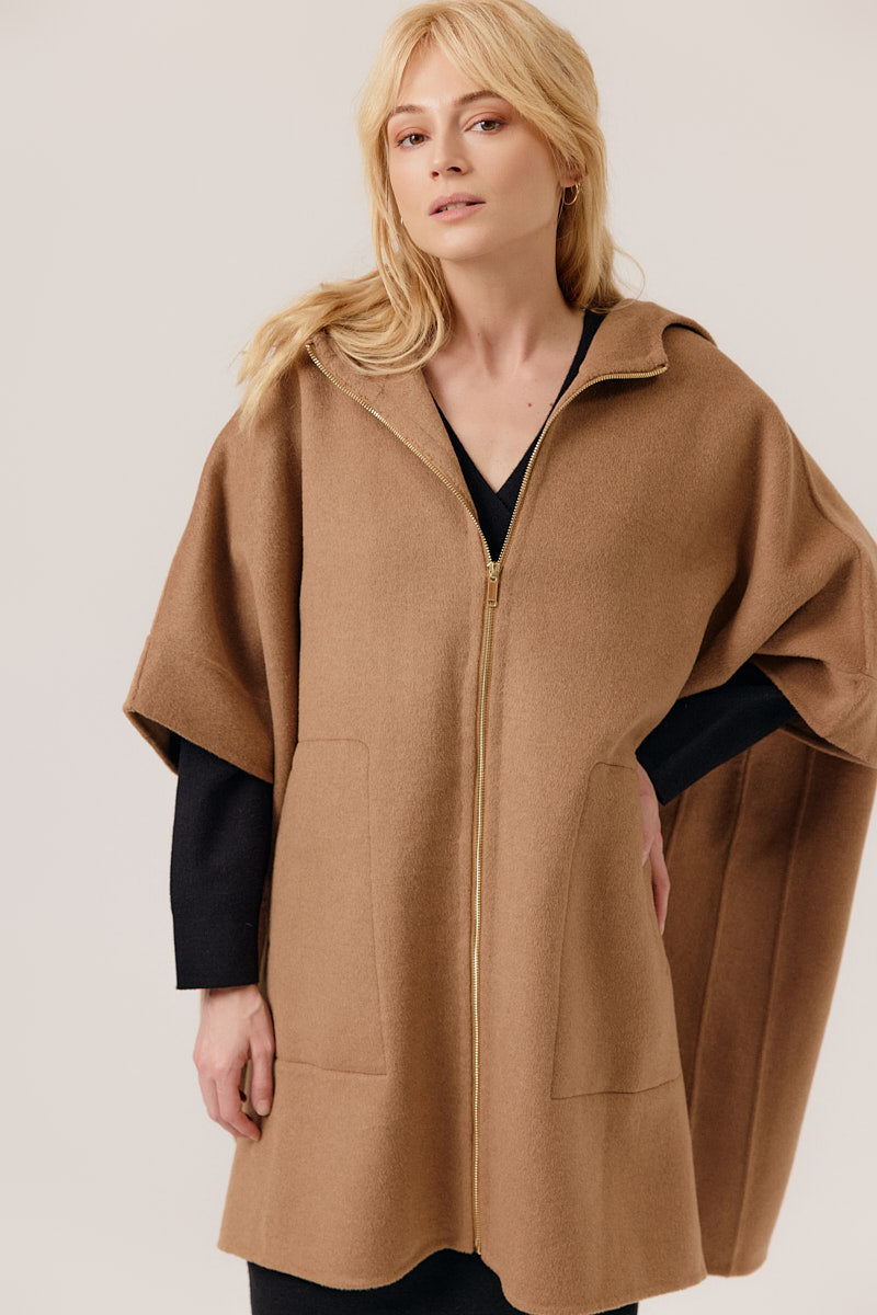 Cape en laine mélangée à capuche, finition zippée et larges manches. Élégante et enveloppante pour les jours frais.