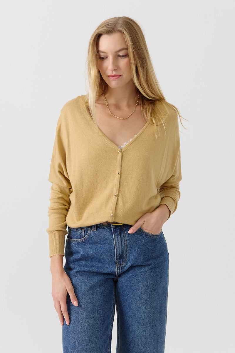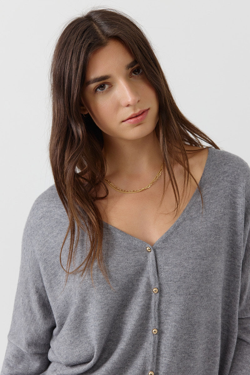Cardigan doux au toucher duveteux, boutons dorés pour une touche féminine.
