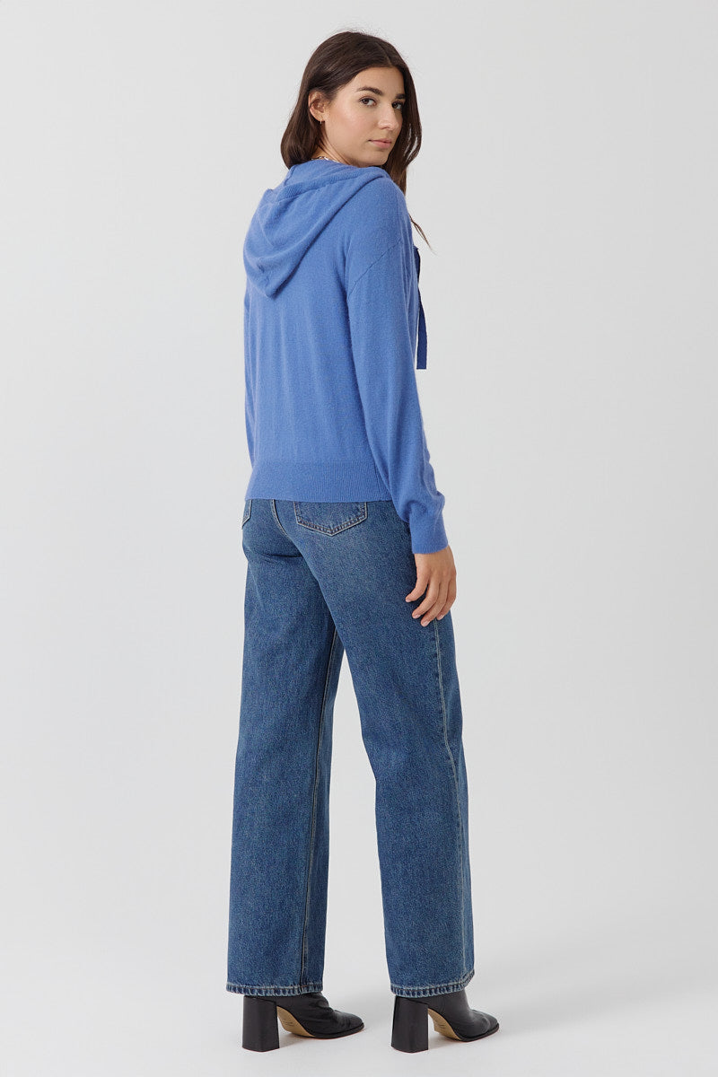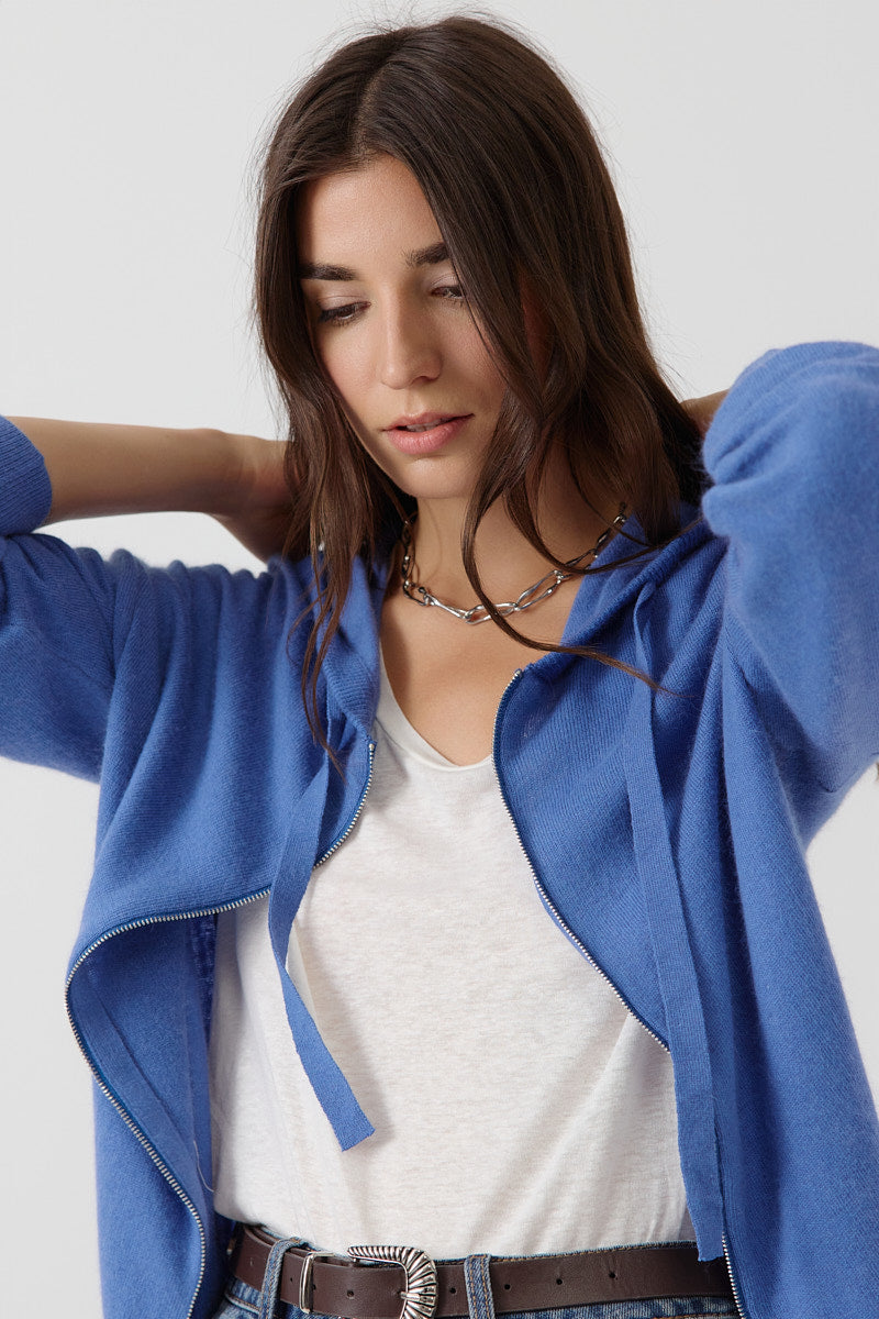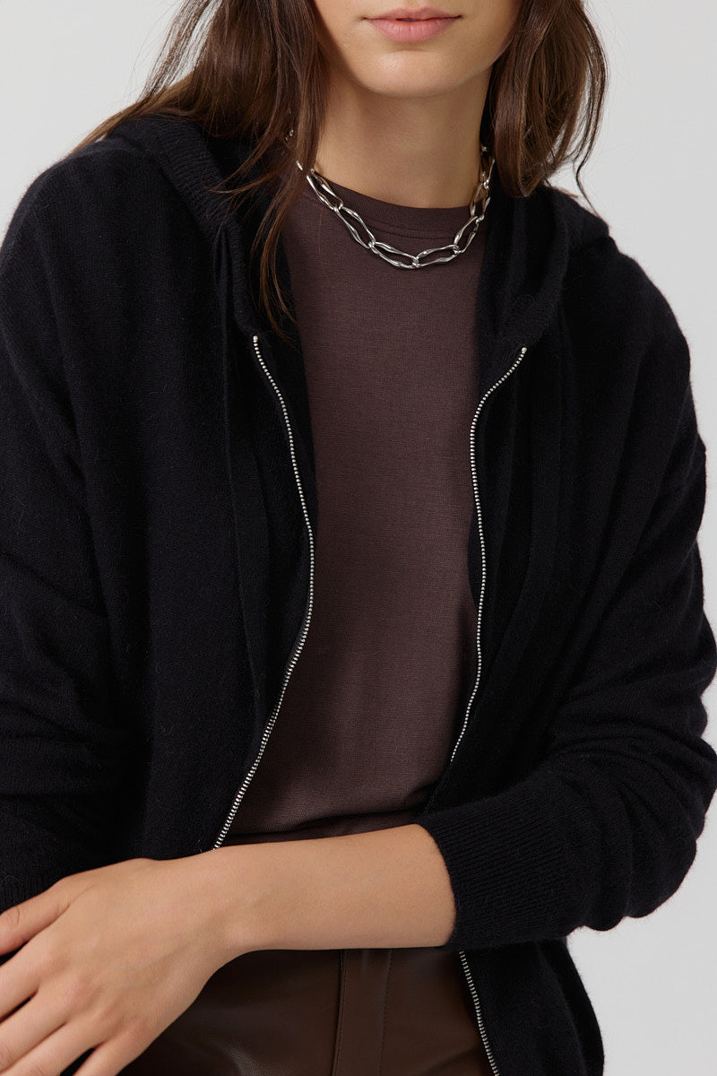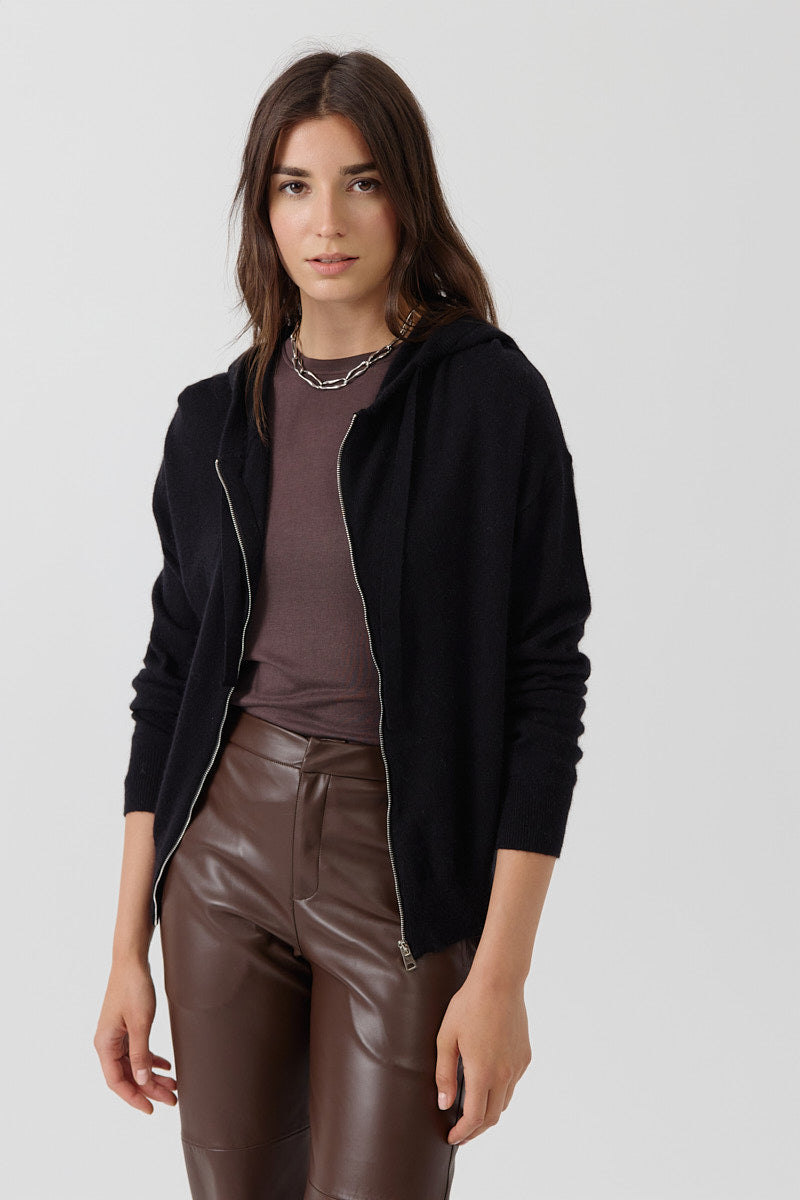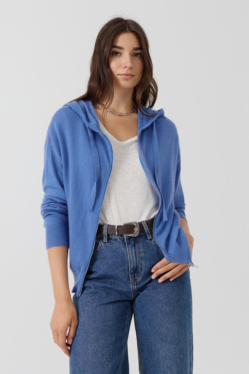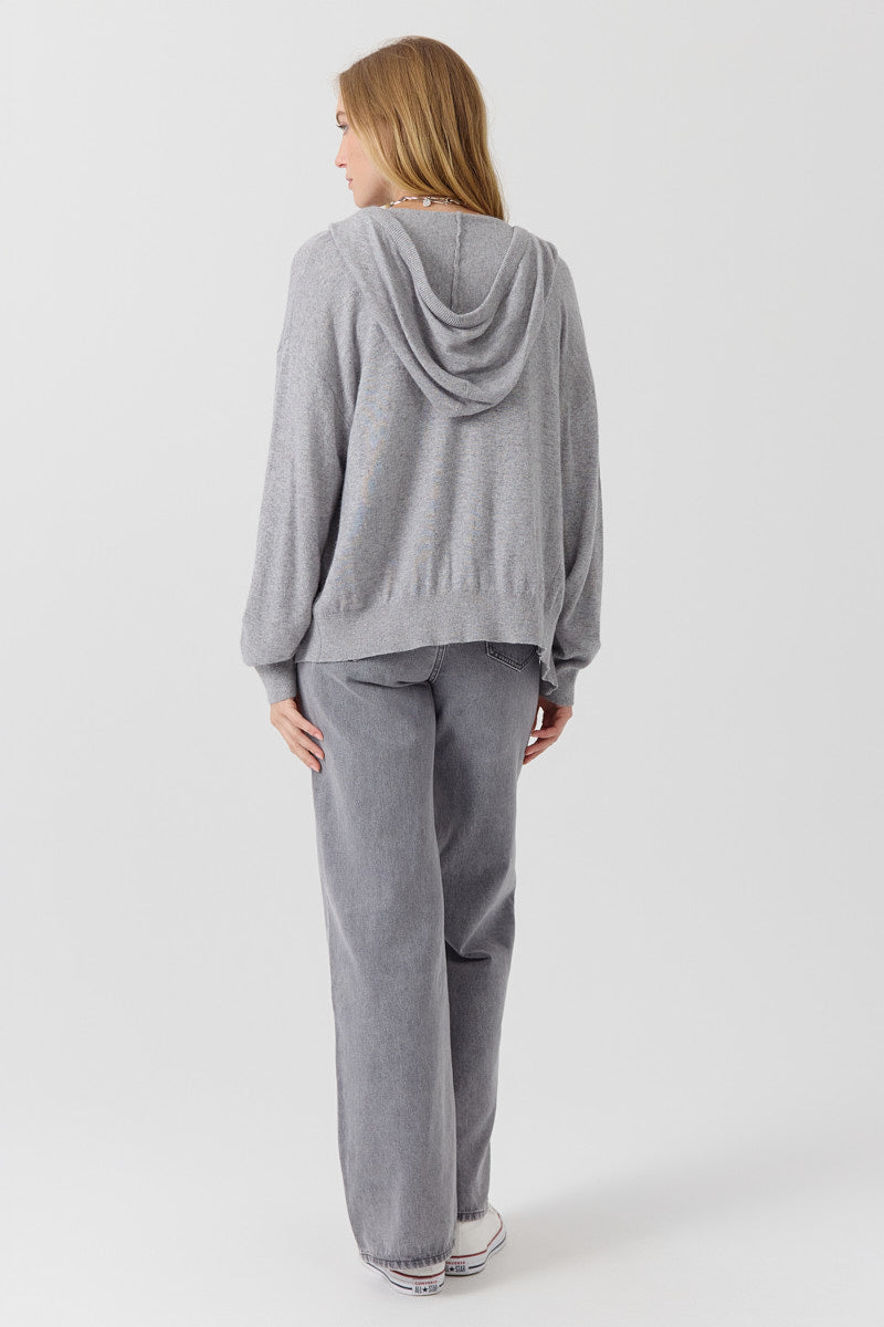 Gilet zippé à capuche, coupe droite et fluide. Maille légère avec poches discrètes. Finitions en bord-côte aux poignets et à la base. Coupe normale.