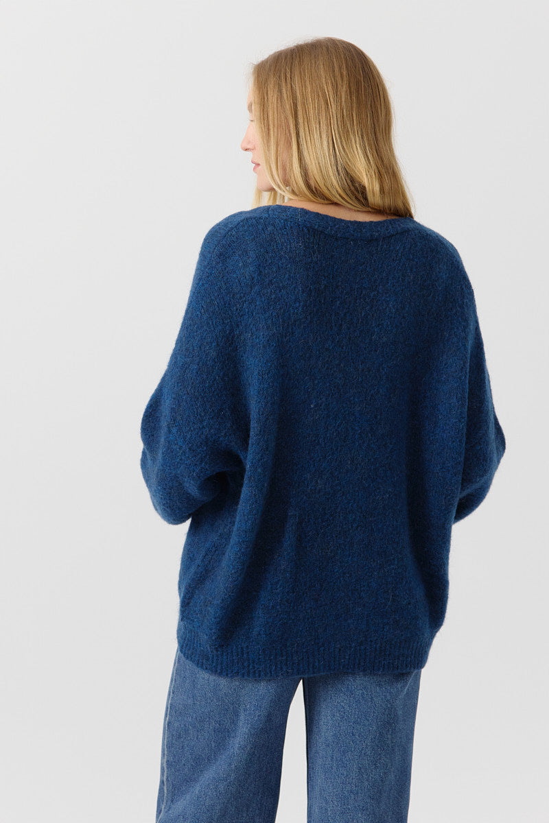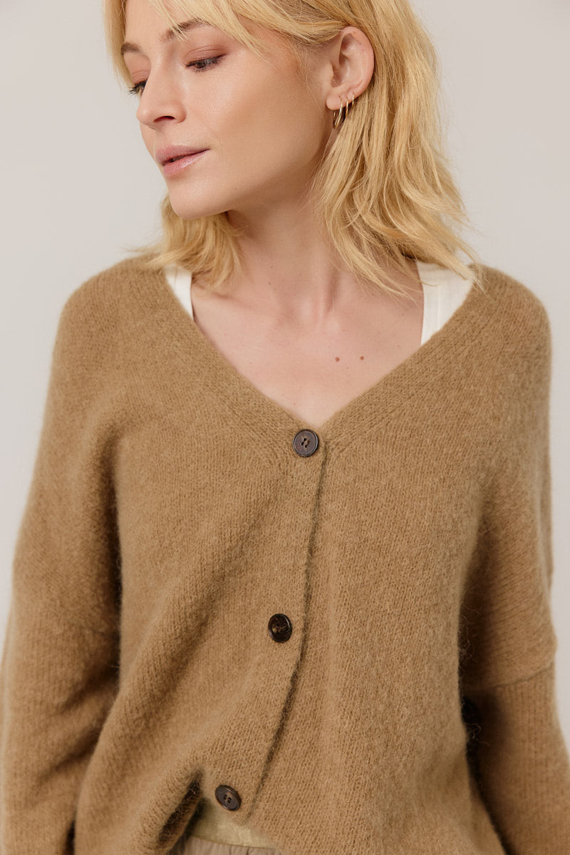 Gilet doux à encolure en V, coupe ample et fluide. Se porte aussi bien sur une jupe que sur un pantalon.