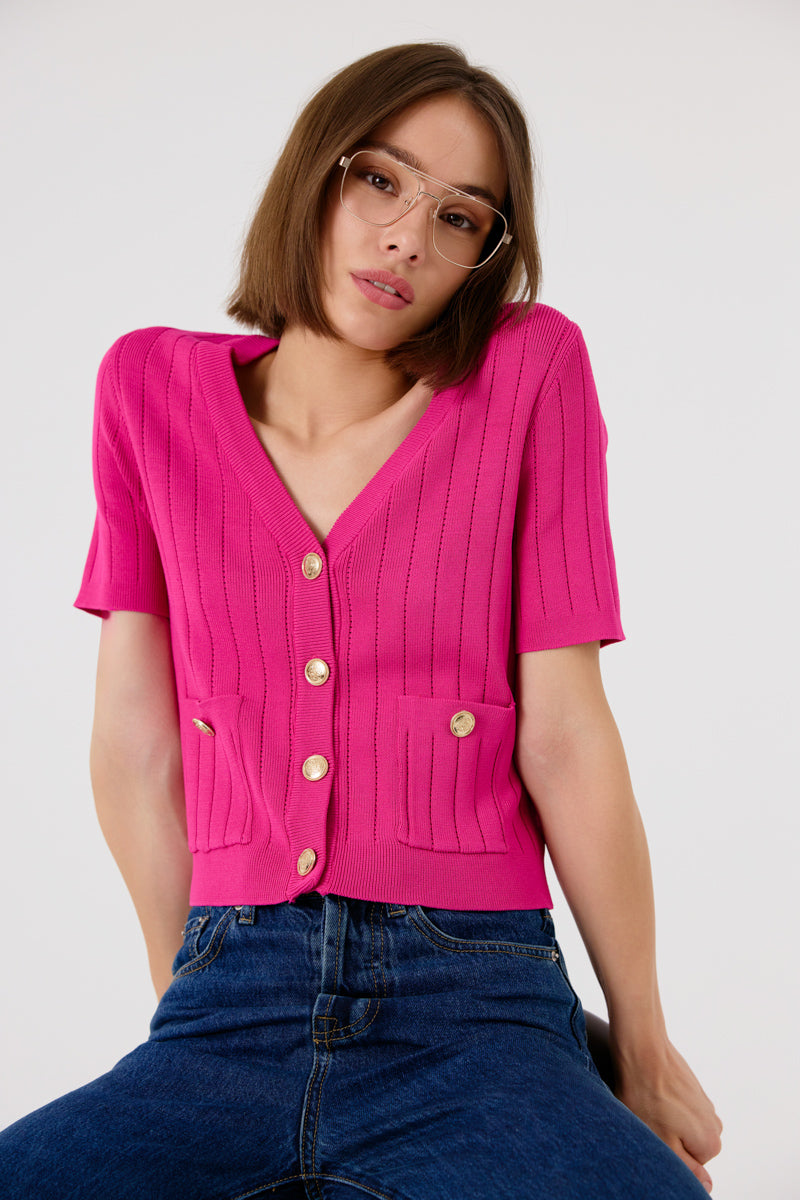 Ce cardigan vibrant à manches courtes ajoute une touche de couleur audacieuse à votre tenue. Ses boutons dorés apportent une finition élégante et féminine.
