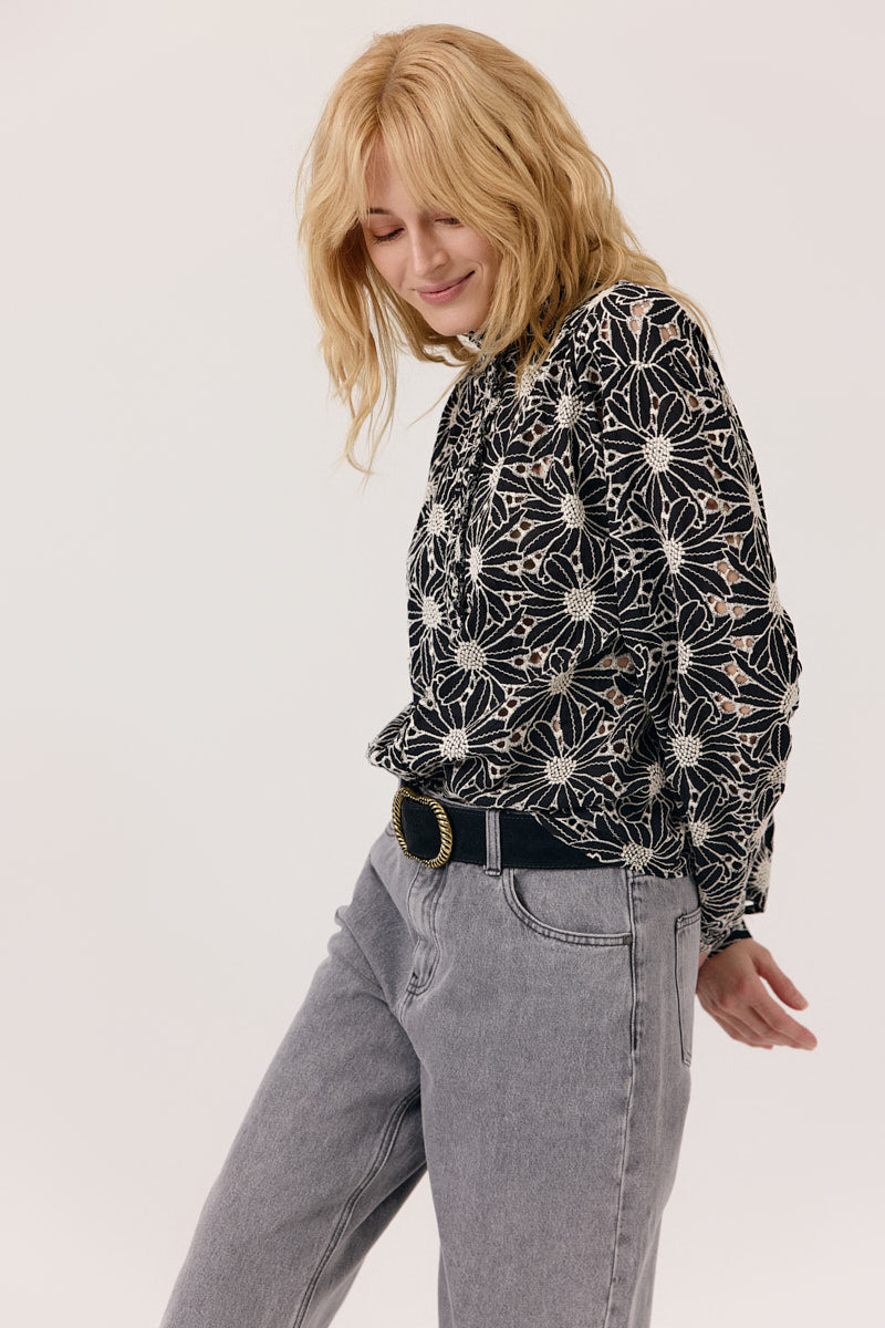 Chemise noire à broderie florale contrastée. Une pièce forte au caractère affirmé.