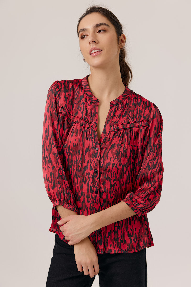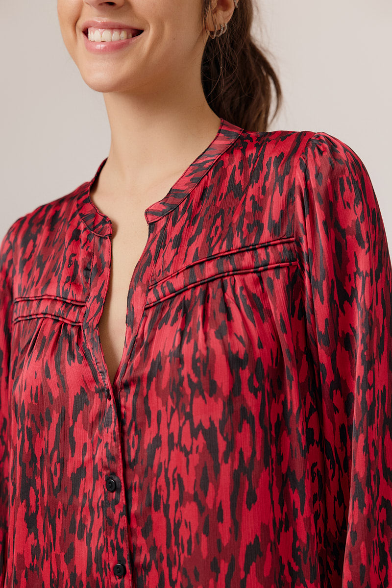Blouse rouge imprimé animalier à col fendu. Une touche de pep’s pour réveiller la silhouette.