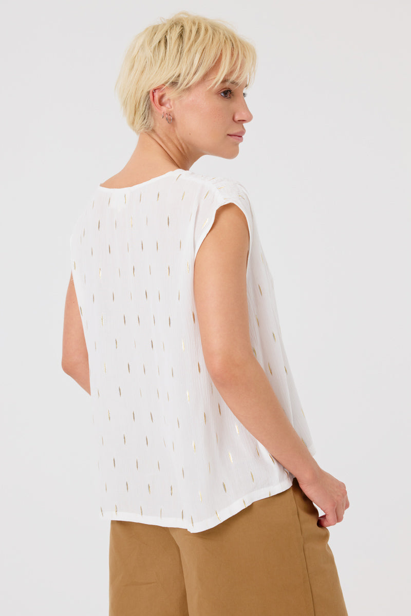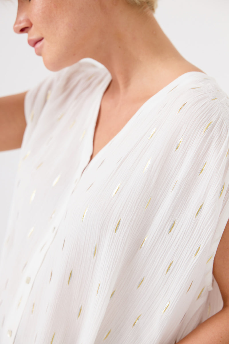 Blouse sans manches avec détails dorés subtils pour une touche lumineuse, coupe ample et boutonnée.