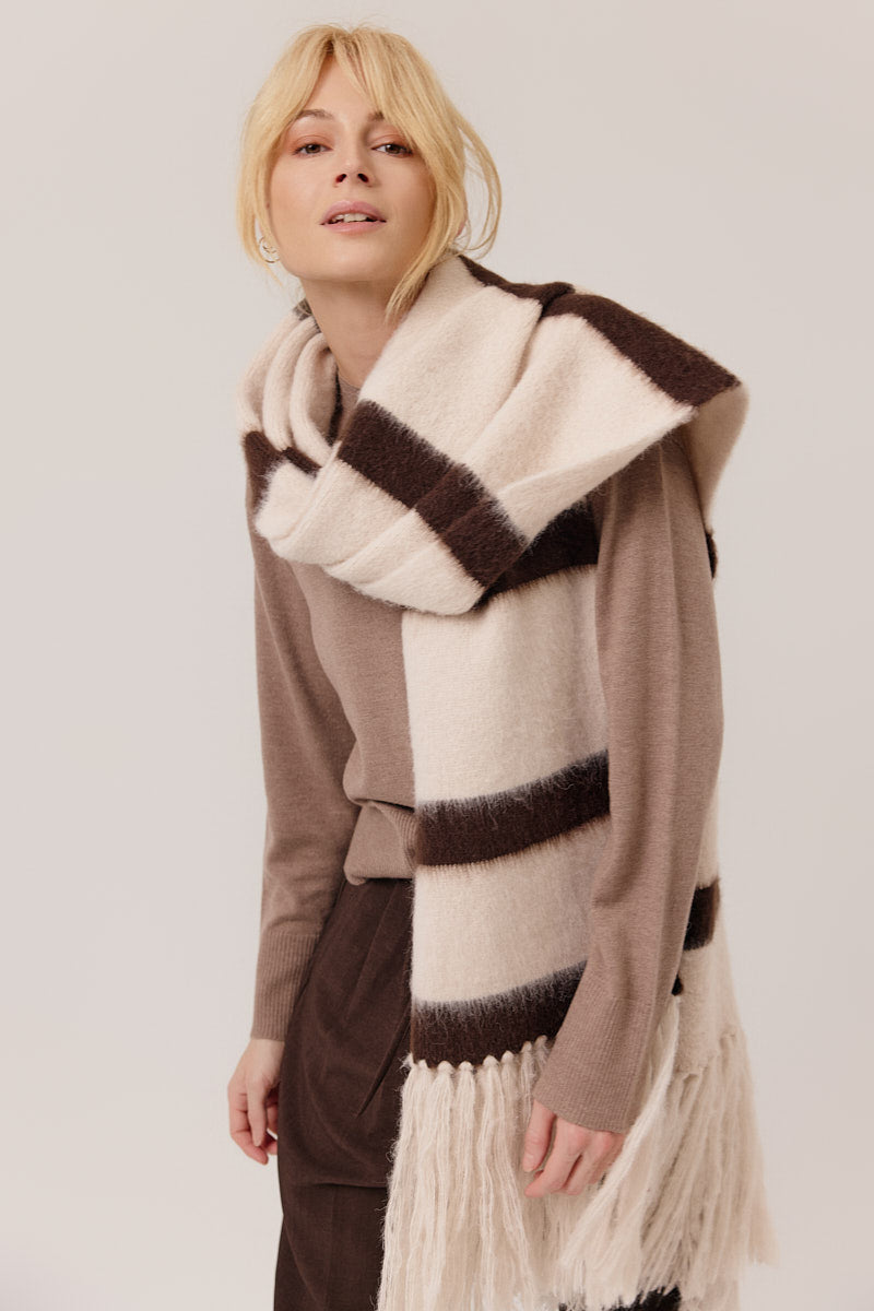 Écharpe oversize à rayures contrastantes avec longues franges. Elle réchauffe n'importe quelle silhouette hivernale.