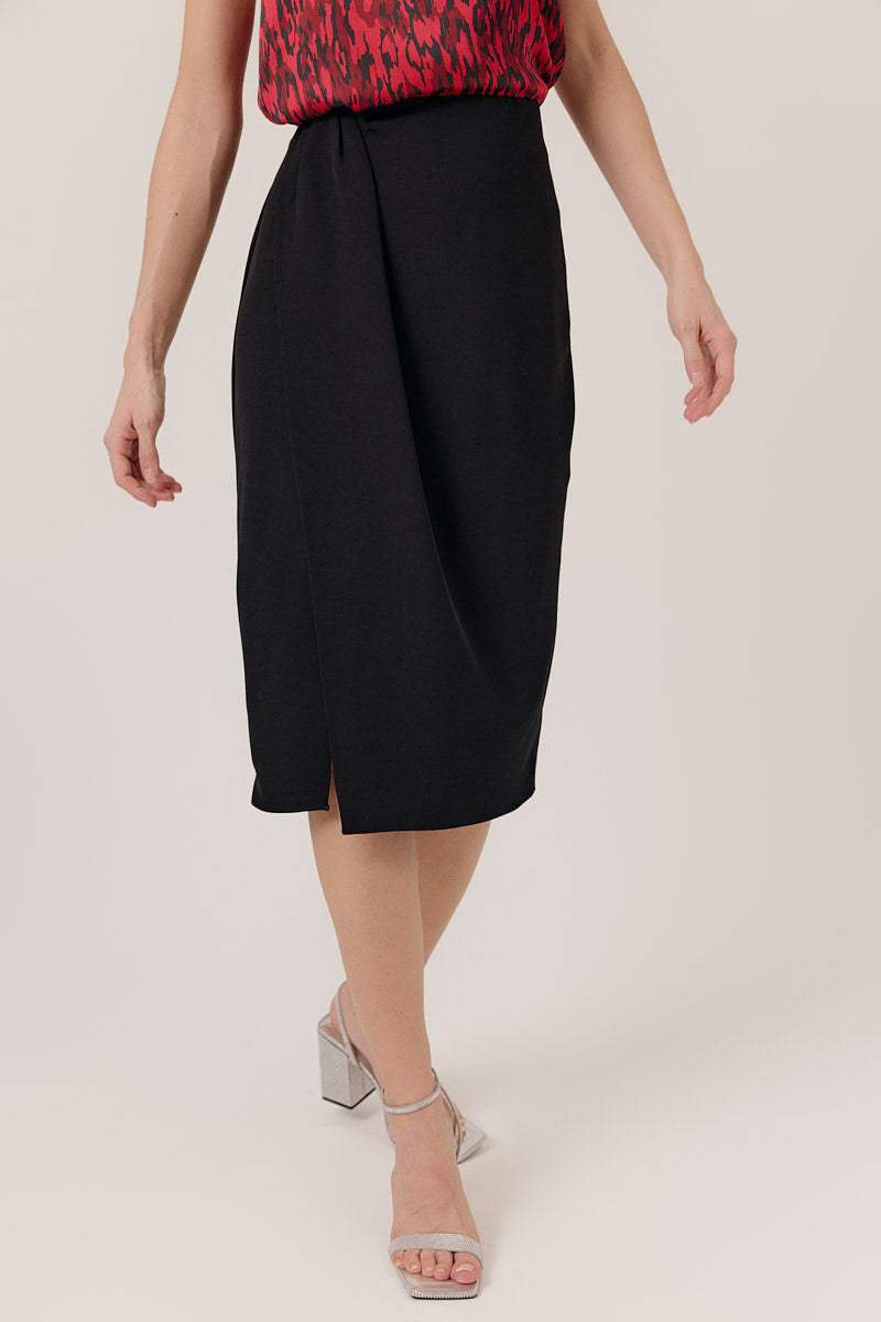 Jupe portefeuille satinée au tombé fluide. Coupe midi élégante, facile à porter du jour au soir.