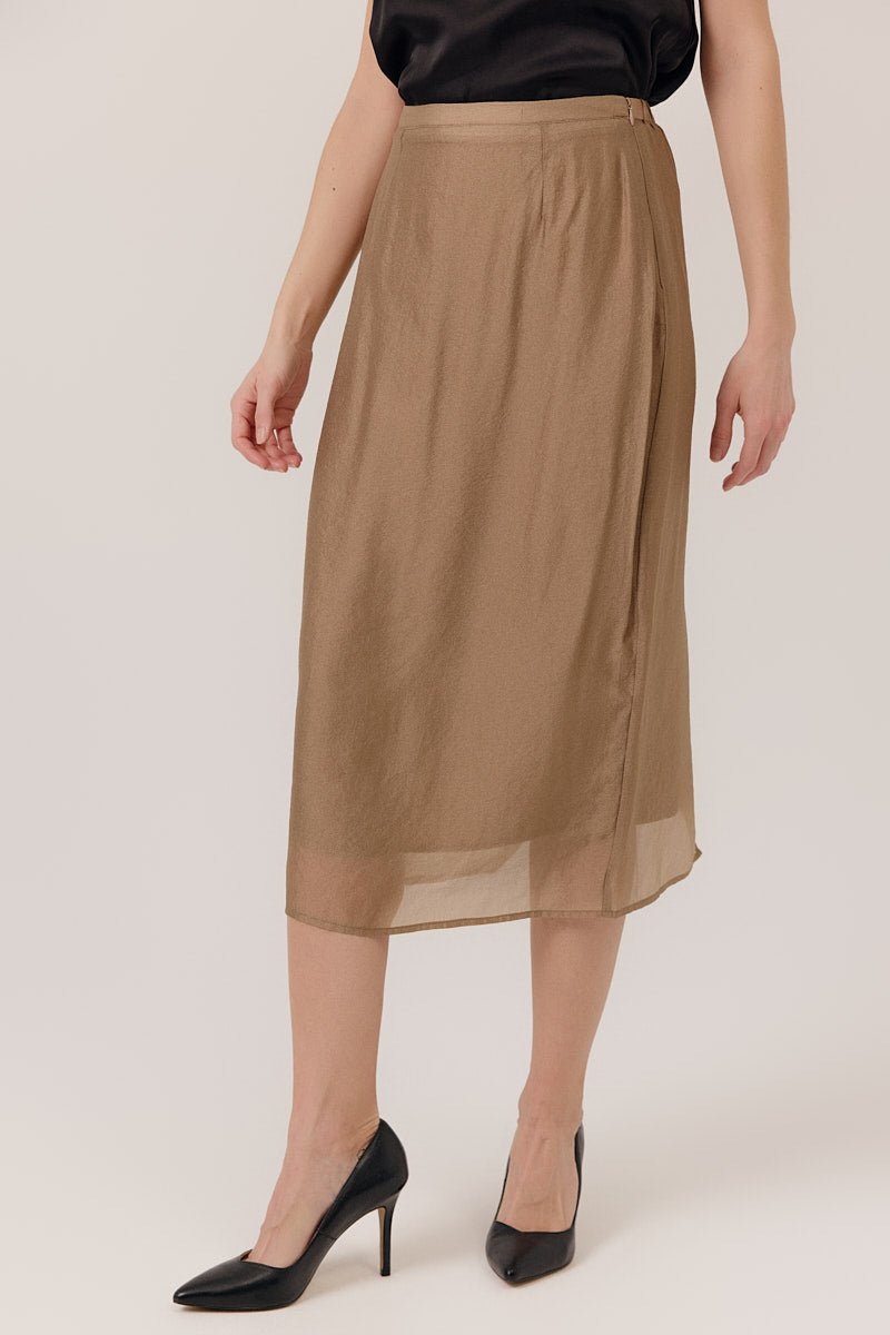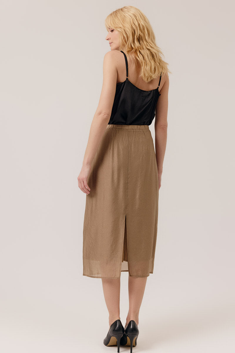 Jupe midi plissée à la texture fluide et ceinture intégrée. Une pièce chic au tomber impeccable.