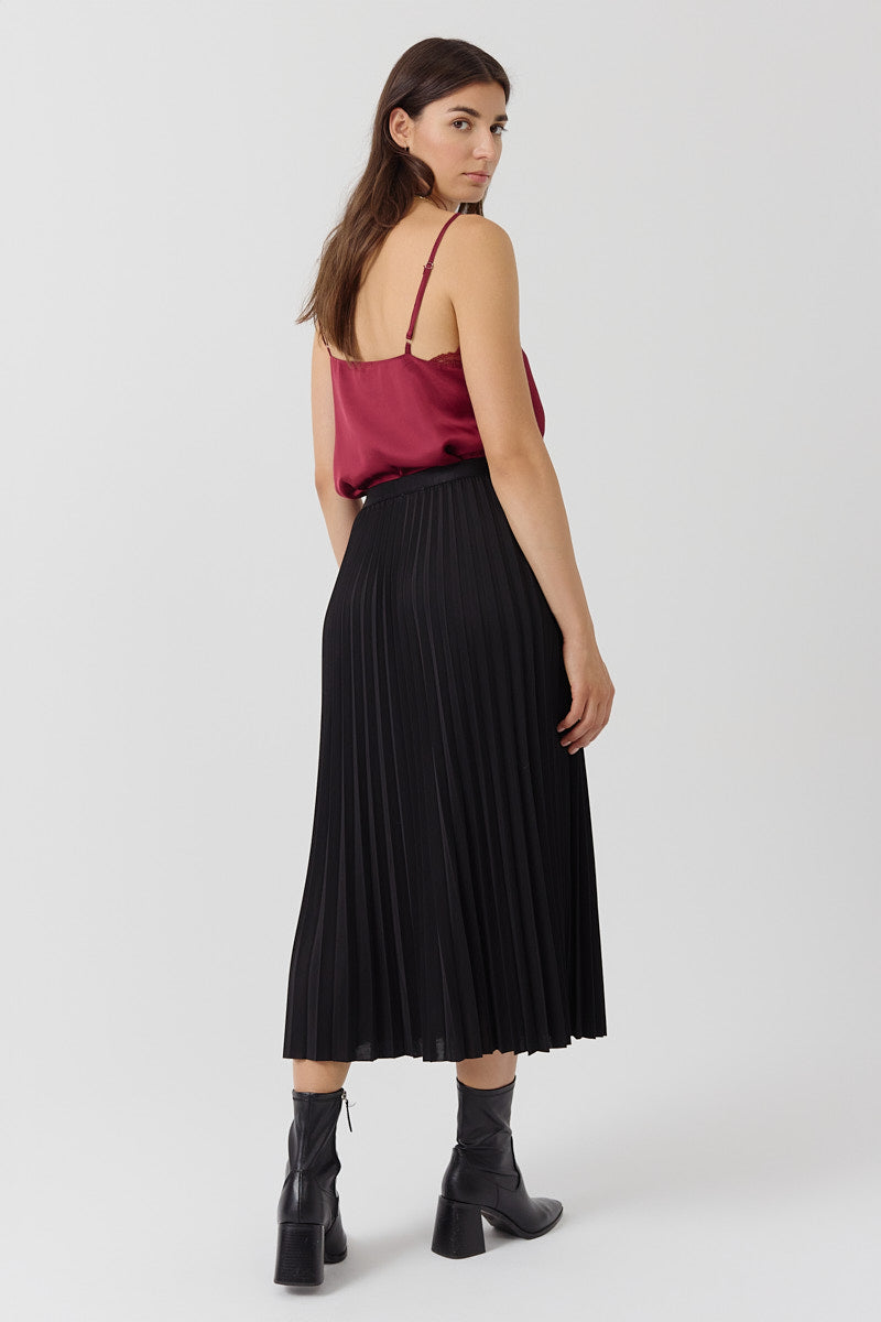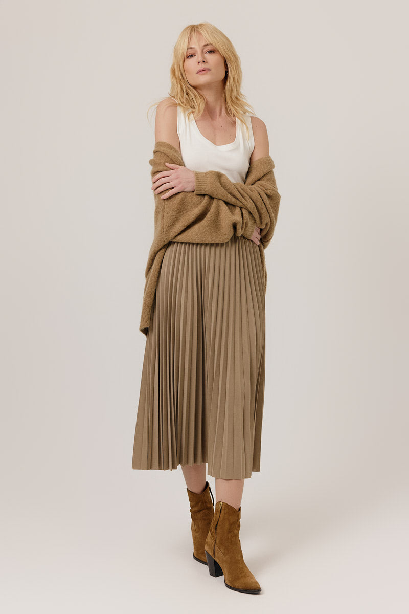 Jupe midi plissée, coupe fluide et tombé léger. Sa taille élastiquée assure un confort optimal tout en soulignant délicatement la silhouette. Idéale pour un look féminin et intemporel.