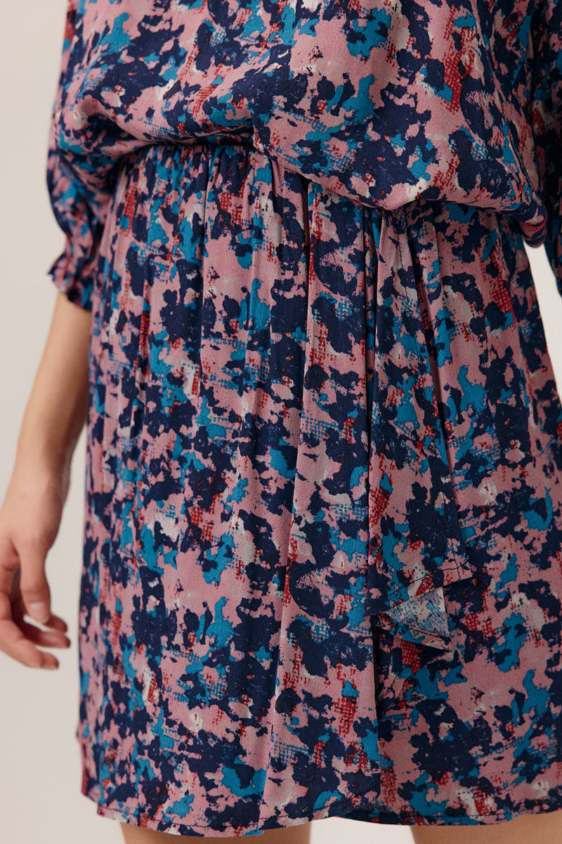 Jupe courte à imprimé abstrait dans les tons bleu marine, rose et turquoise. Coupe fluide avec taille élastiquée, pour une silhouette féminine et confortable. Parfaite pour une touche de couleur dans vos looks du quotidien.