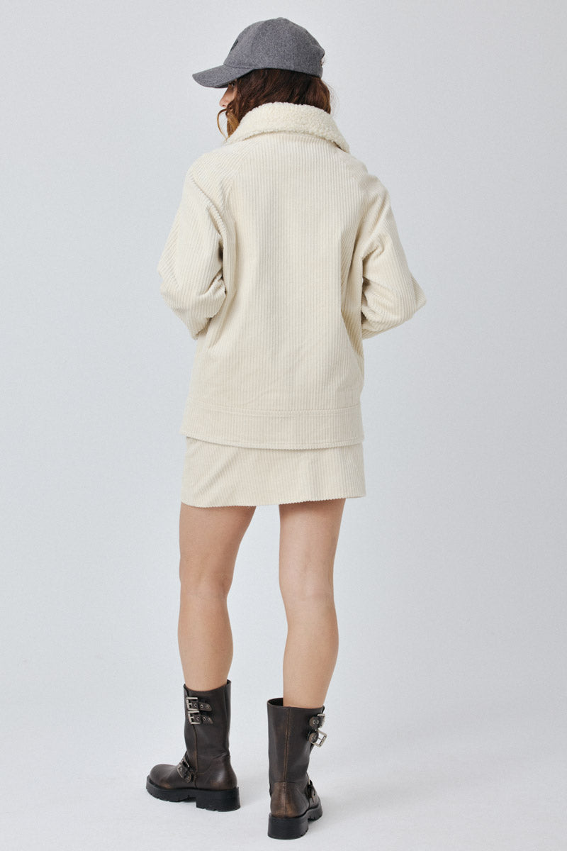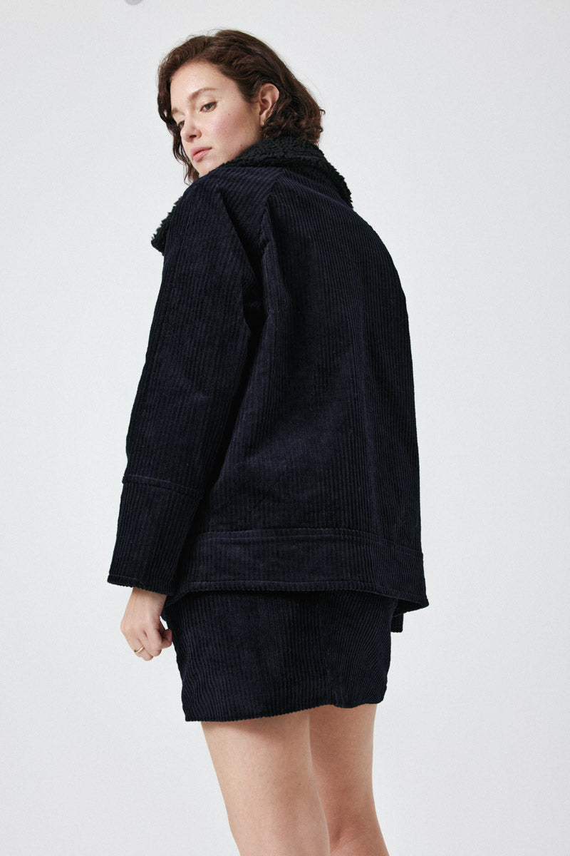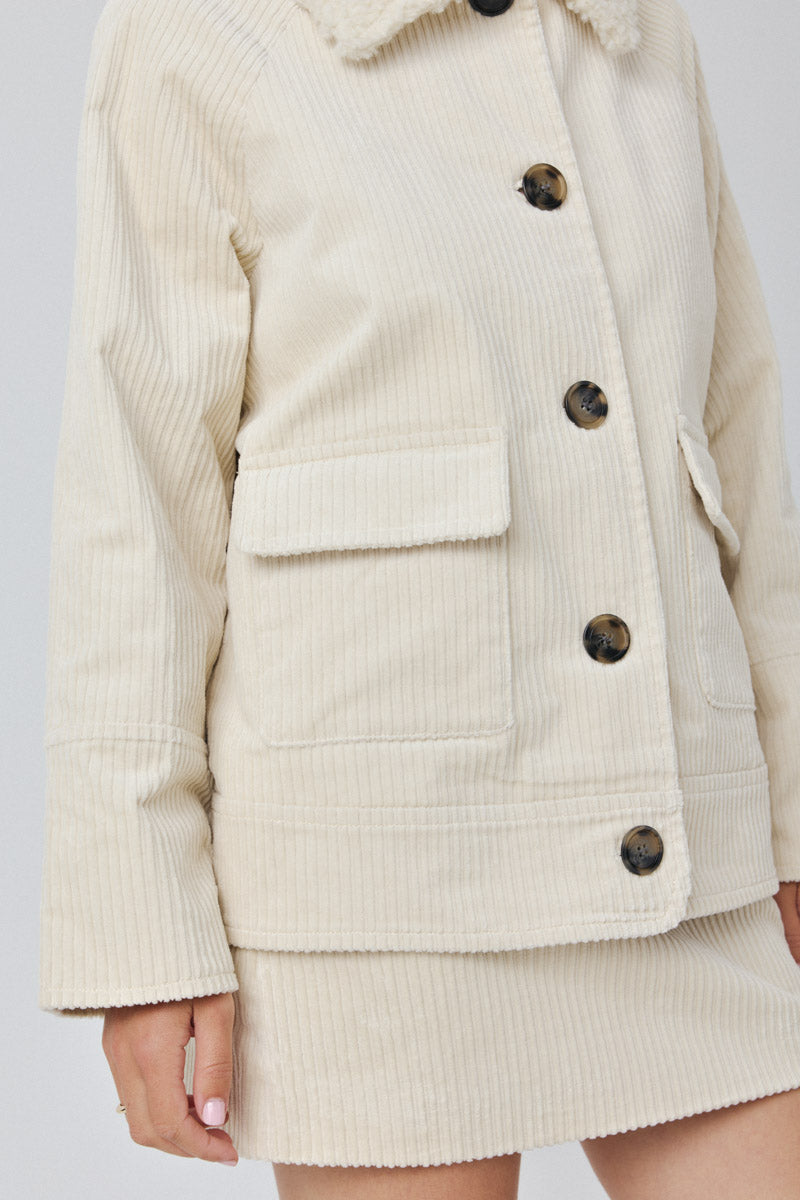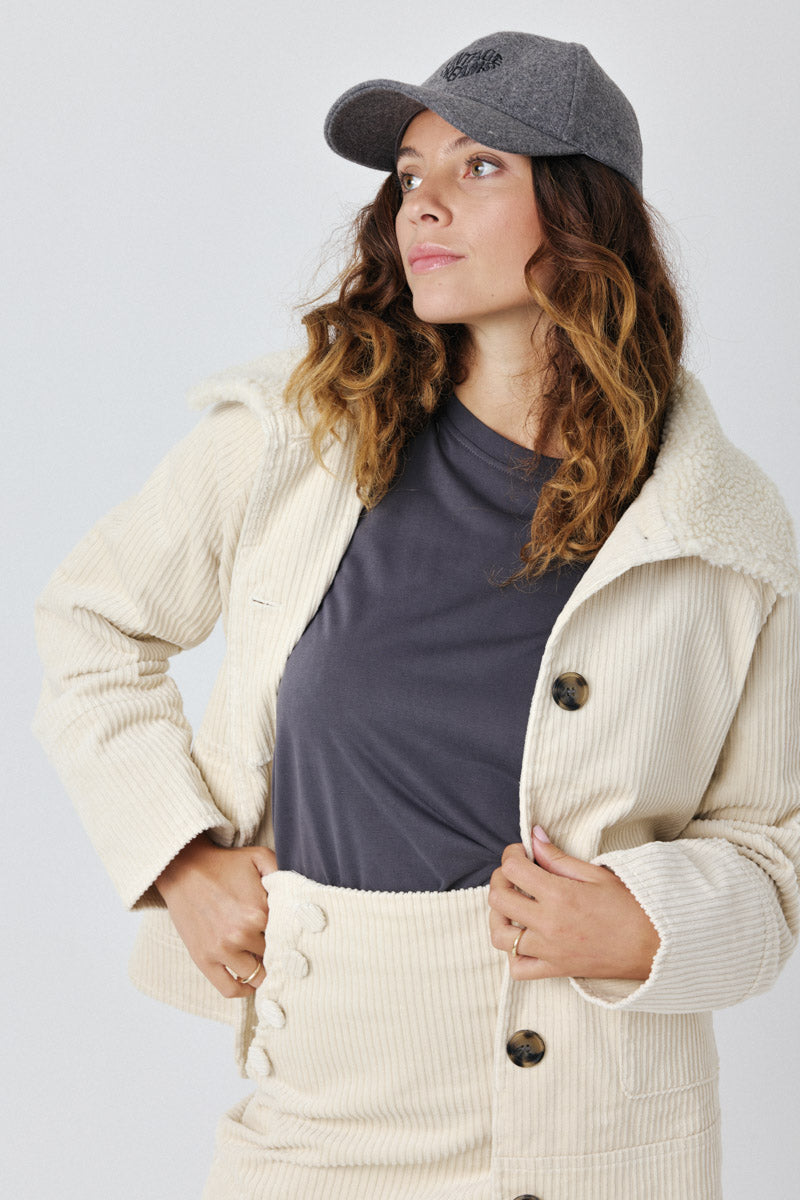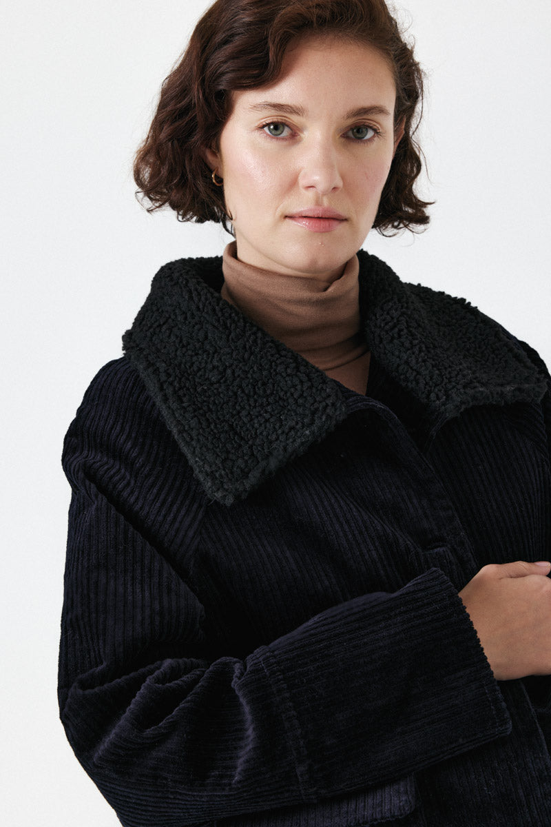Ce manteau en velours côtelé offre confort et élégance, avec un col en fausse fourrure et de grands boutons. Il possède deux poches avant pratiques et une coupe droite pour un style décontracté.