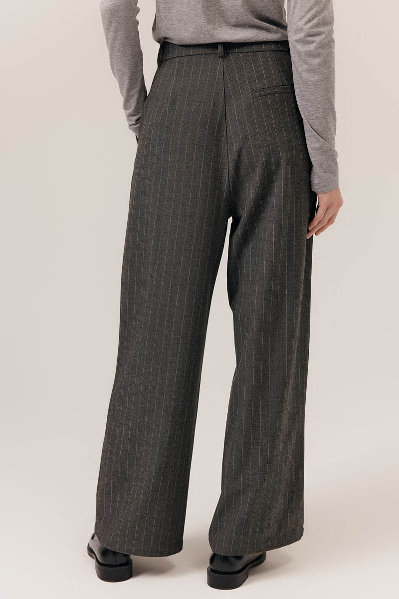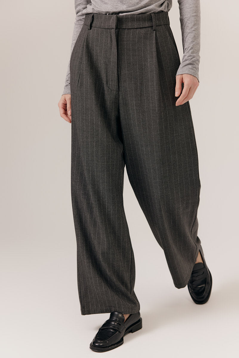 Pantalon large gris à fines rayures verticales, coupe ample et taille haute. Style tailleur revisité, il allie élégance et confort avec une touche moderne. Idéal pour un look chic et décontracté.
