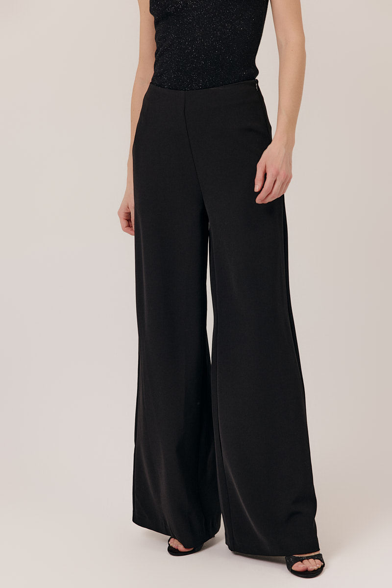 Pantalon noir fluide à jambes larges. Sa coupe élégante et sa taille haute allongent la silhouette, tandis que le tissu souple assure un tombé parfait. Idéal pour une tenue de soirée chic ou un look sophistiqué au quotidien.