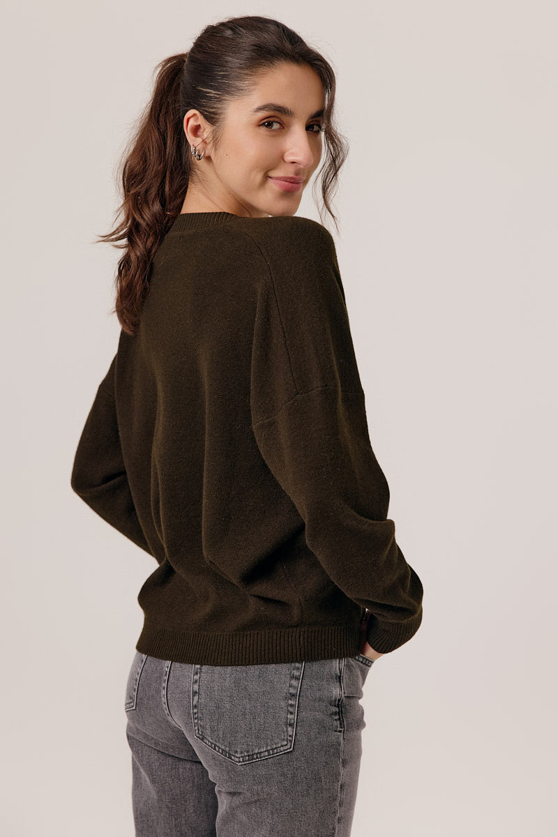 Pull col V en maille fine, à manches longues. Encolure en V côtelée, coupe droite légèrement ample. Finitions bord-côte aux poignets et à la base. Matière douce au toucher avec léger effet duveteux.