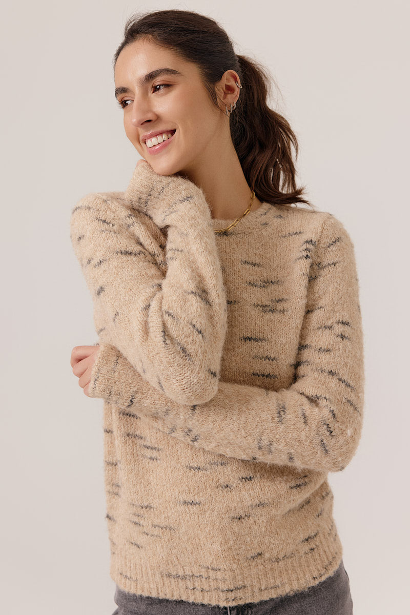 Pull à la coupe droite et au col rond, confectionné dans une maille douce et moelleuse. Son motif discret et sa finition côtelée aux poignets et à la base apportent confort et style pour un look décontracté et chaleureux.