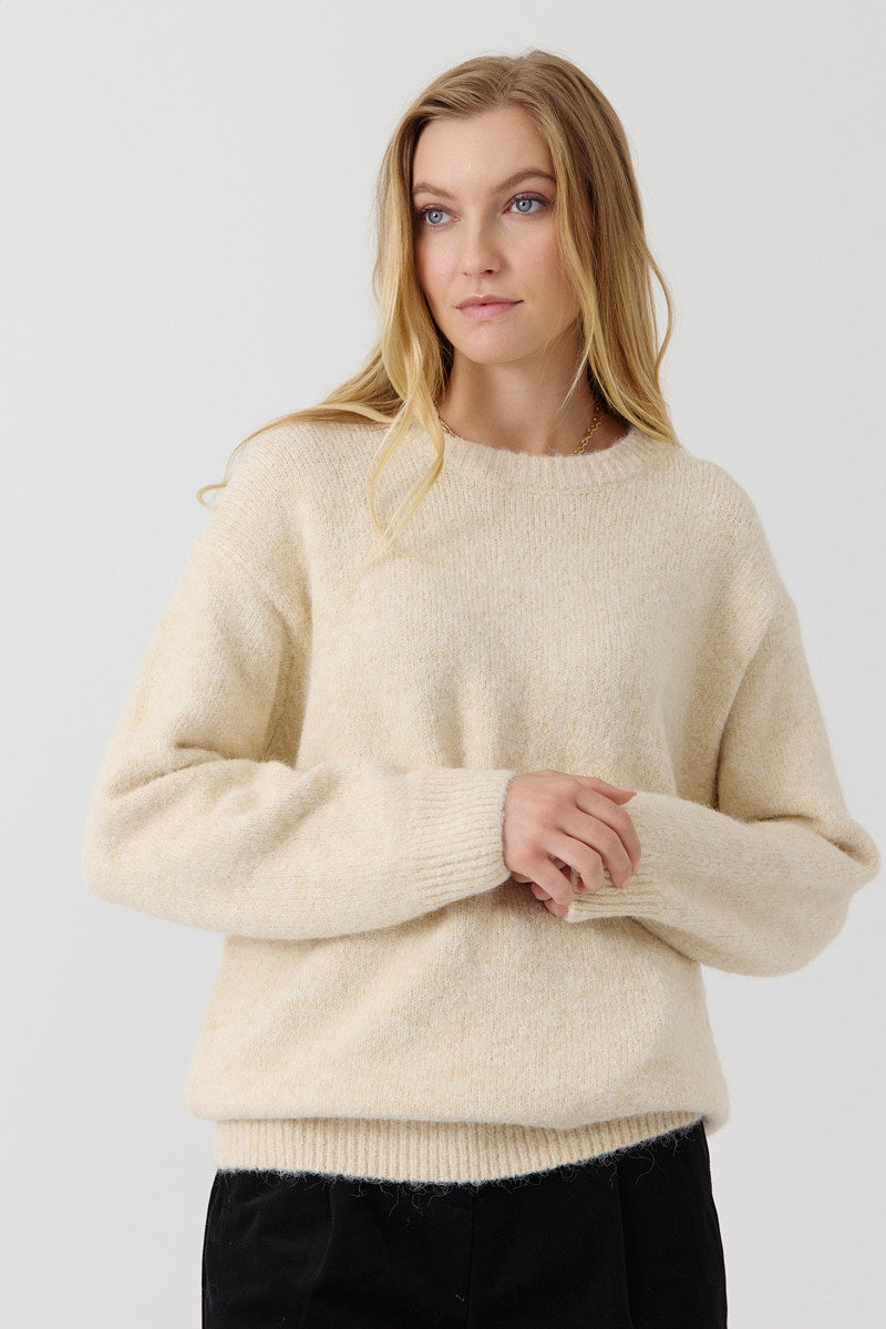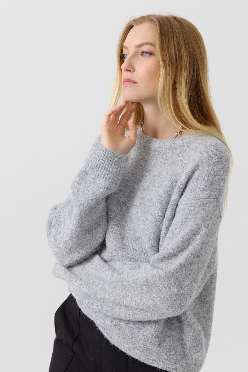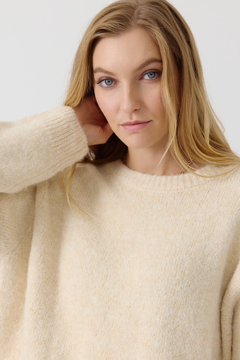 Pull en maille bouclée au toucher moelleux, coupe droite, col rond et manches longues. Finition en bord-côte sur le col, les manches et le bas.
