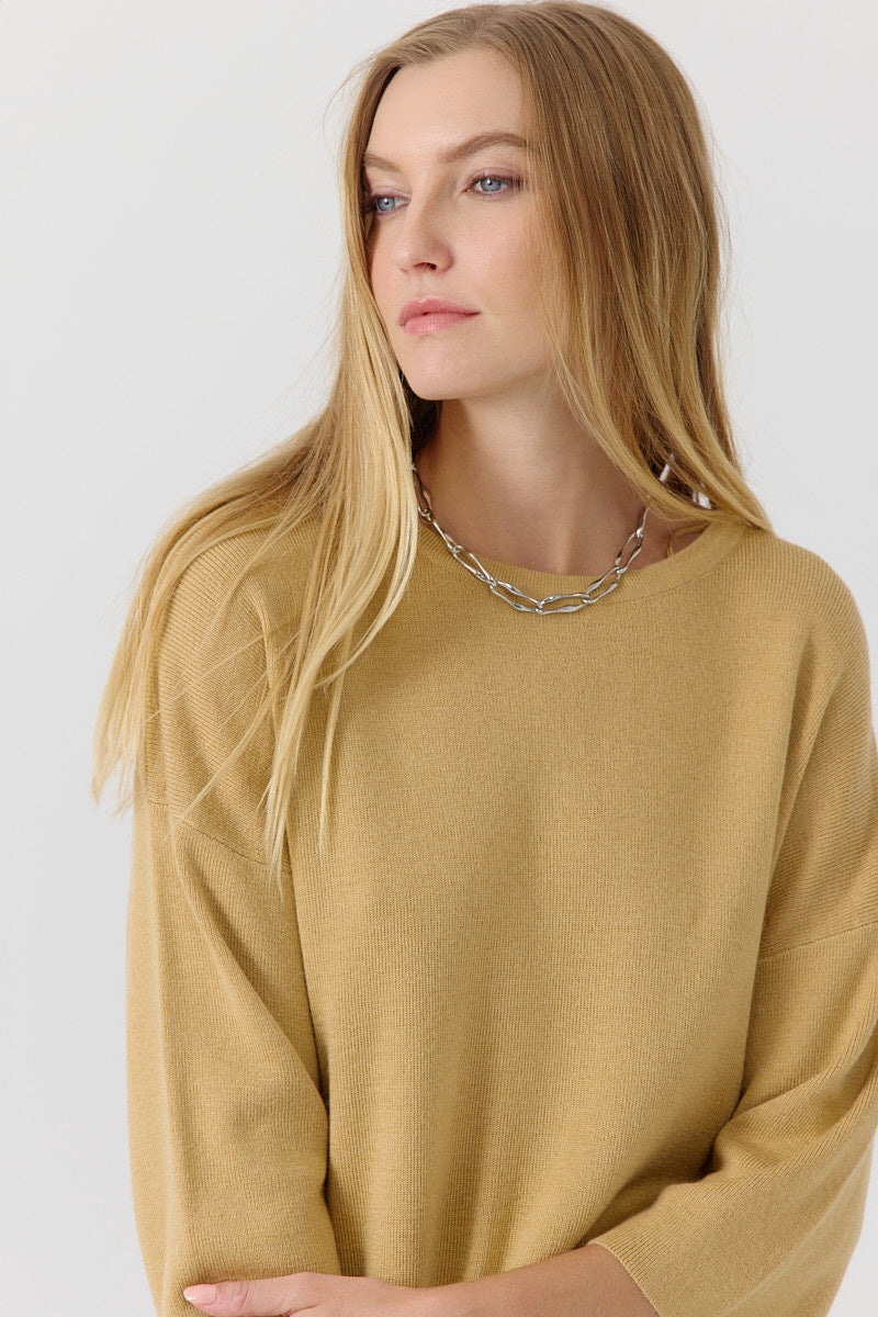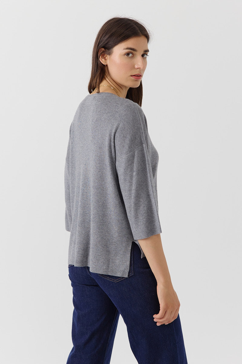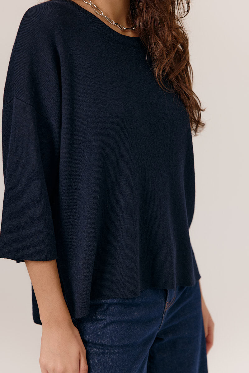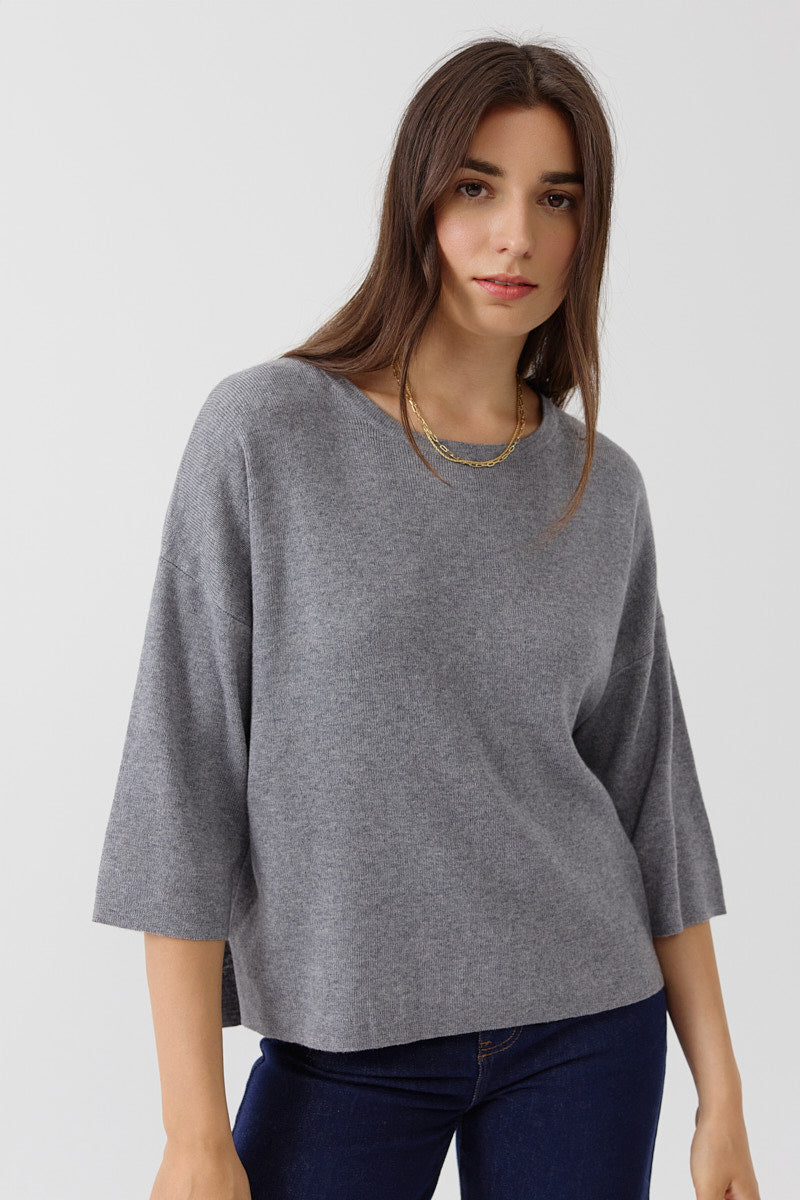 Pull col rond à manches trois-quarts. Coupe ample avec base droite. Tissu doux au toucher.