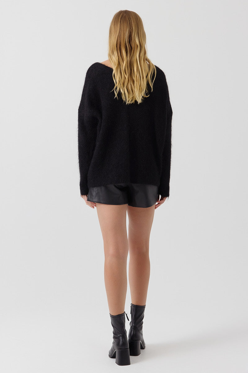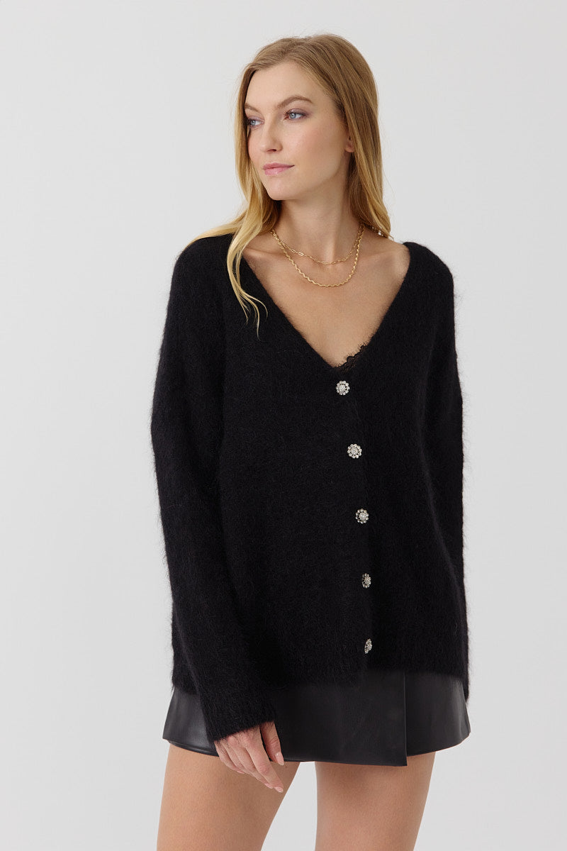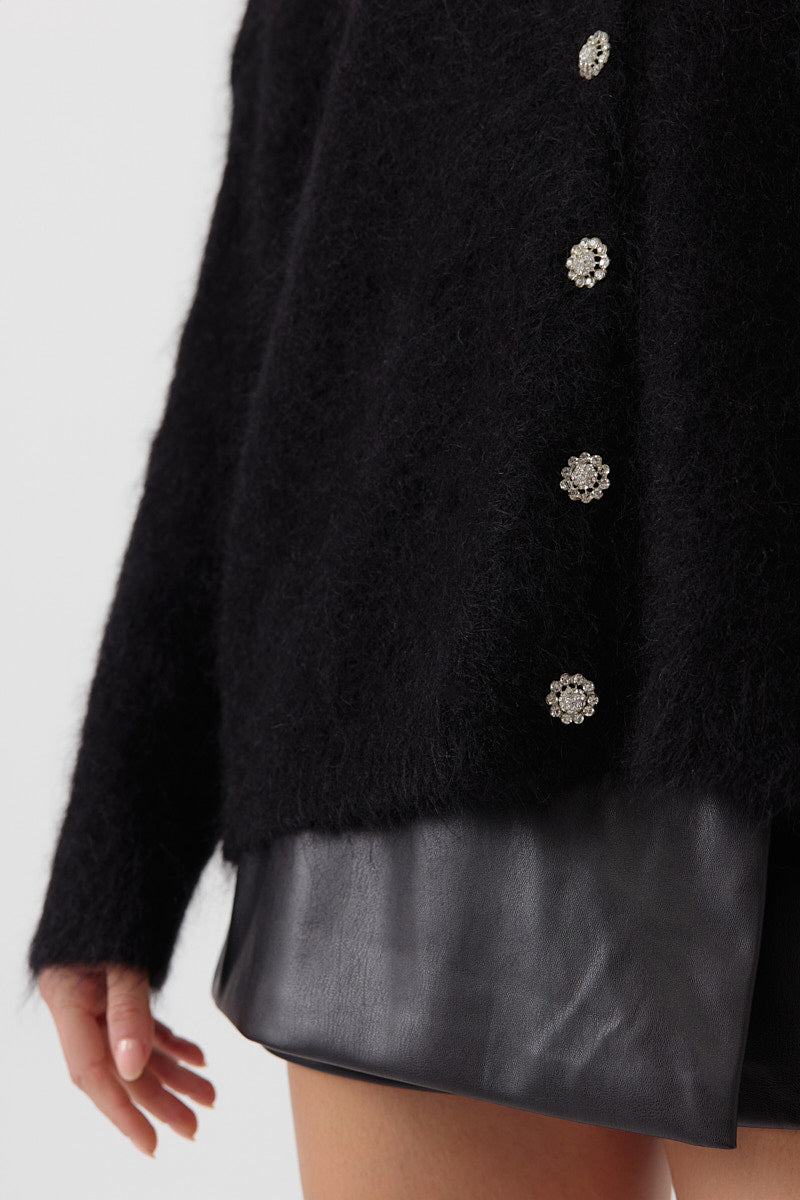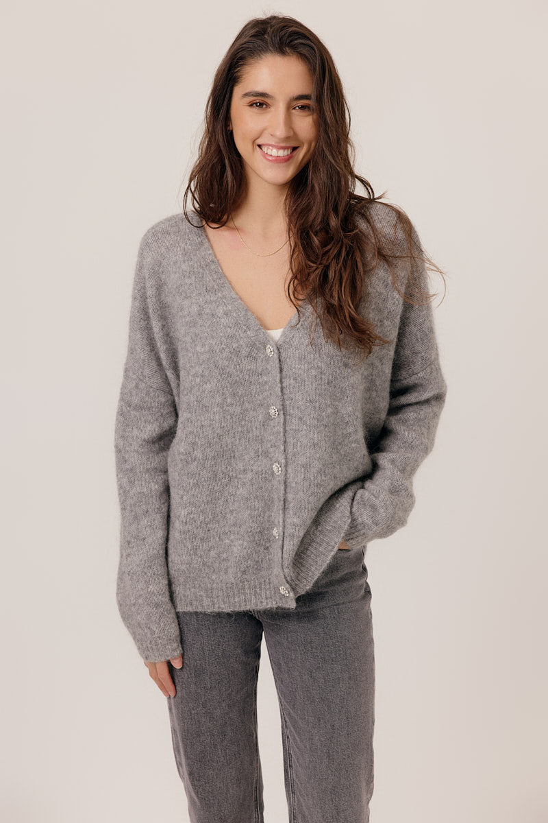 Gilet ample en maille duveteuse, boutonné, manches longues. À porter ouvert ou fermé.