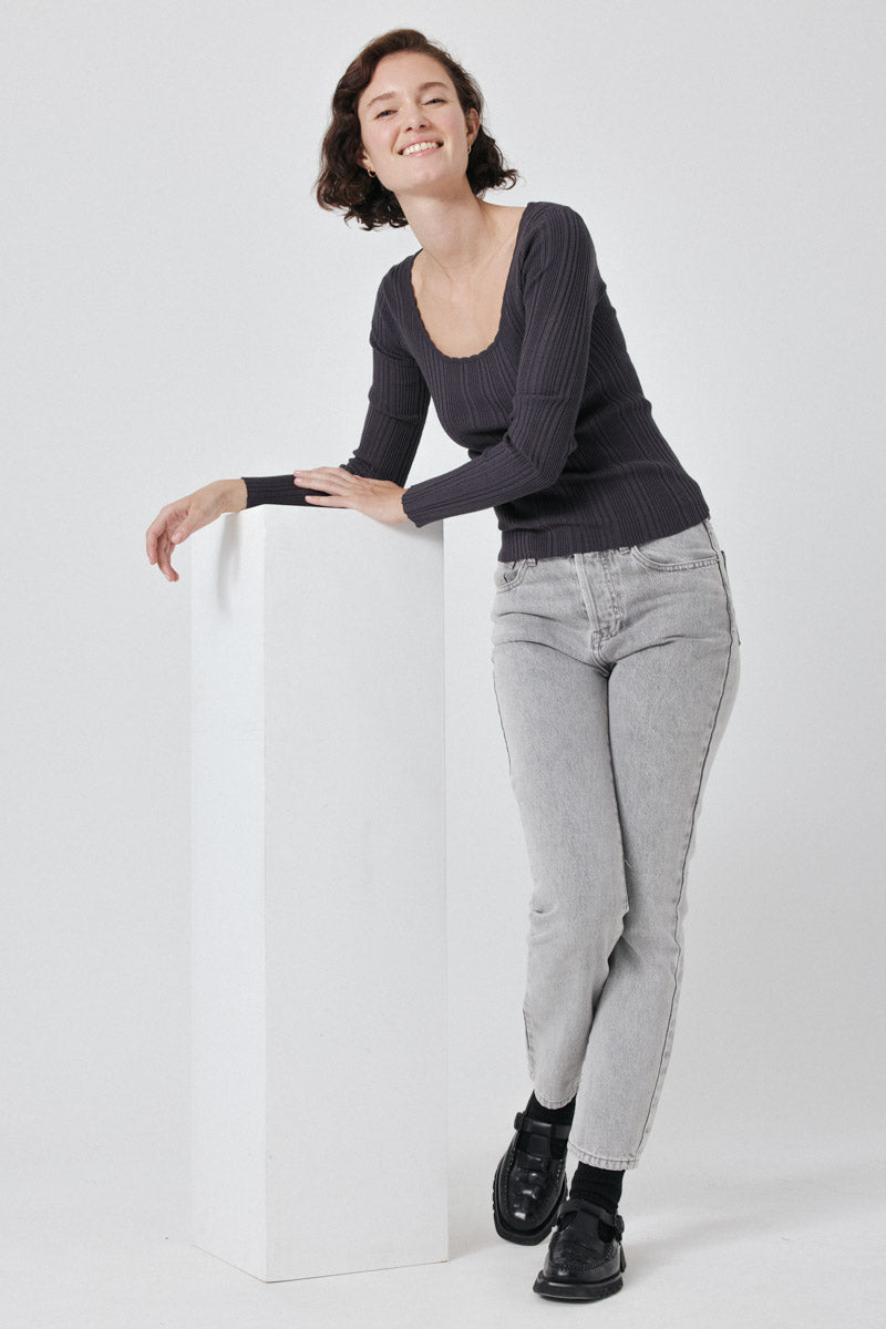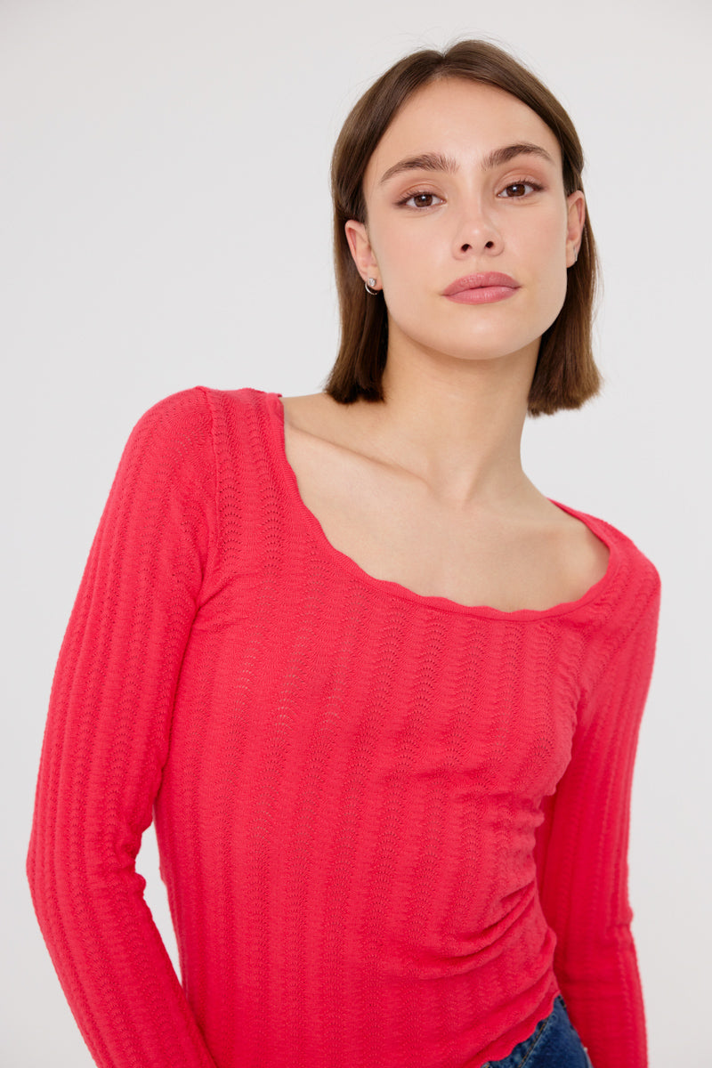 Pull en maille ajourée à la coupe près du corps. Son décolleté carré et ses finitions ondulées apportent une touche féminine et élégante.