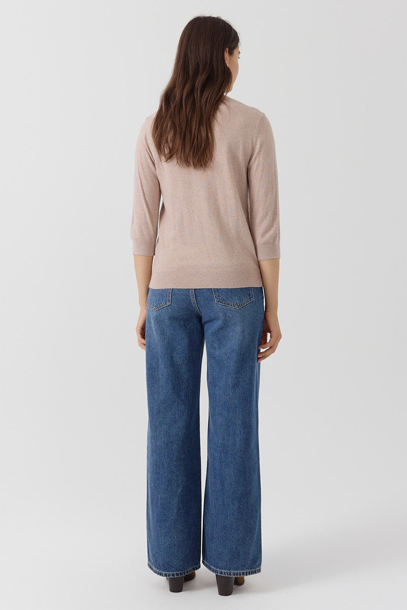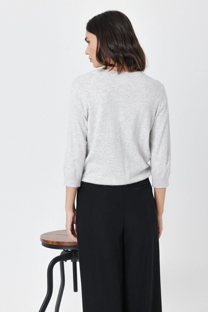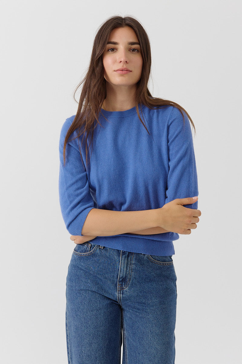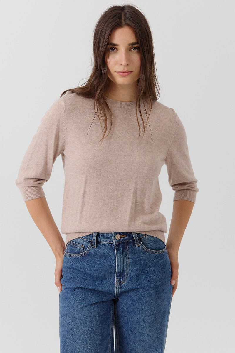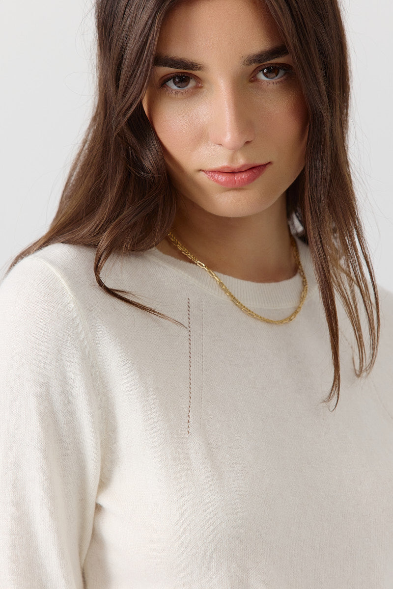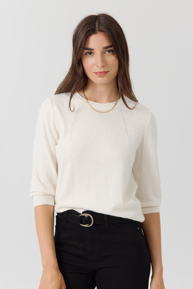 Pull manches 3/4 à col rond. Coupe droite, en maille fine. Détails discrets de lignes verticales pour structurer la silhouette. Coupe normale.