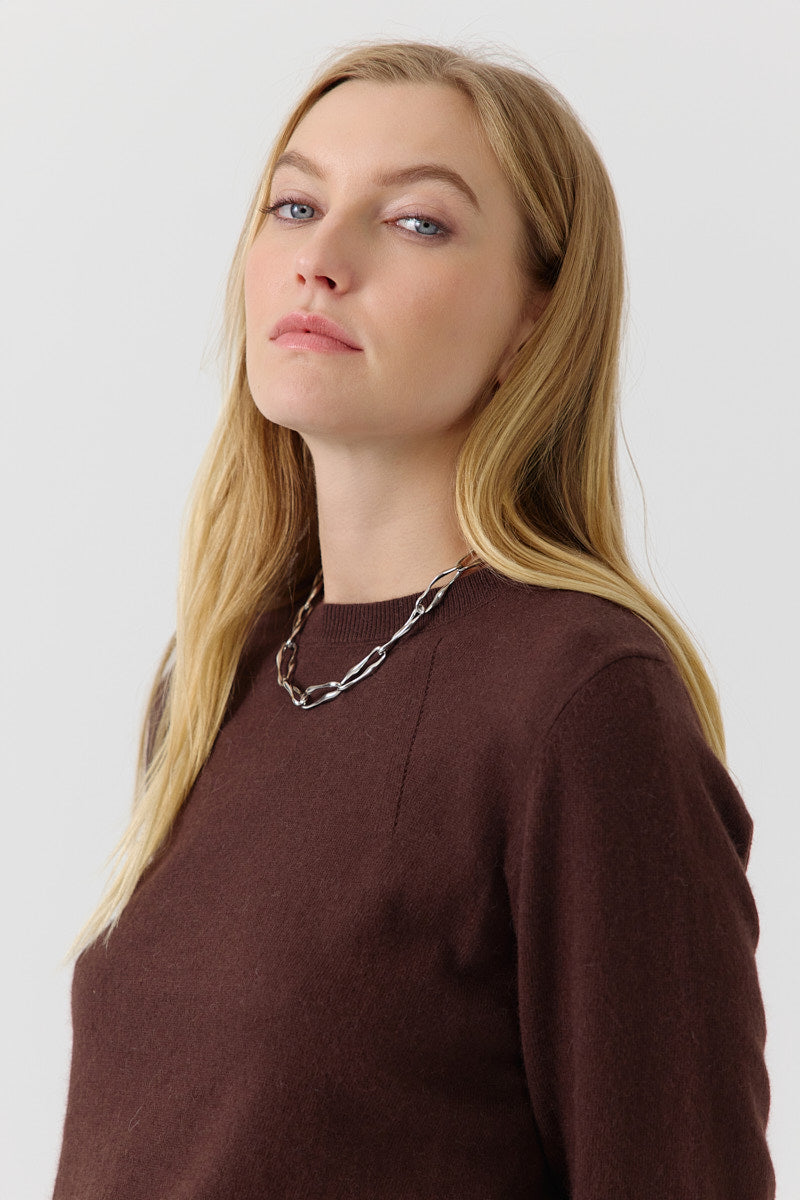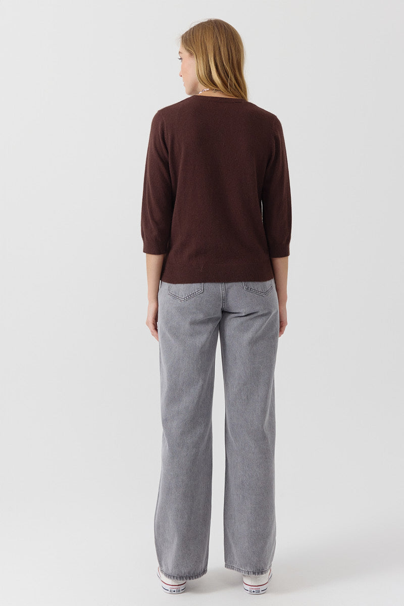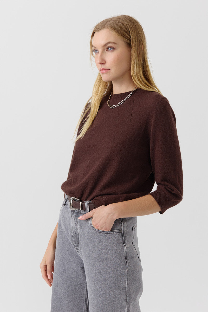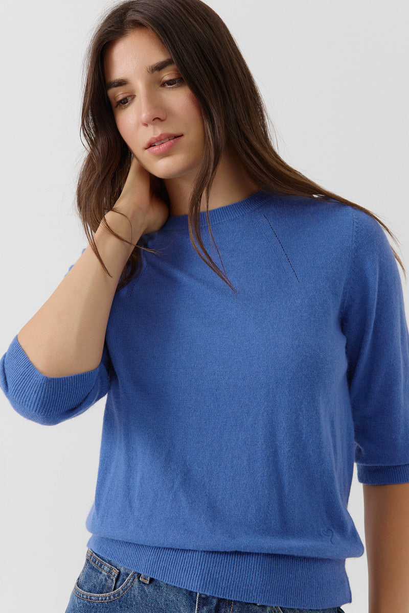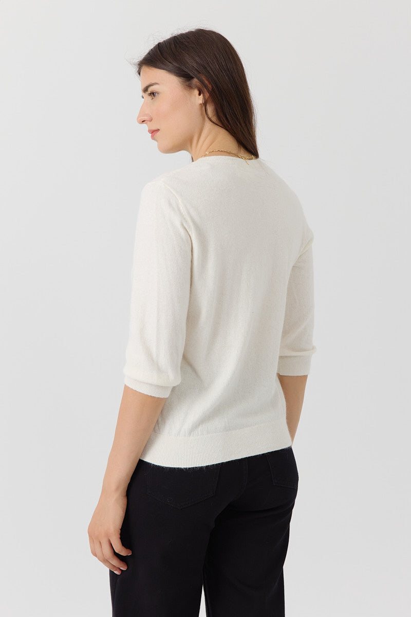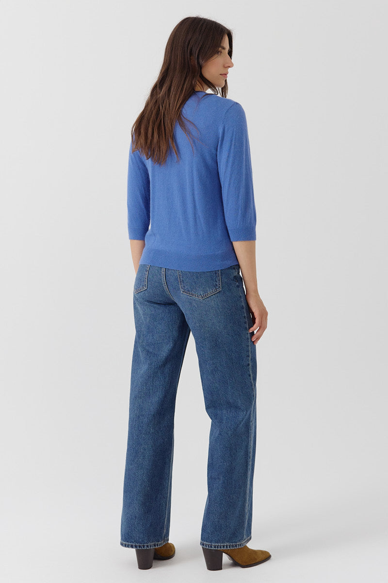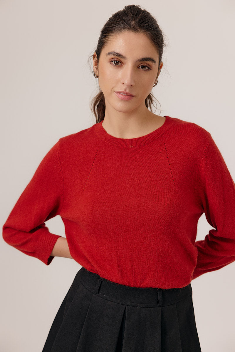 Pull manches 3/4 à col rond. Coupe droite, en maille fine. Détails discrets de lignes verticales pour structurer la silhouette. Coupe normale.