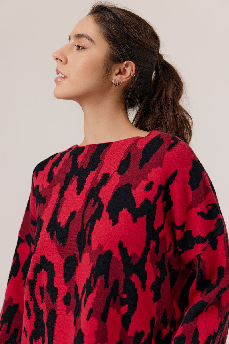 Pull ample à col bateau, imprimé graphique contrasté et manches longues évasées. Un modèle qui combine audace et confort.