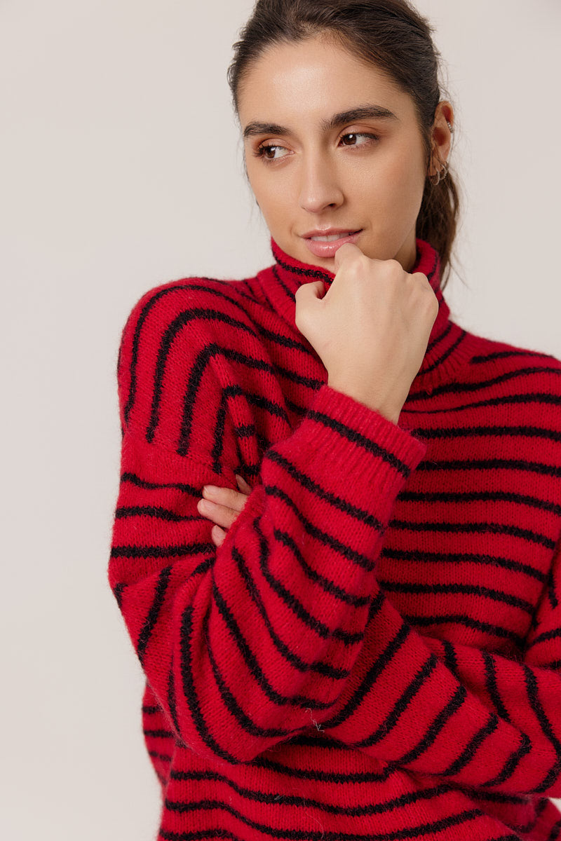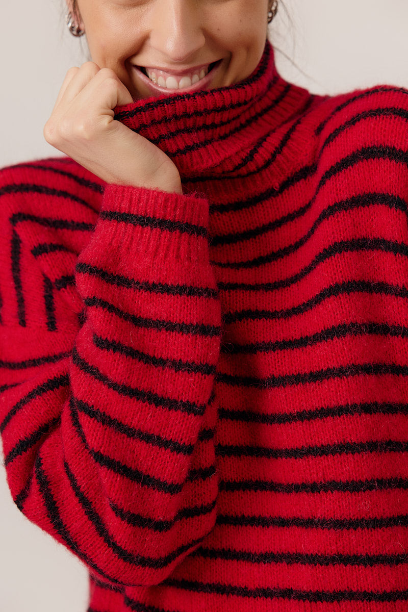 Pull rayé à col roulé en maille légère et douce, coupe droite confortable. L’indispensable de saison pour une touche graphique au quotidien.