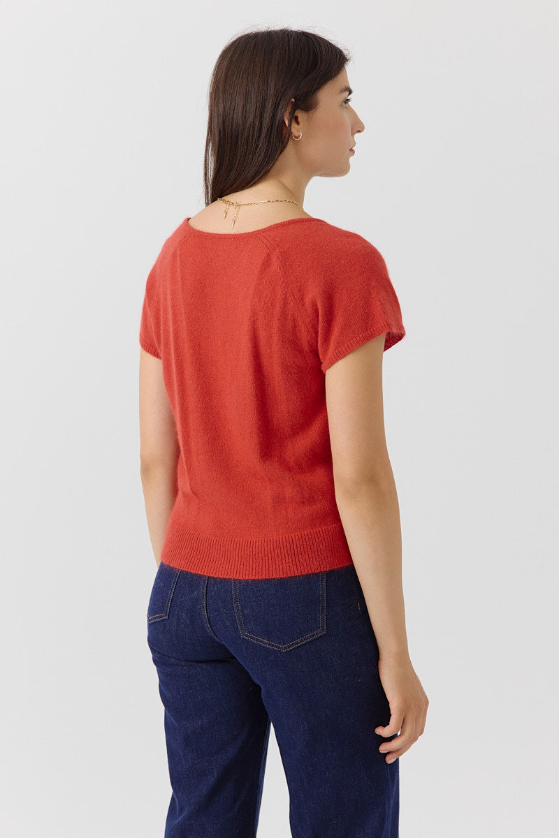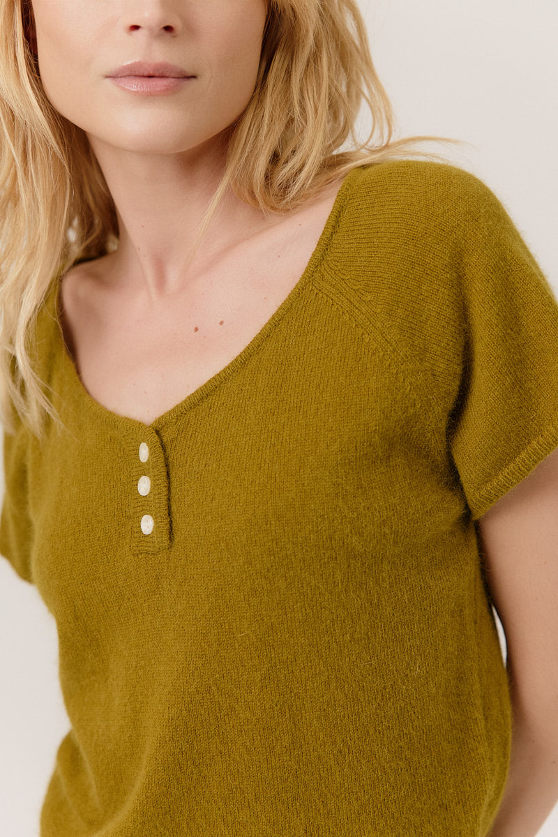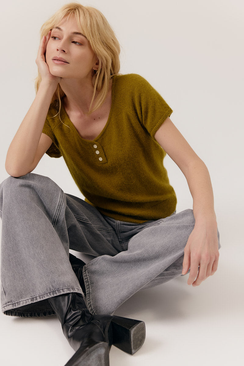 Pull en maille fine à manches courtes, col rond boutonné. Une touche vintage à intégrer dans tous vos looks.