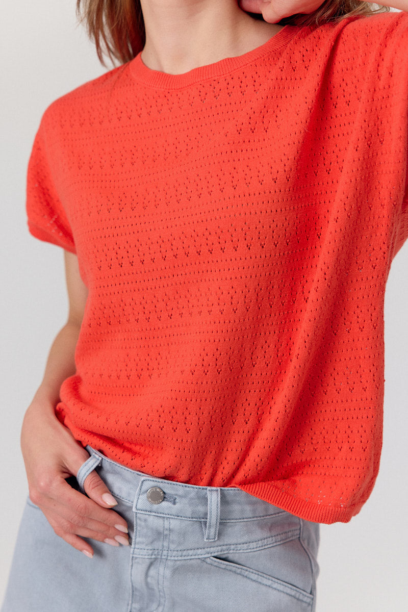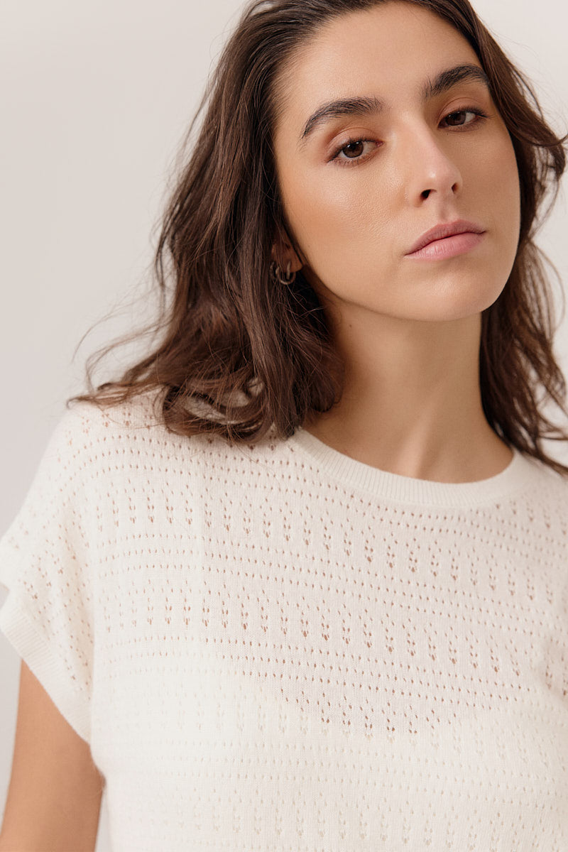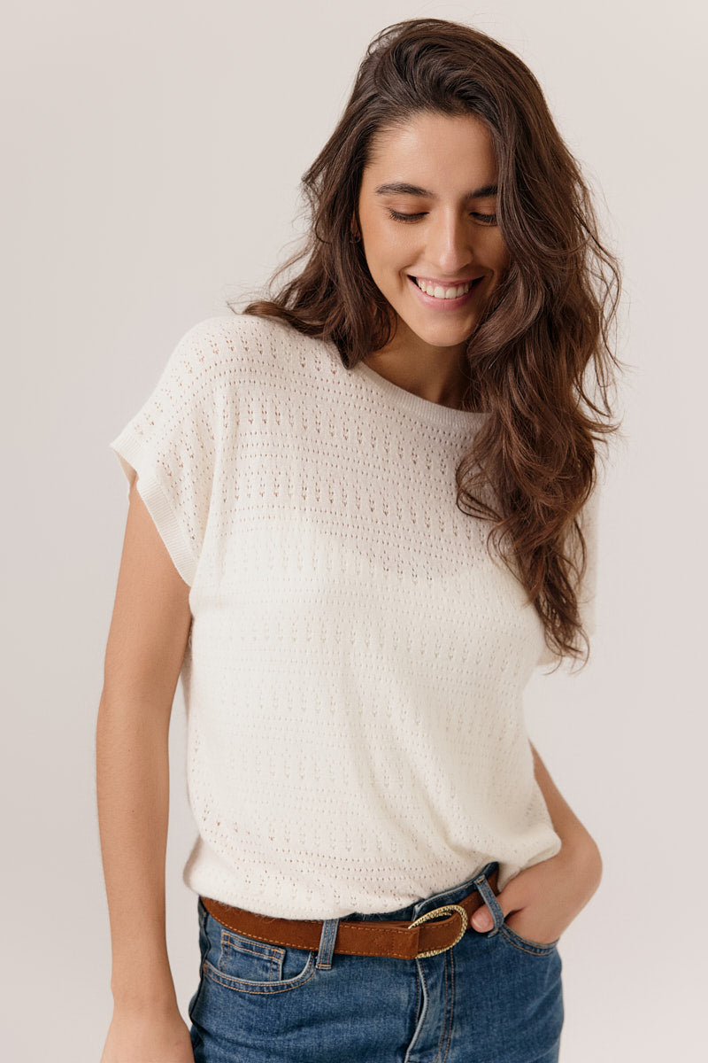 Top en maille fine, ajouré, coupe droite et fluide. Léger et confortable.