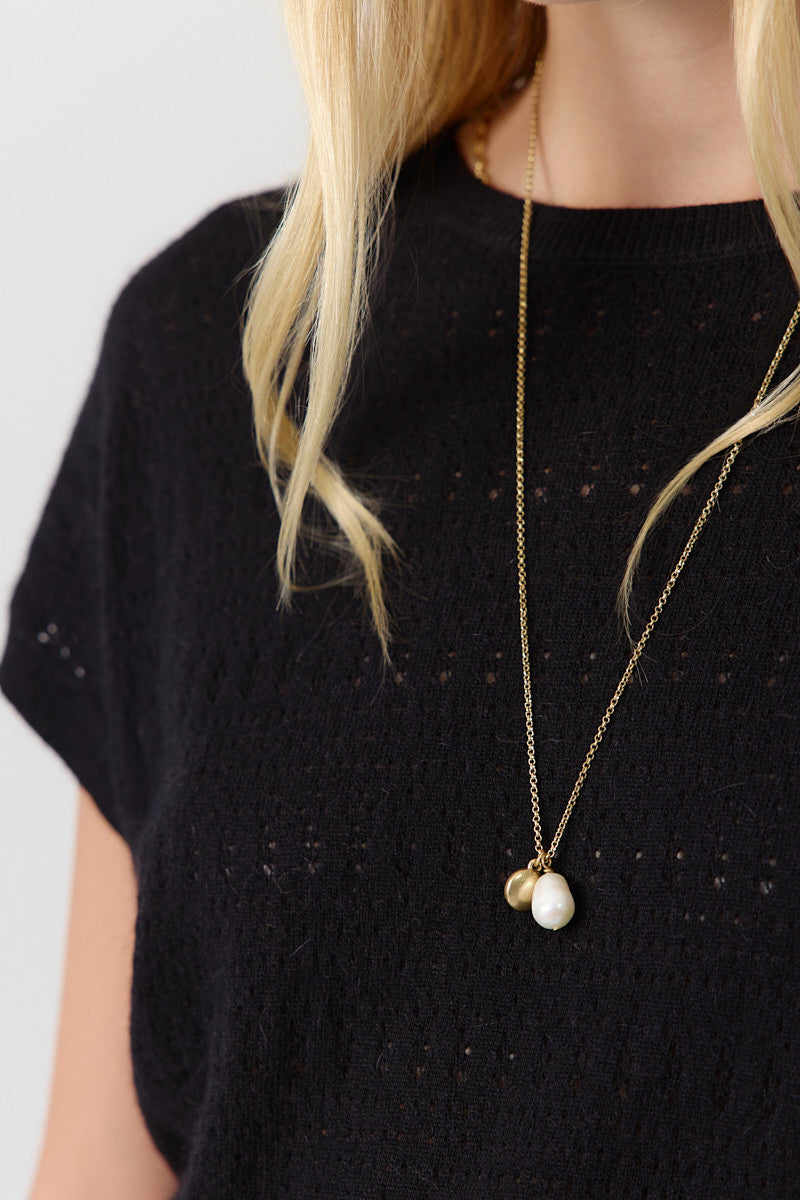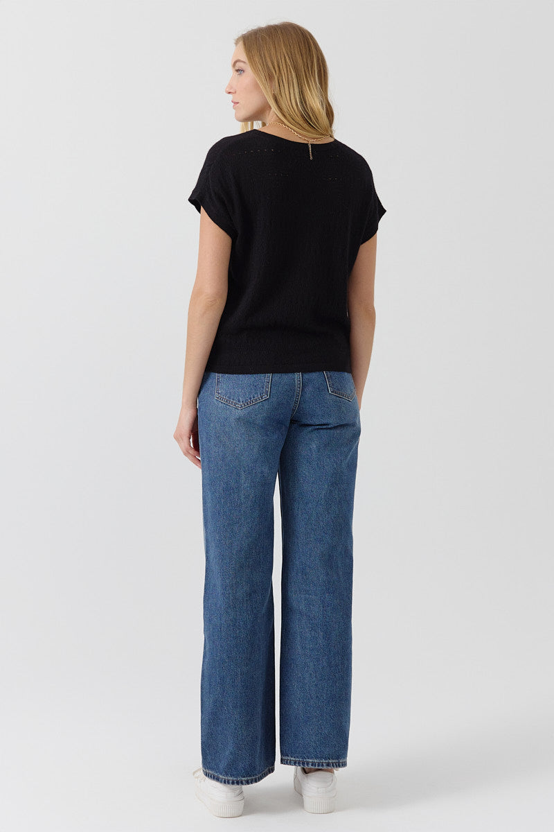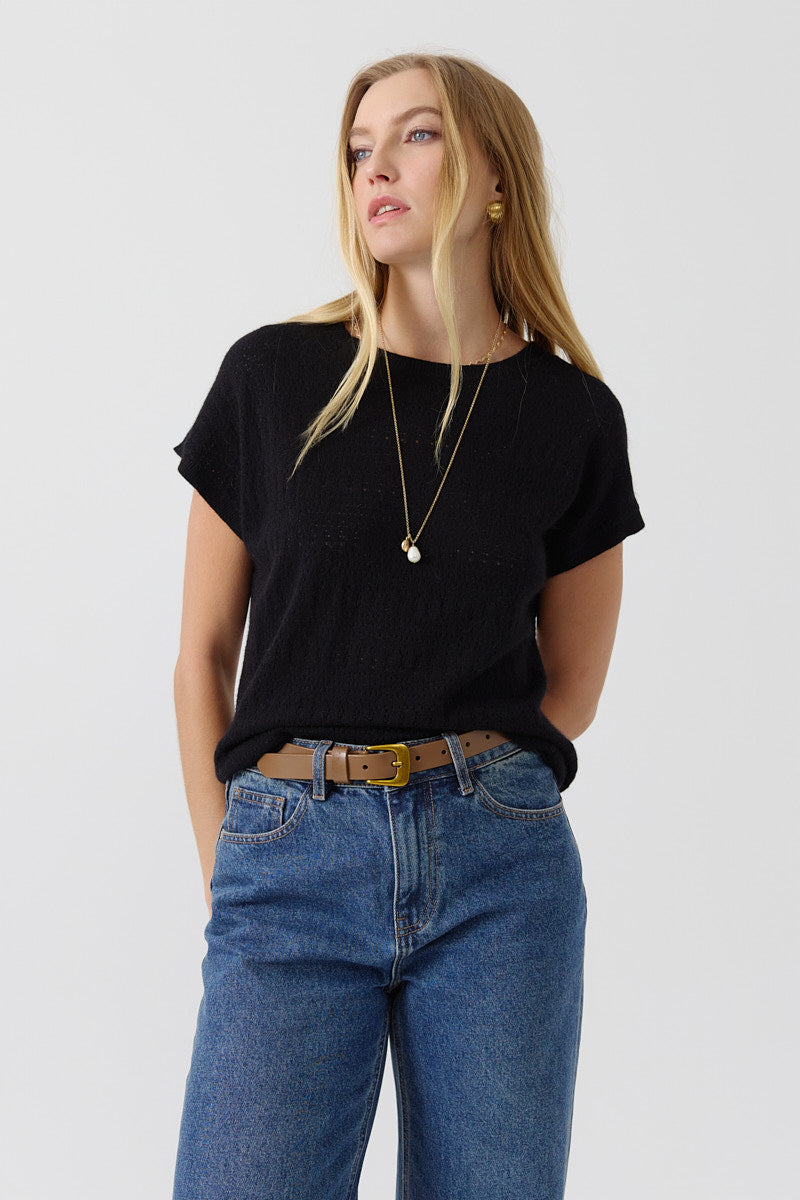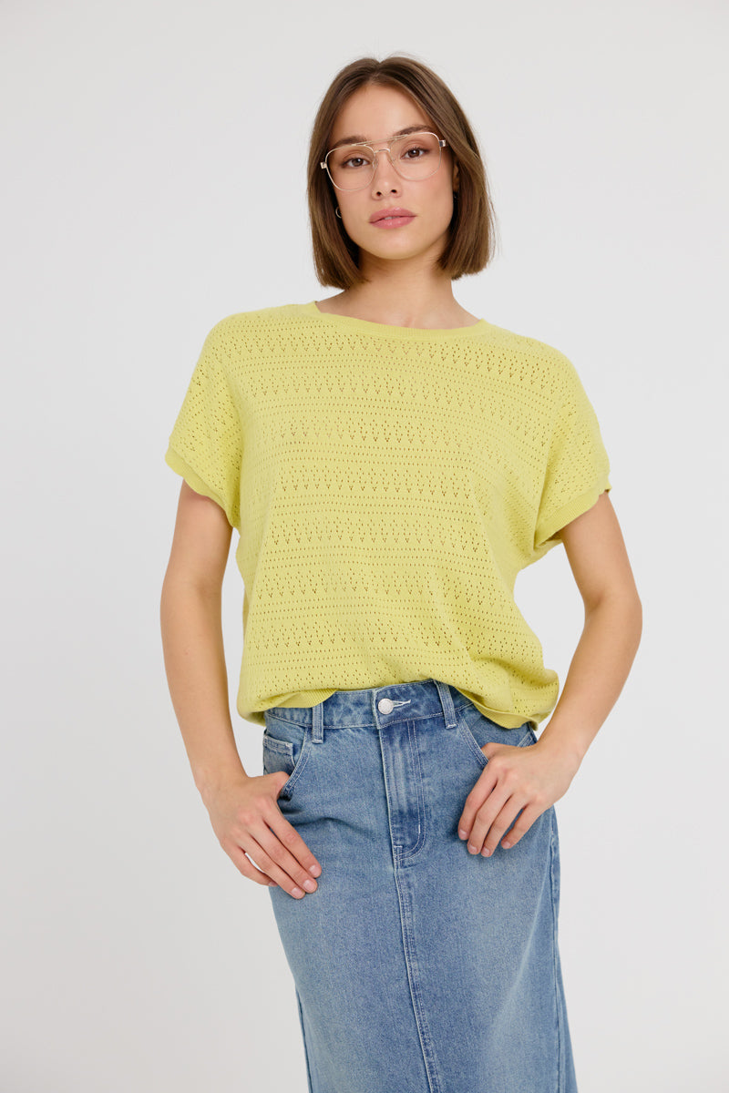 Top en maille fine, ajouré, coupe droite et fluide. Léger et confortable.