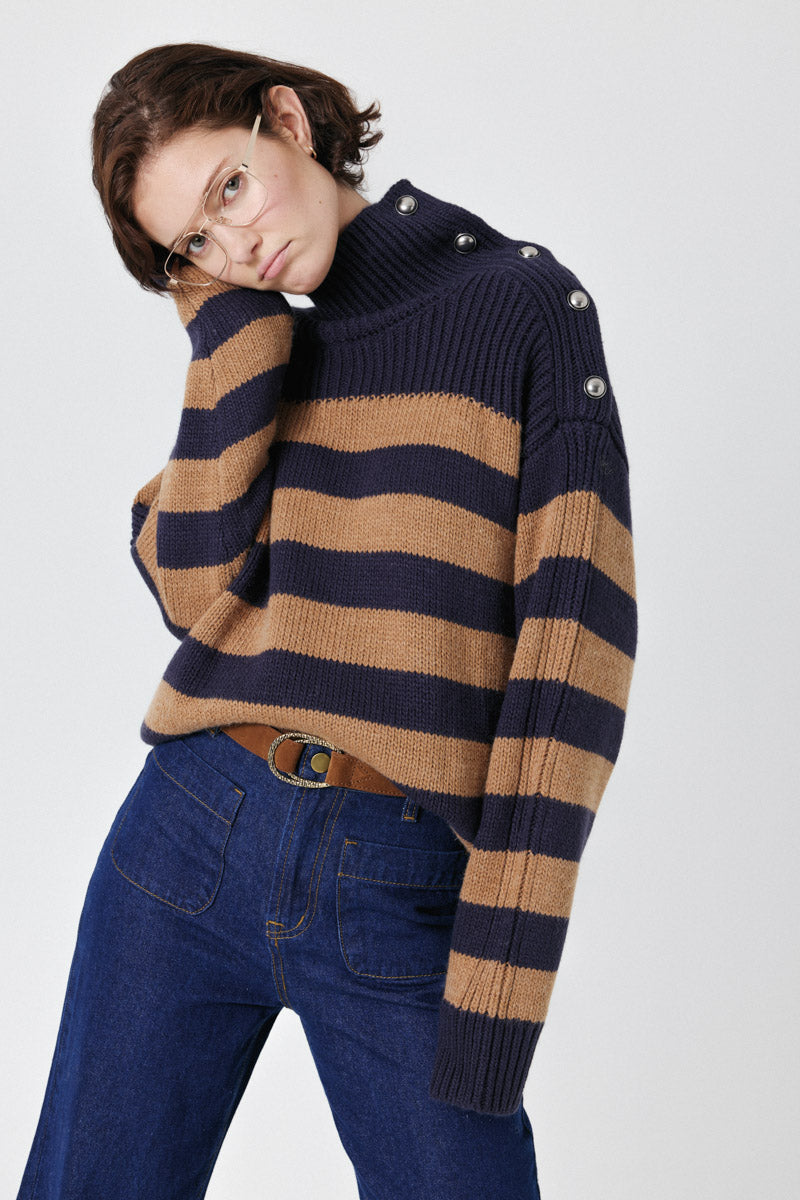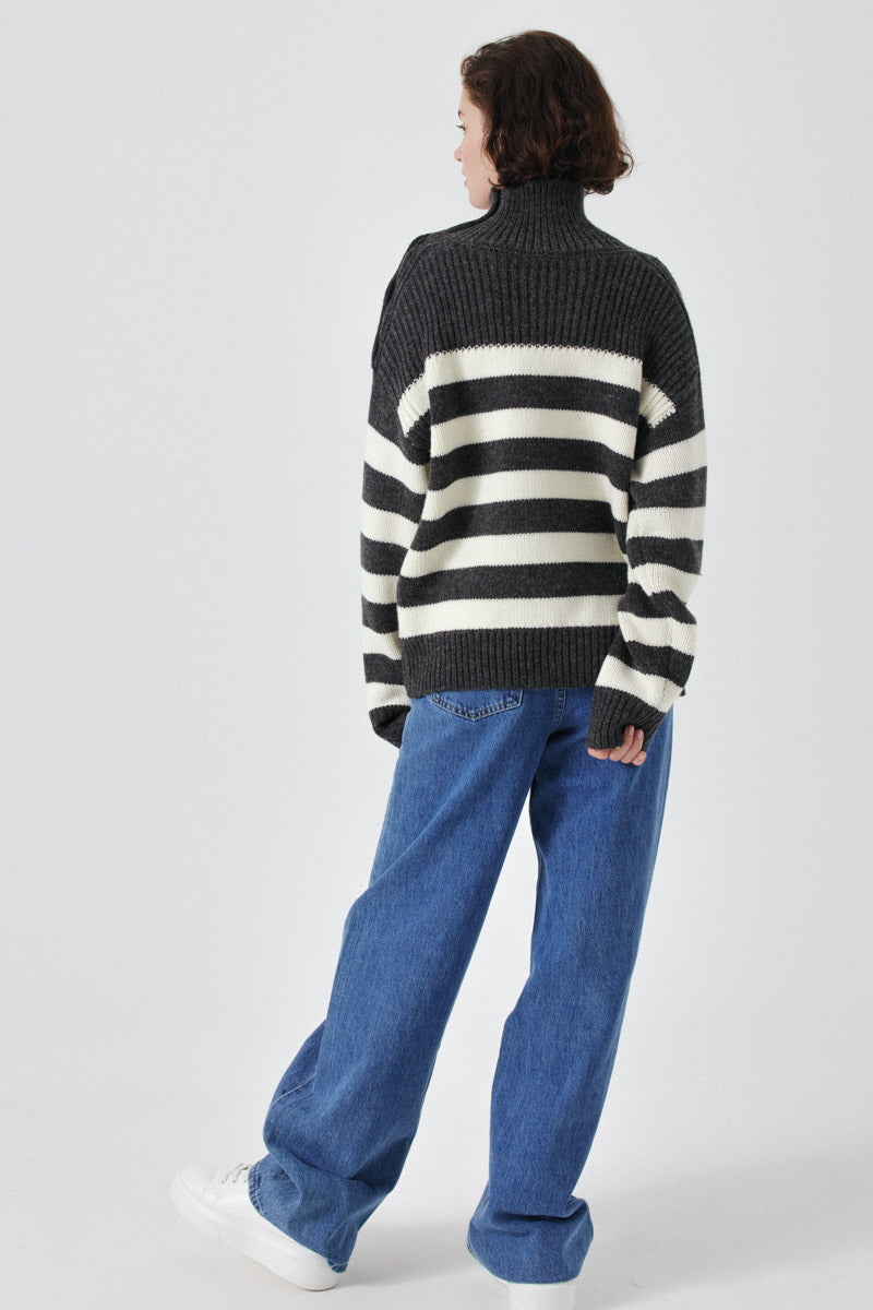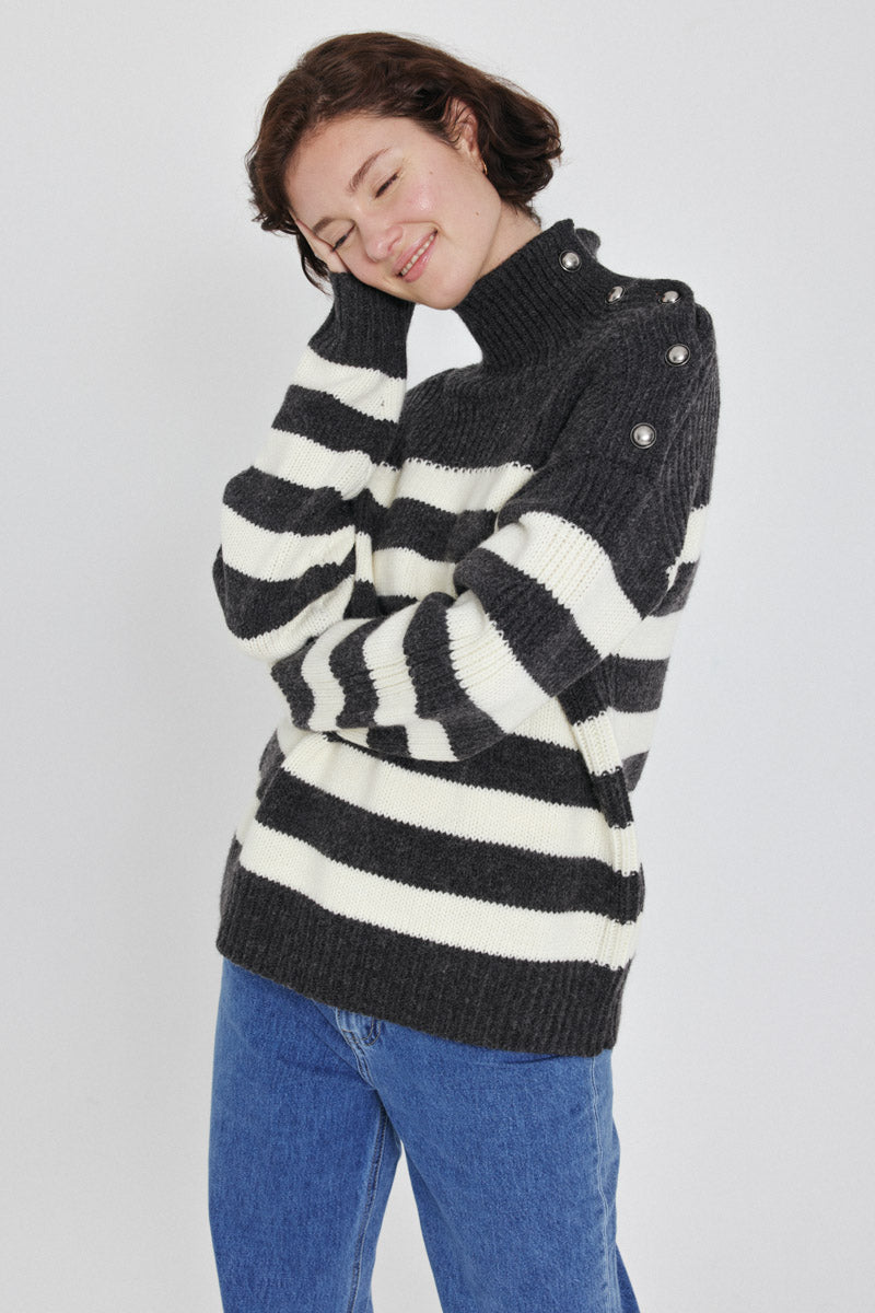 Pull rayé à col montant avec boutons. Chic et pratique pour l'hiver.