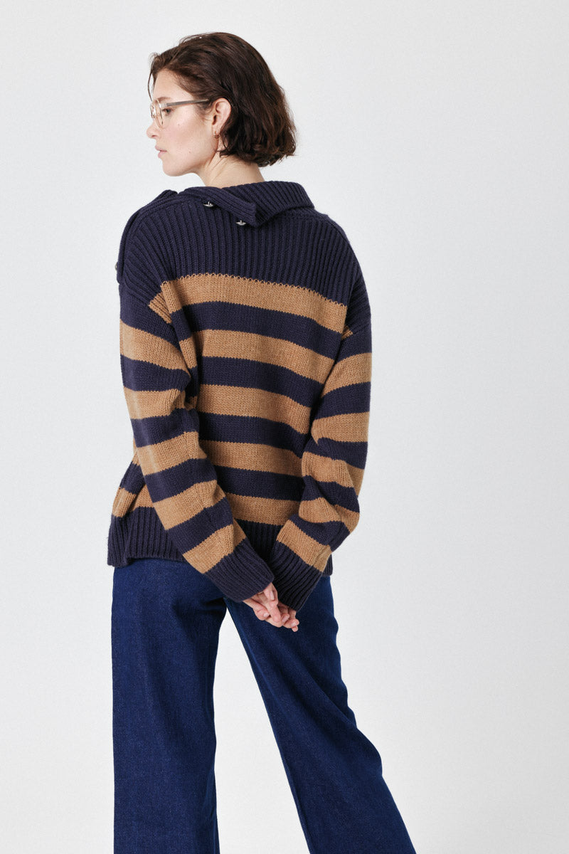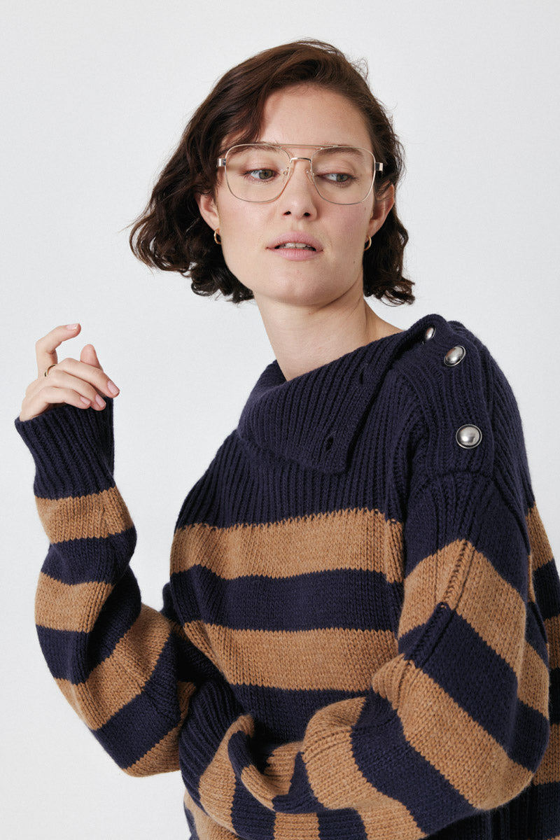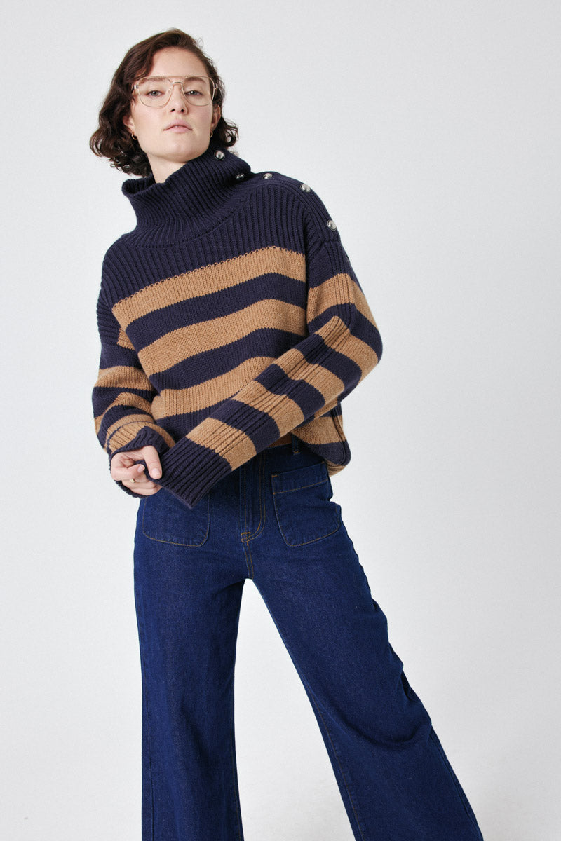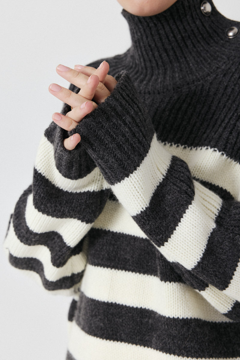 Pull rayé à col montant avec boutons. Chic et pratique pour l'hiver.