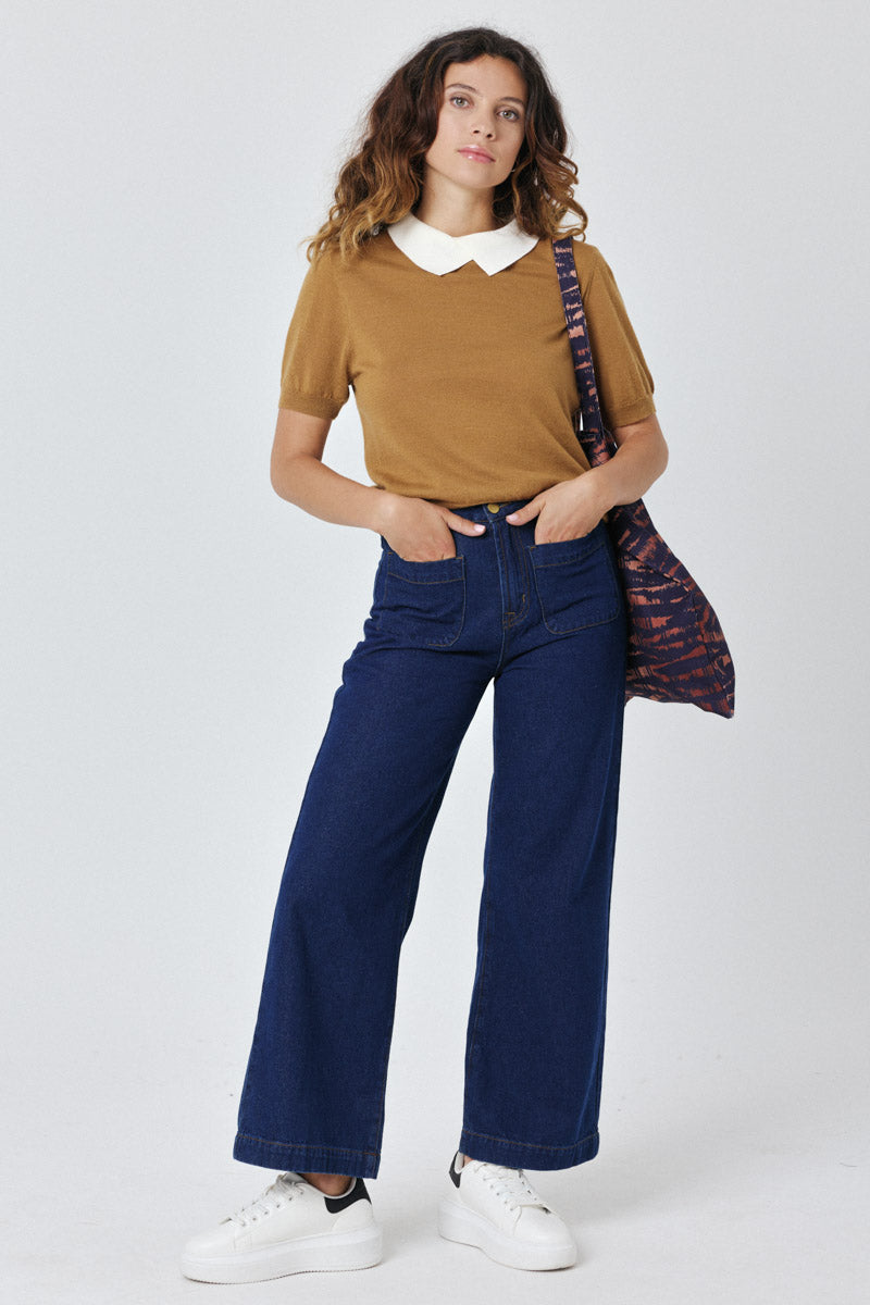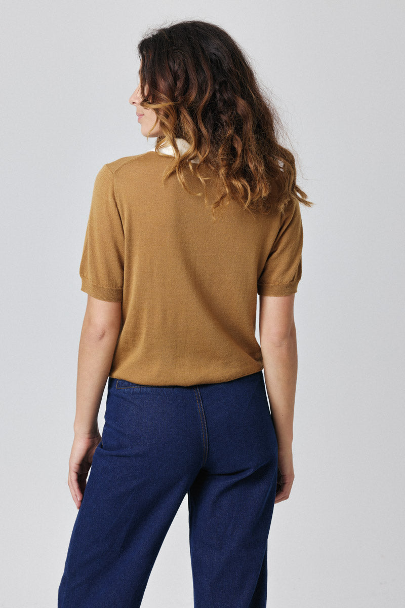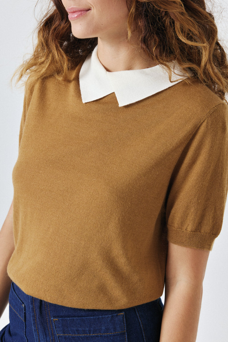Pull à manches courtes avec col contrasté. Un essentiel élégant pour rehausser votre garde-robe automnale.