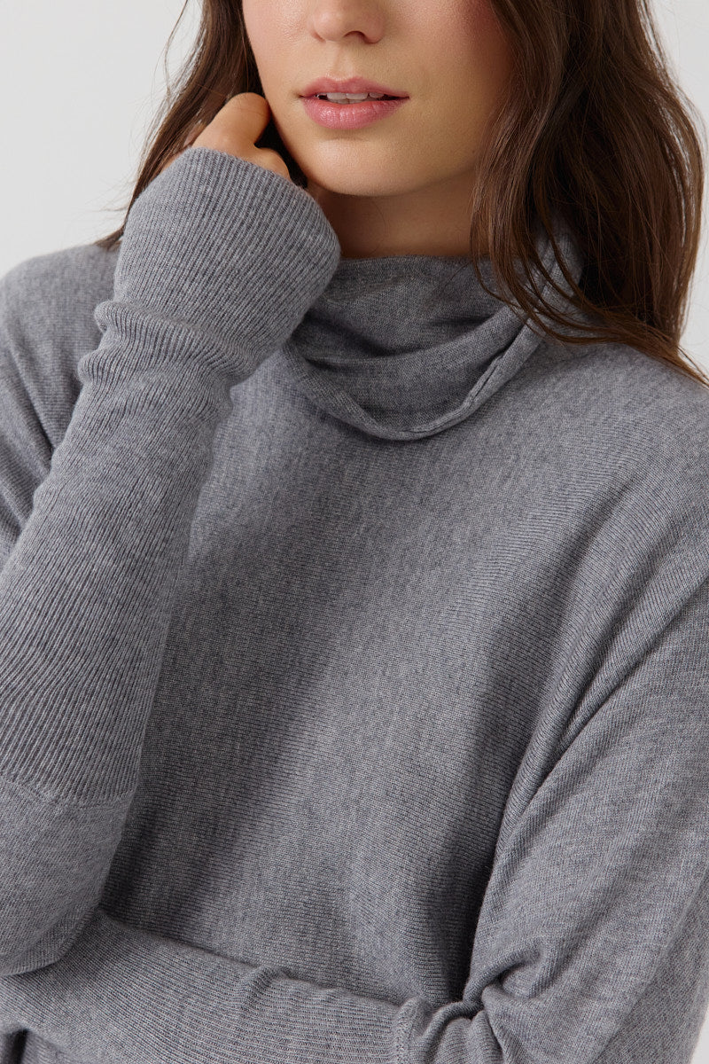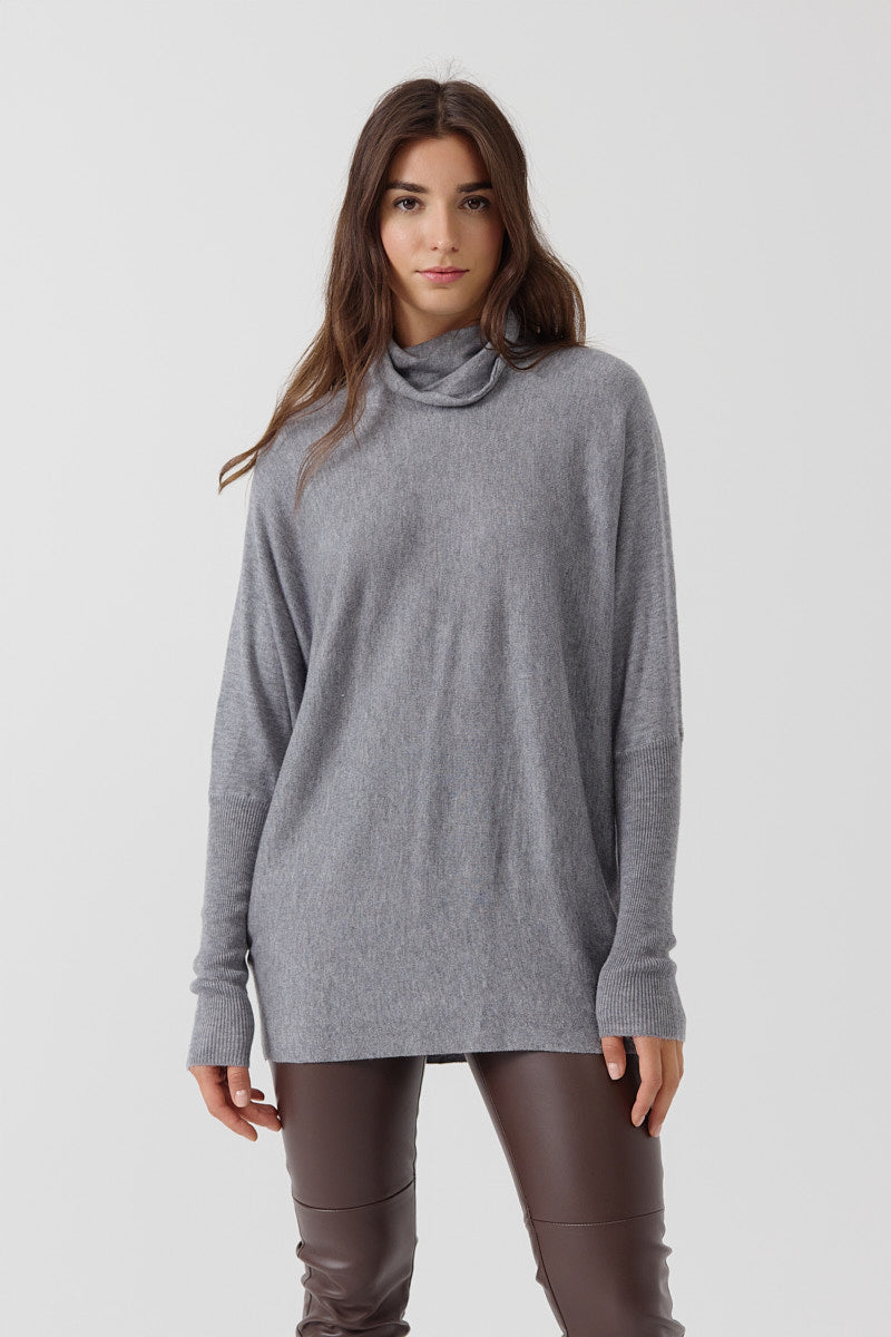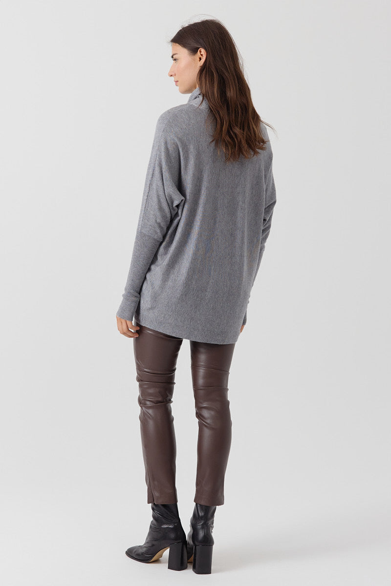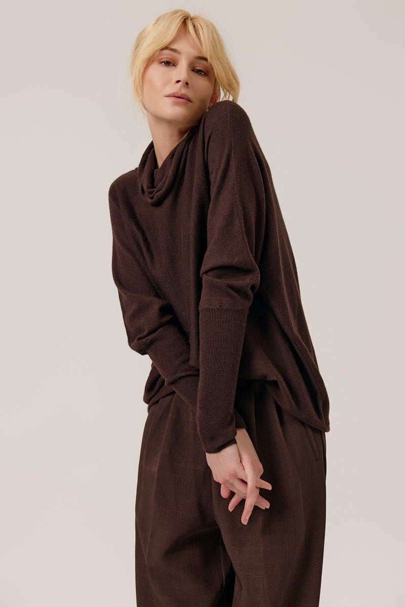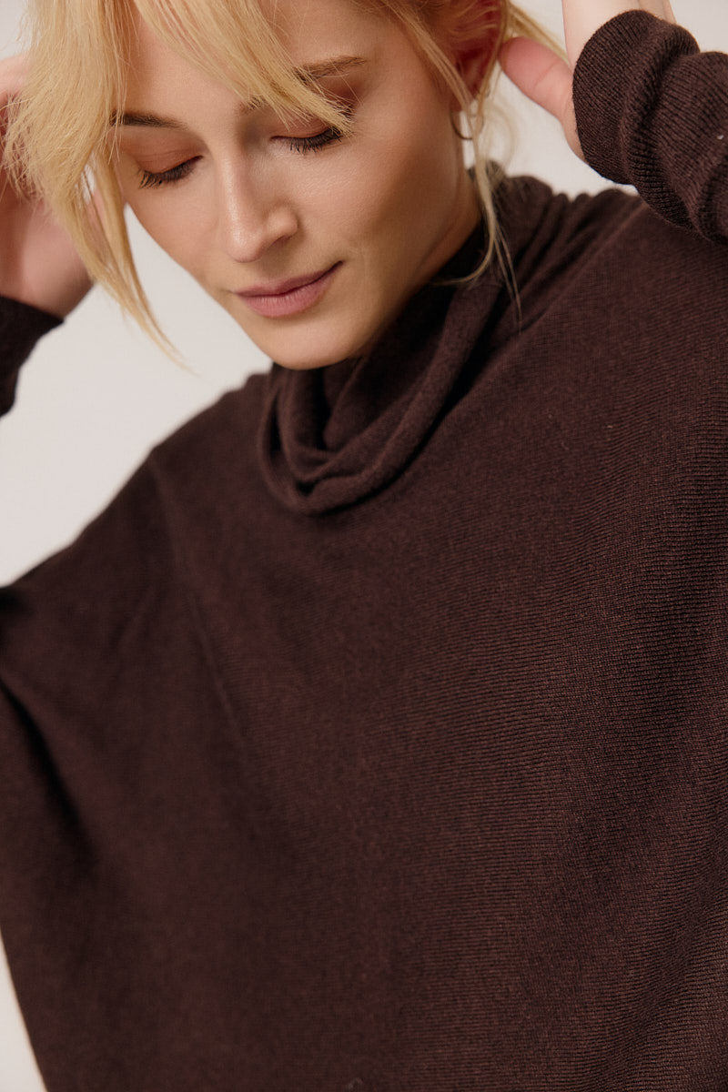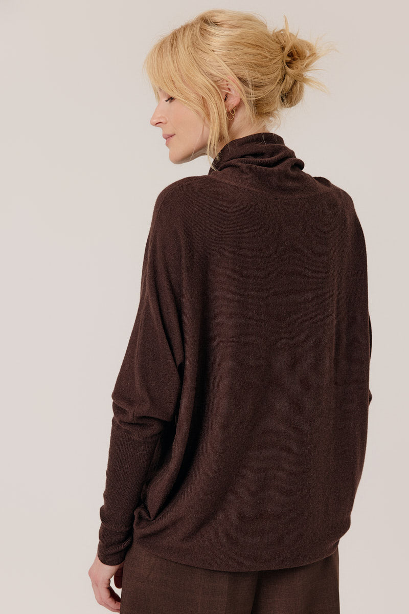 Pull col bateau en maille duveteuse. Manches amples 3/4. Décolleté V dans le dos avec lien à nouer. Coupe ample et féminine.