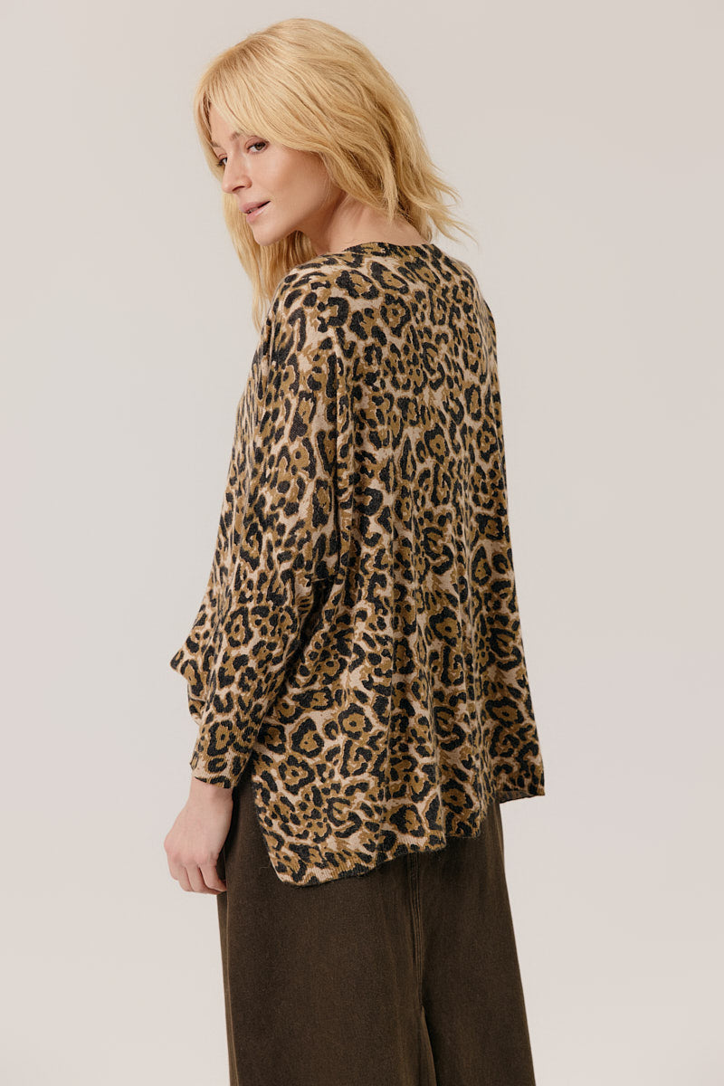 Pull col V à manches longues. Imprimé léopard sur l'ensemble. Coupe ample avec base droite.