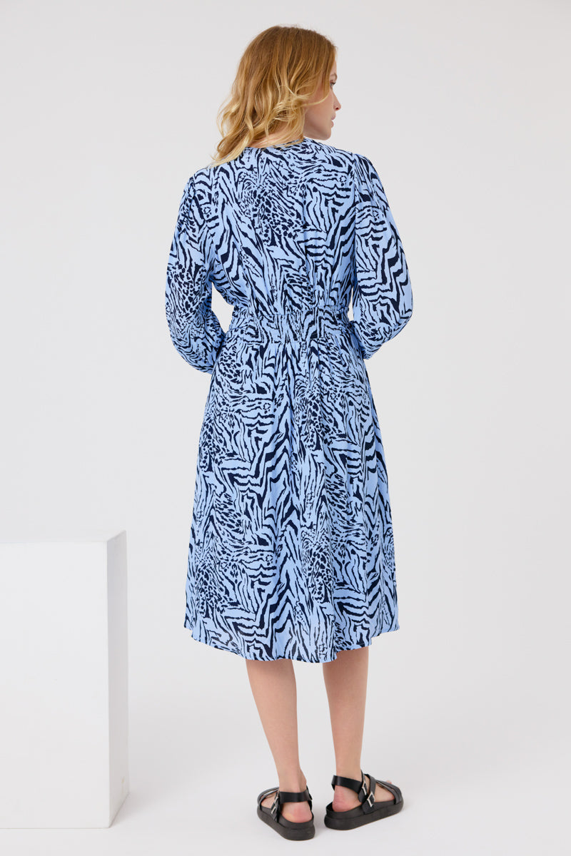 Une robe midi à motifs animaliers, combinant modernité et audace. Avec sa coupe portefeuille flatteuse et ses manches longues, elle est idéale pour des occasions habillées tout en restant confortable grâce à son tissu léger.