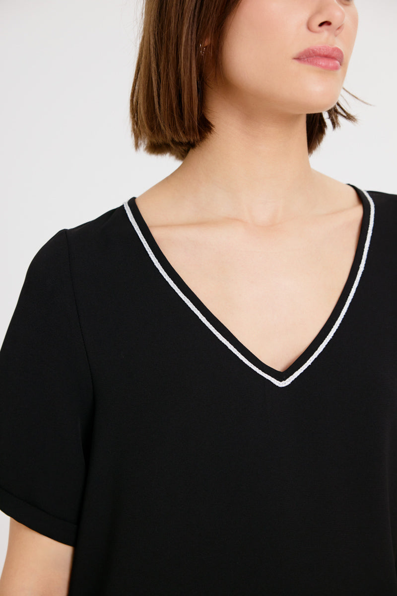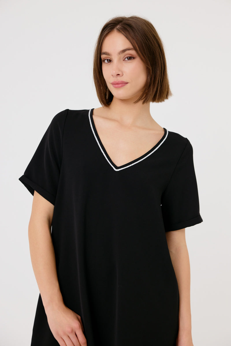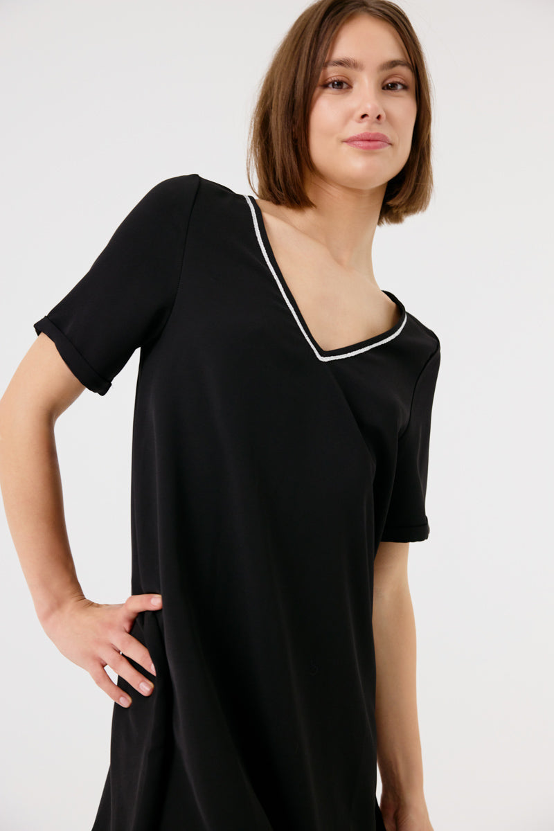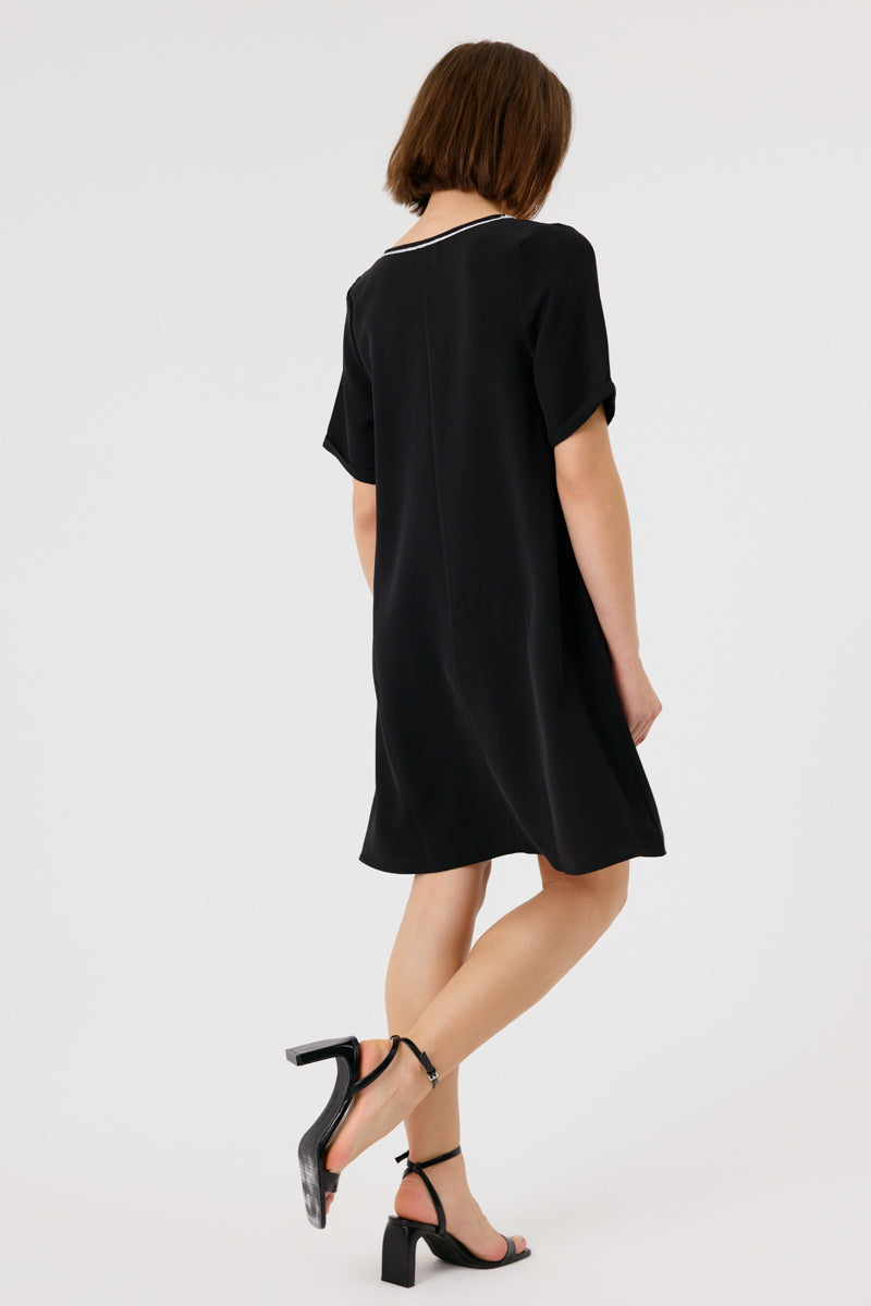 Alliant simplicité et élégance, cette robe noire offre une coupe droite et un col en V subtilement bordé de blanc. Une pièce versatile qui s'adapte aussi bien aux tenues de bureau qu'aux soirées décontractées.