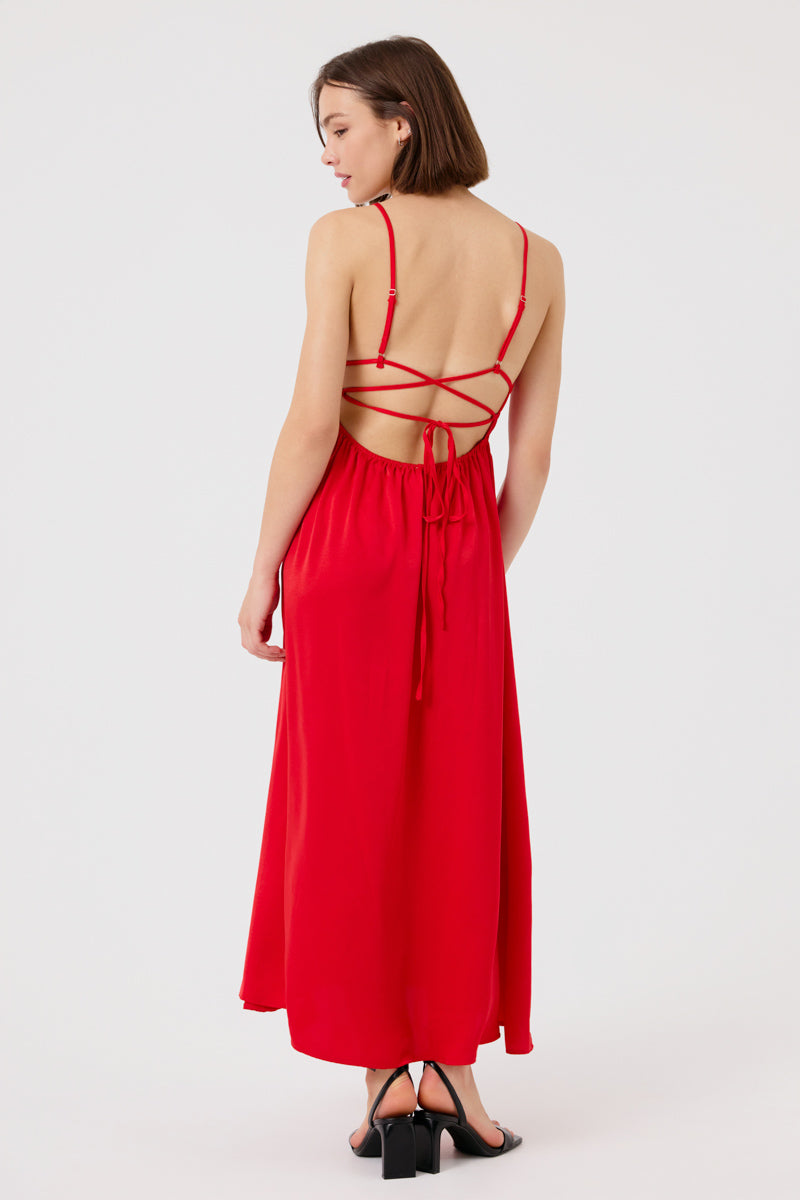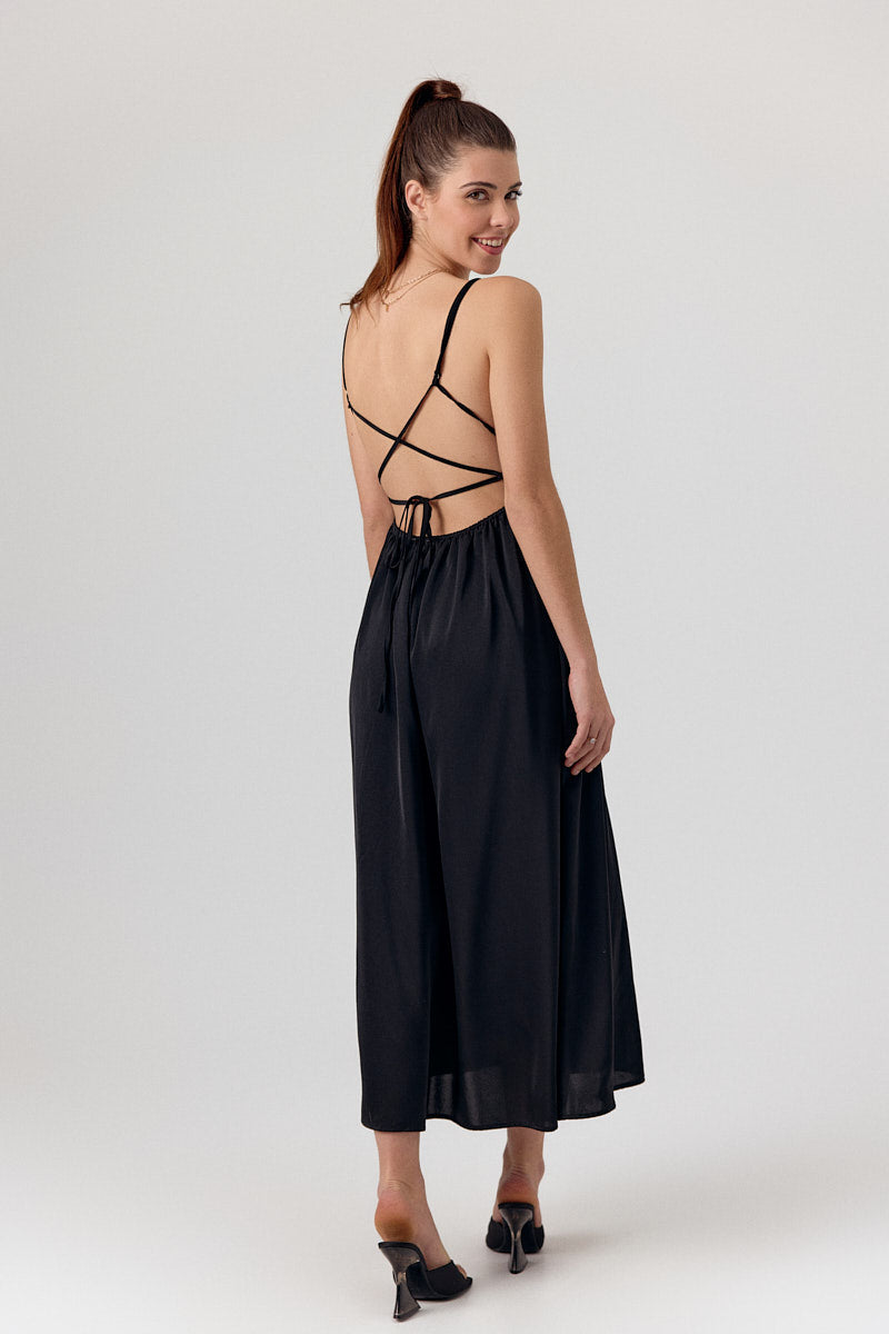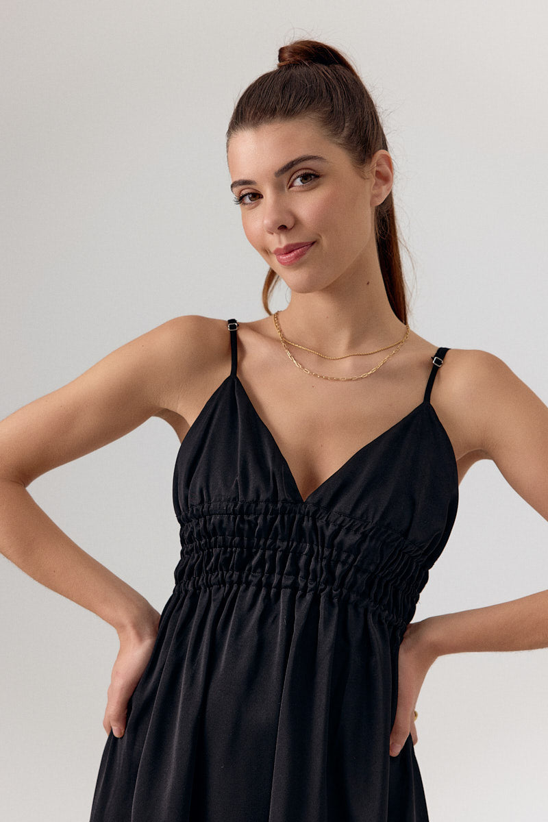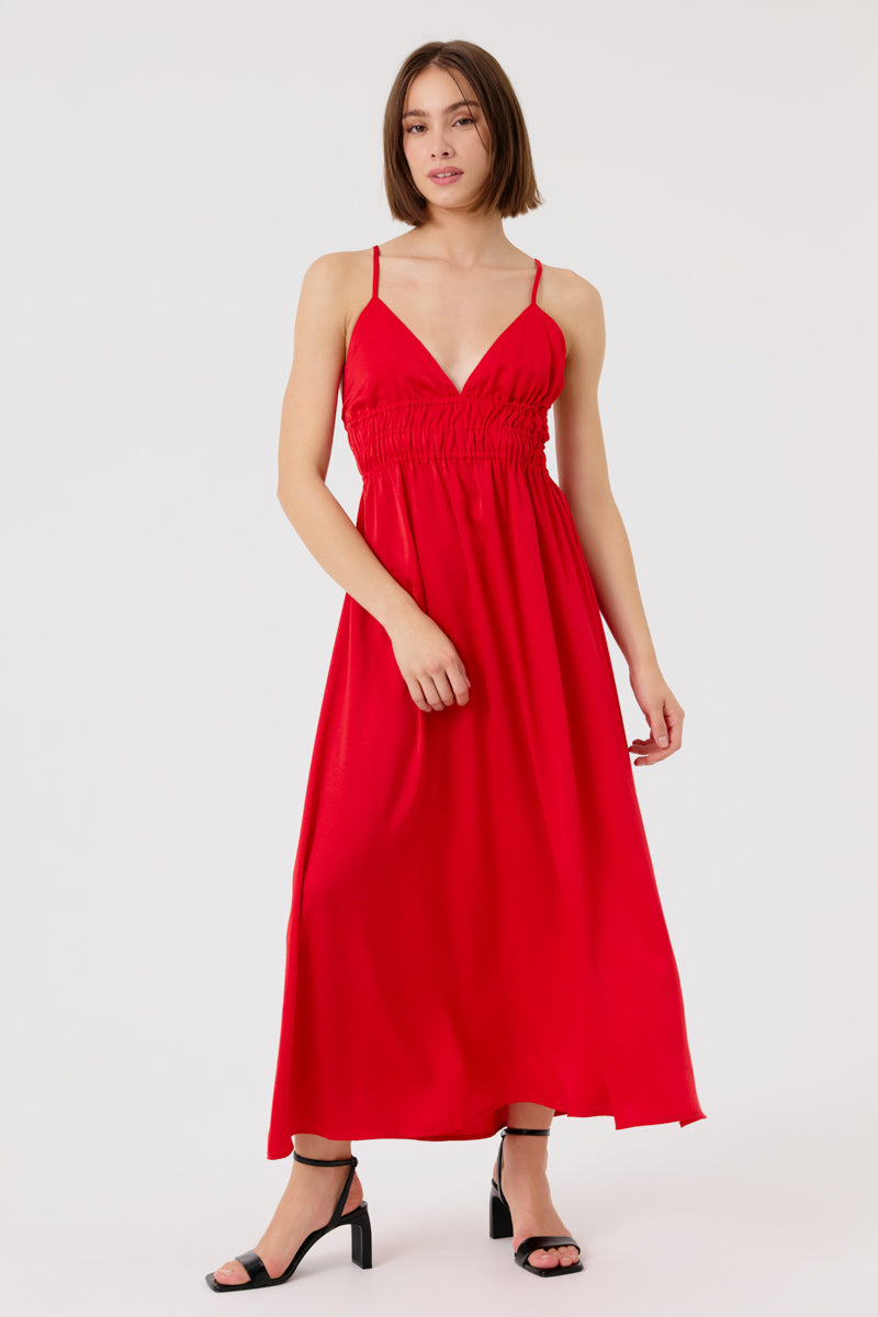 Robe longue avec un décolleté en V et une taille smockée qui met en valeur la silhouette. Le tissu fluide et léger en fait un choix parfait pour une soirée ou une journée estivale.