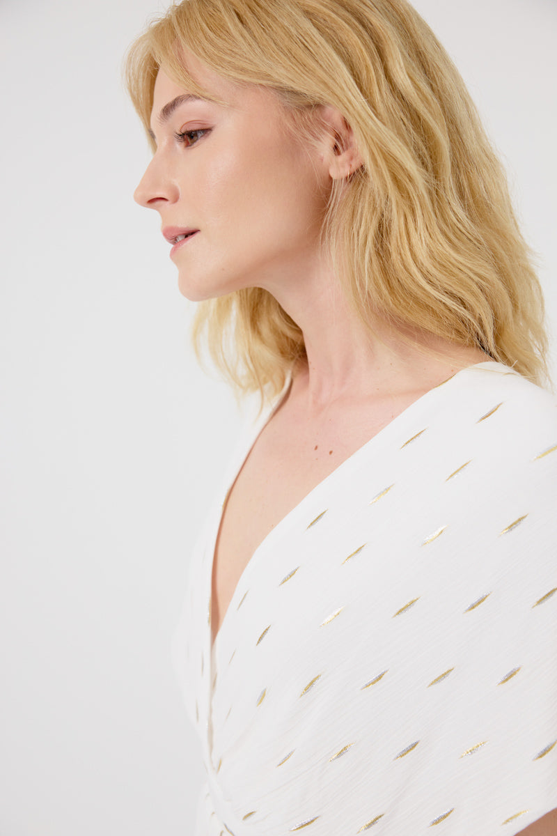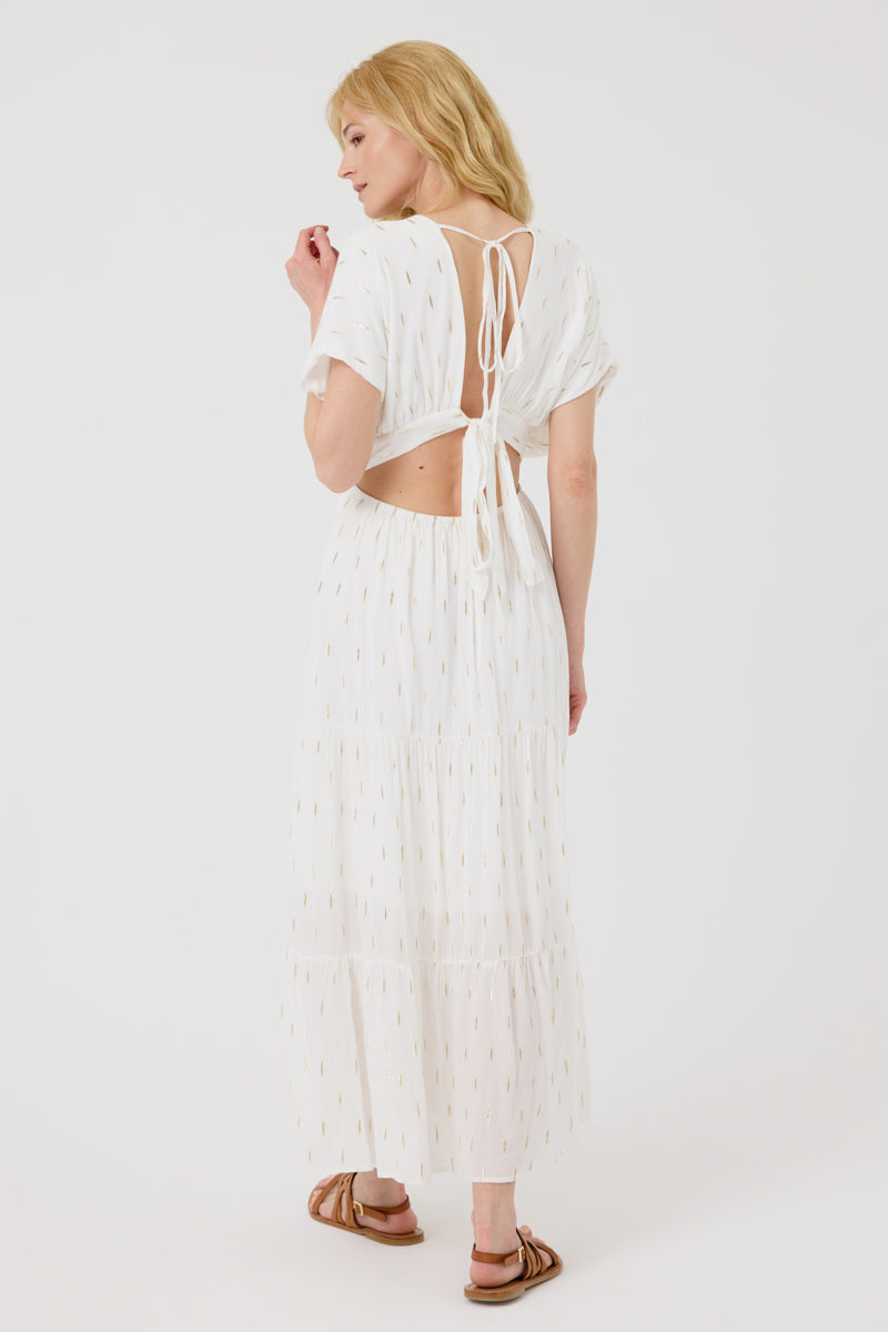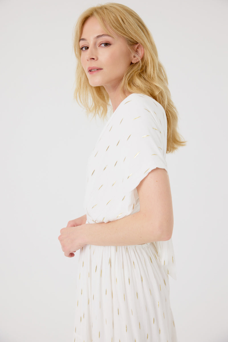 Une robe longue en crêpe ornée de petits motifs discrets pour une touche raffinée. La coupe empire et les volants subtils ajoutent un charme intemporel, parfait pour un événement spécial ou un mariage en plein air.