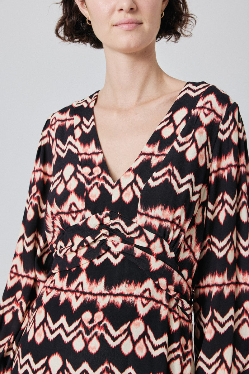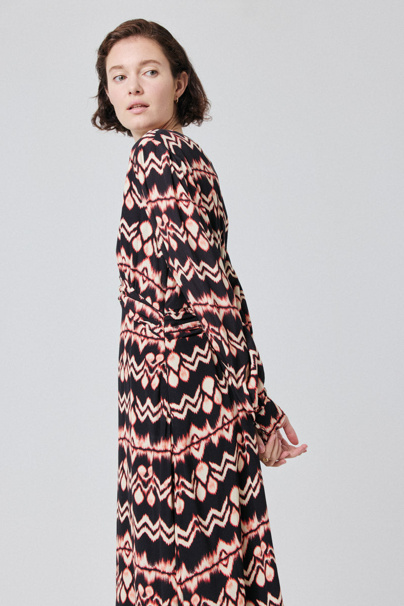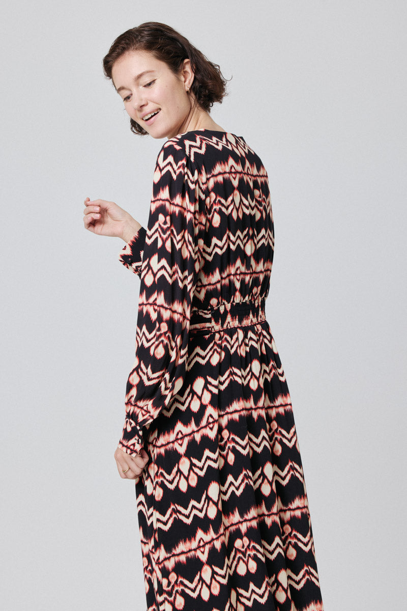 Robe à imprimé graphique avec une coupe flatteuse. Idéale pour une soirée ou une journée en ville. Sentez-vous belle et confiante.