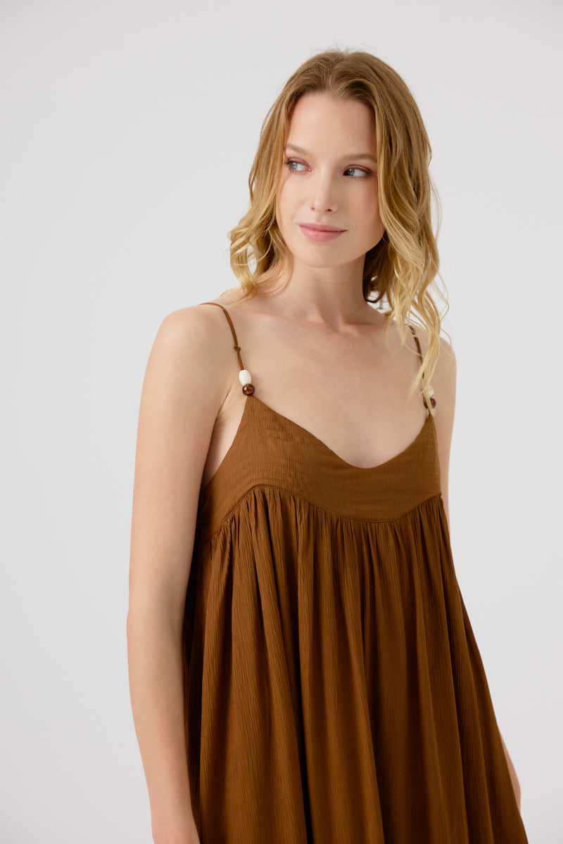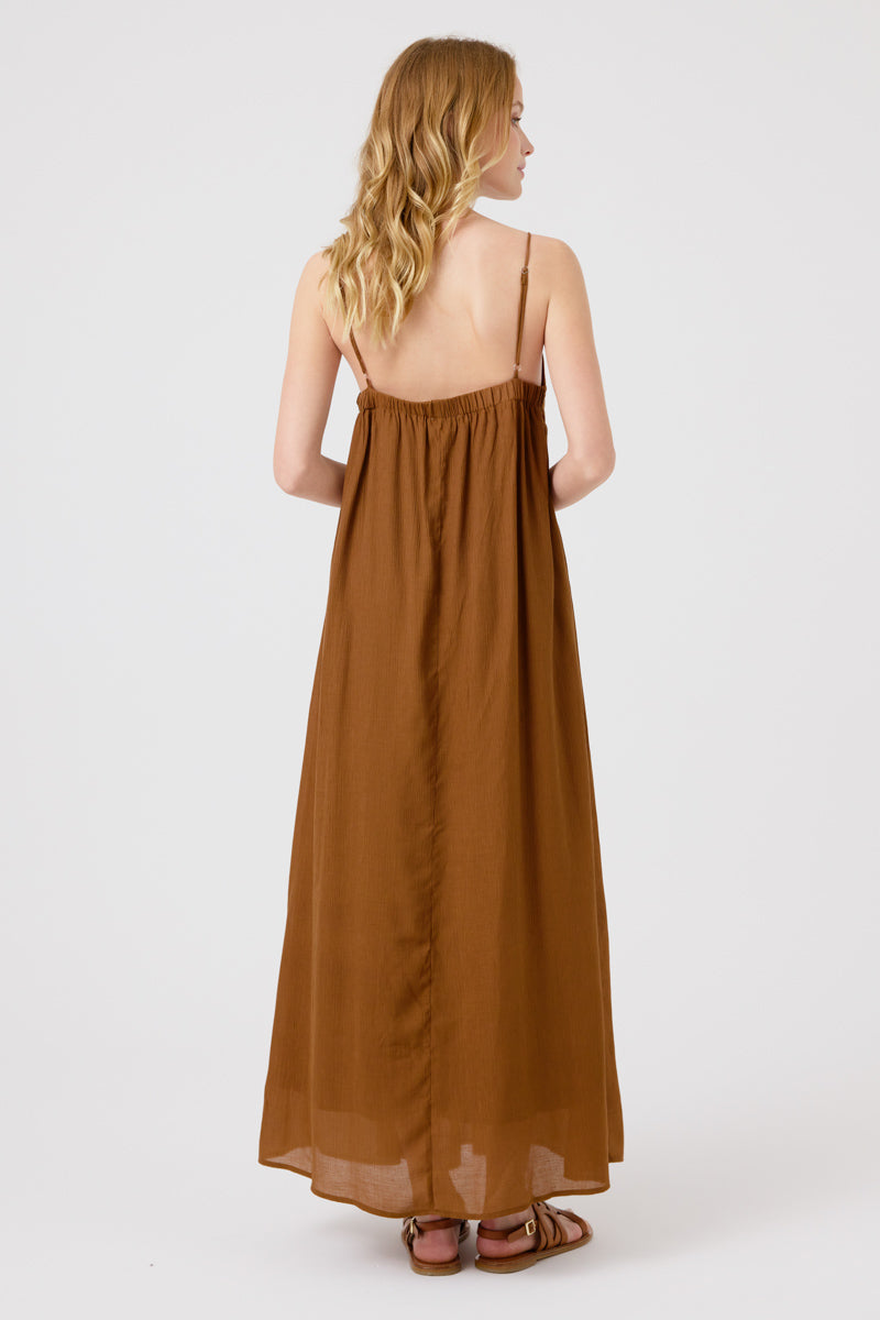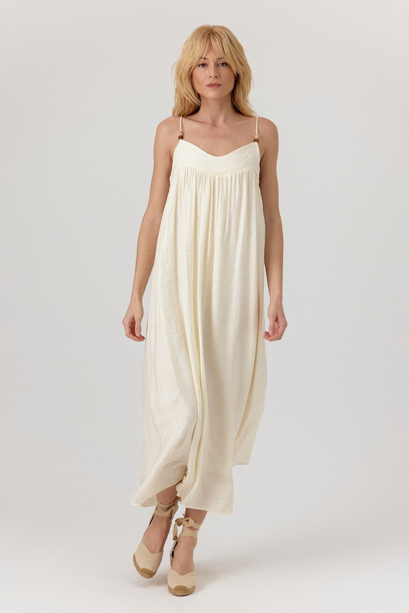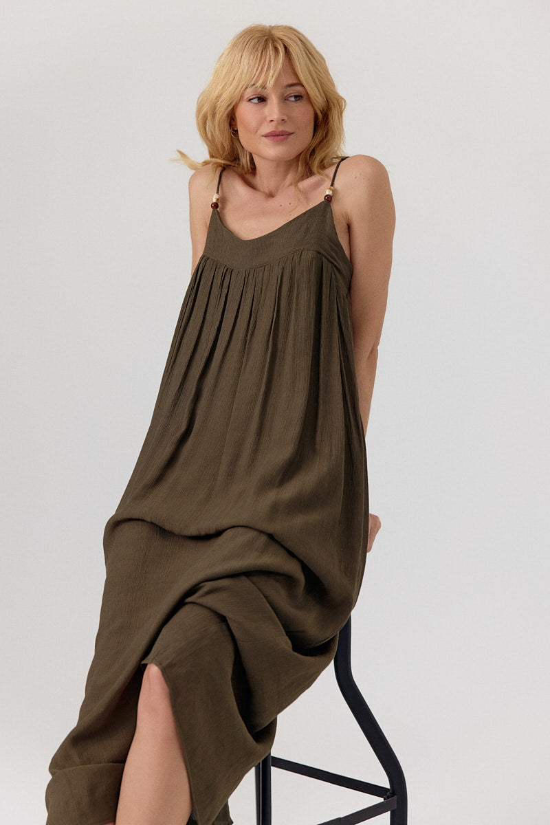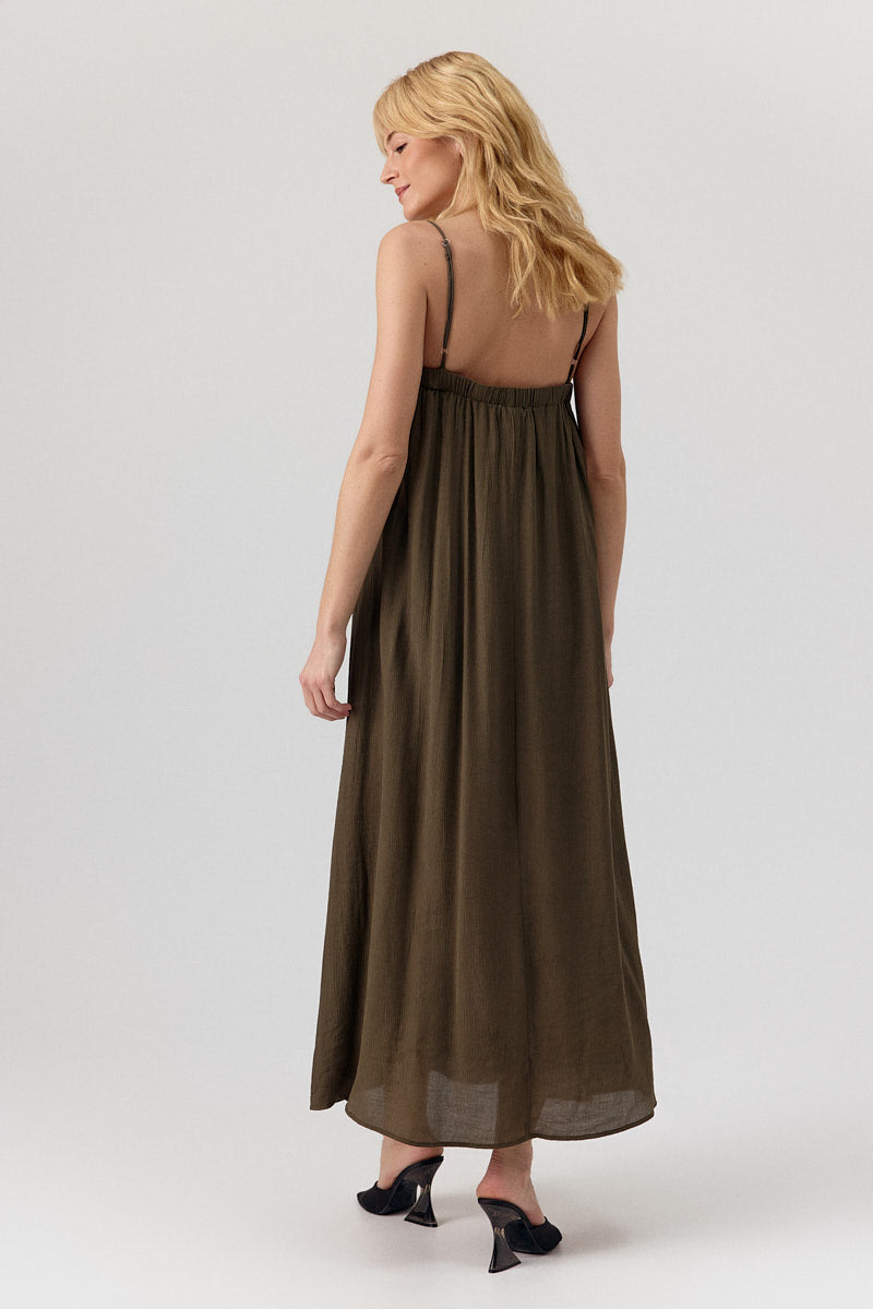 Cette robe longue en tissu léger et fluide offre un tombé élégant et aérien. Les fines bretelles ajustables et le détail froncé sous la poitrine ajoutent une touche féminine, idéale pour des looks estivaux ou des occasions décontractées.