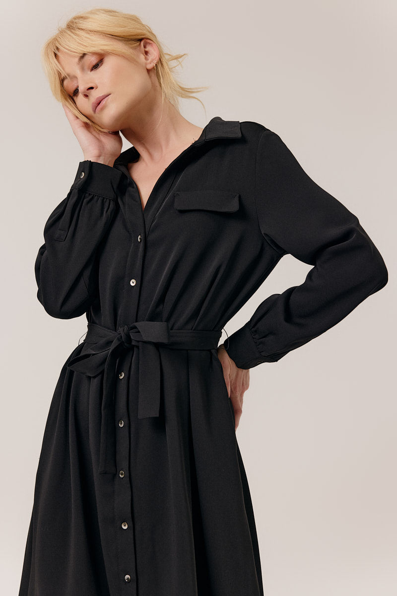 Robe chemise noire à poches et ceinture. Un essentiel structuré pour tous les jours.