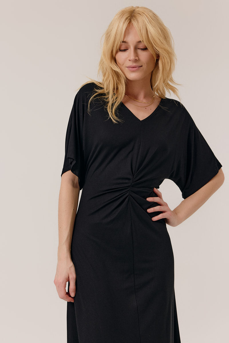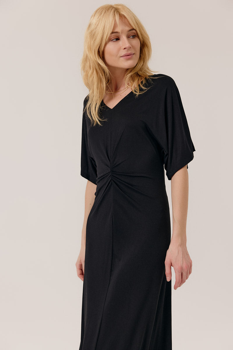 Robe midi fluide à col V, sublimée par un détail froncé à la taille qui met en valeur la silhouette. Ses manches amples apportent confort et élégance, pour une pièce aussi chic que facile à porter.