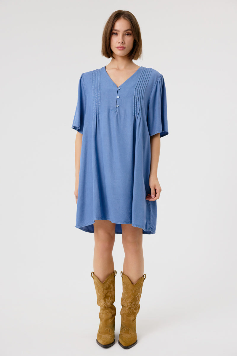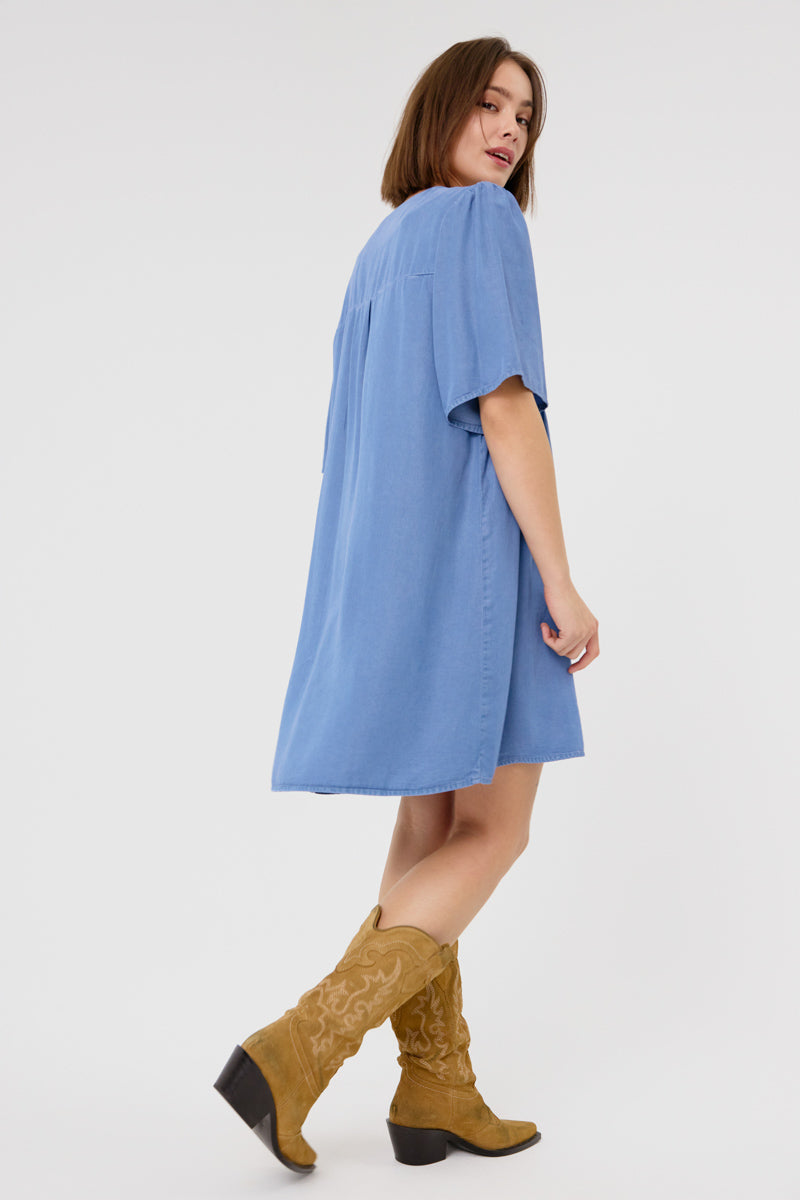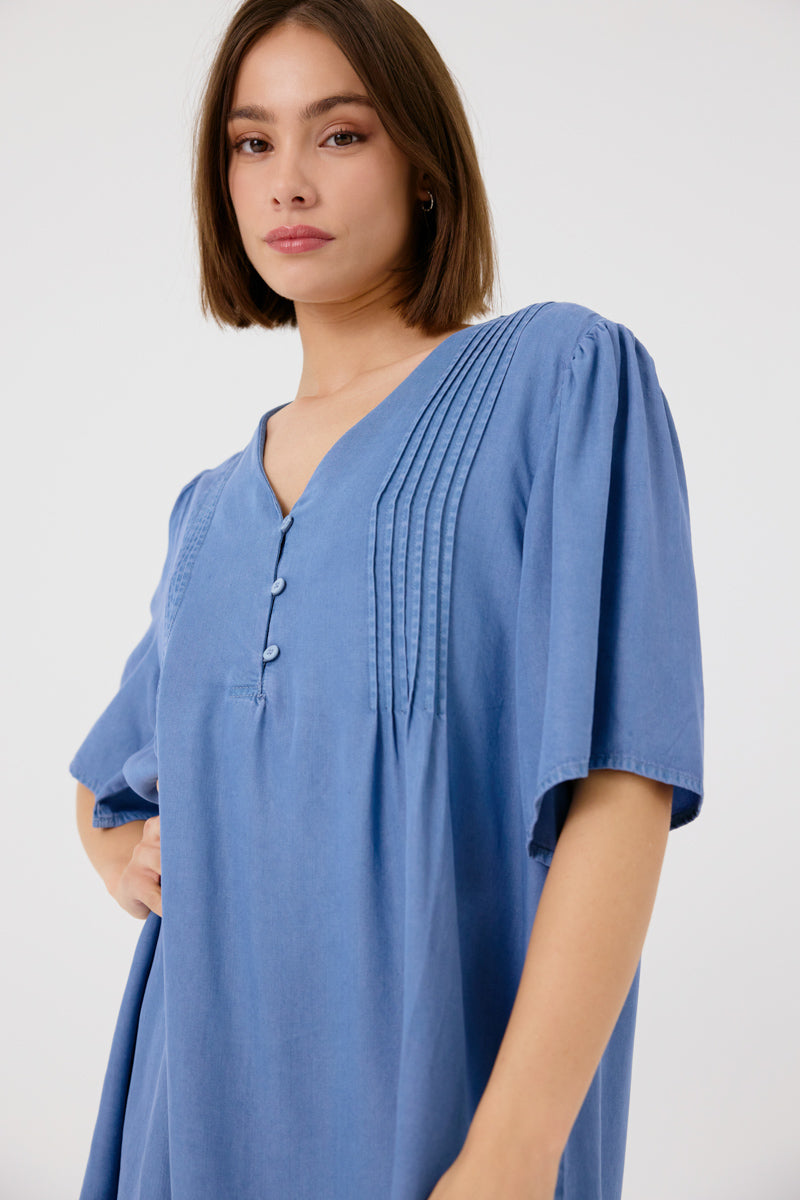 Confortable et élégante, cette robe en denim bleu clair se distingue par ses manches larges et ses plis décoratifs à l'avant. Avec son col en V et ses boutons délicats, elle est parfaite pour un style décontracté chic.
