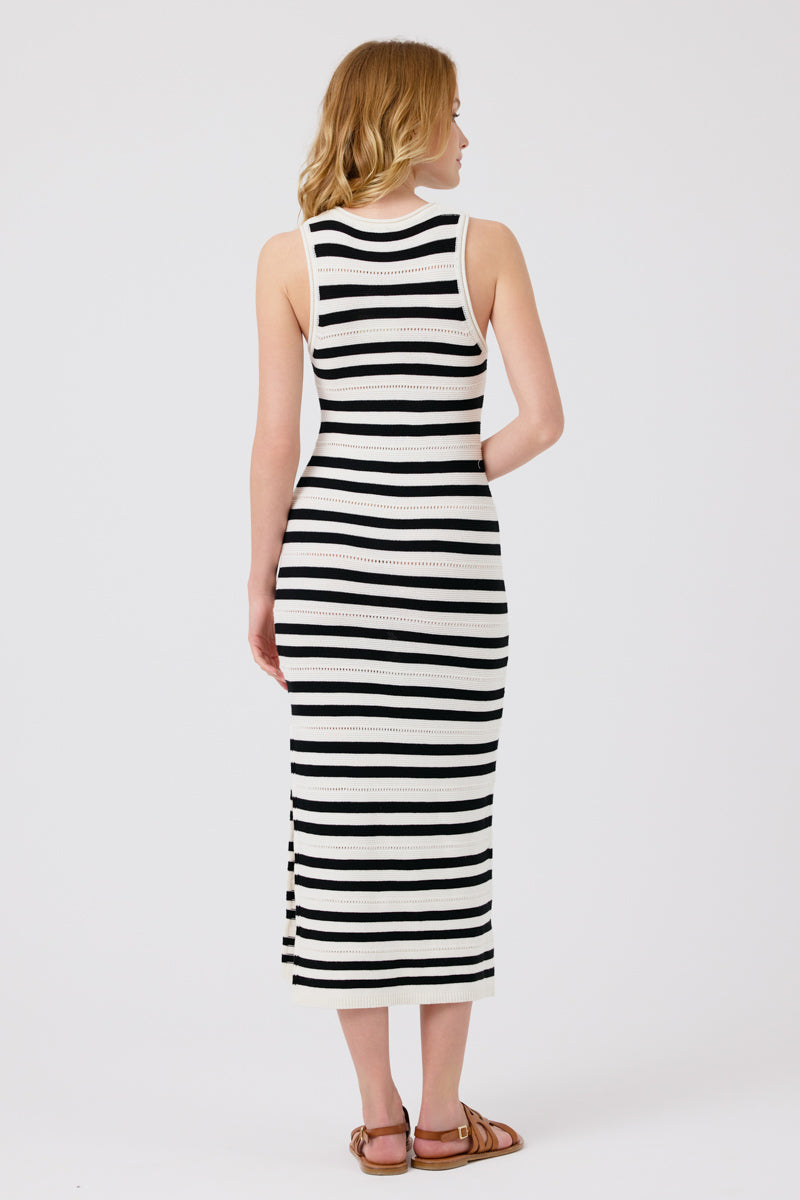 Robe longue à rayures en maille ajourée. Avec sa coupe près du corps et son encolure dégagée, elle allie confort et style. Un essentiel estival à porter avec des sandales ou des baskets pour un look casual chic.