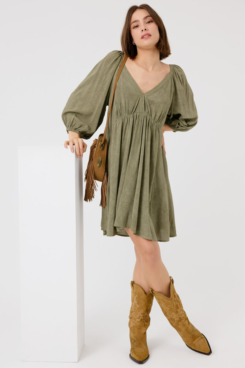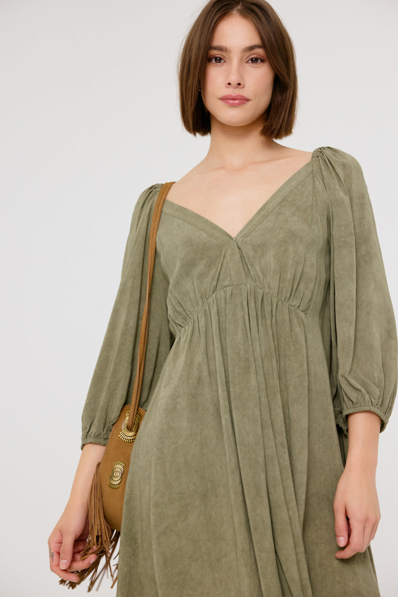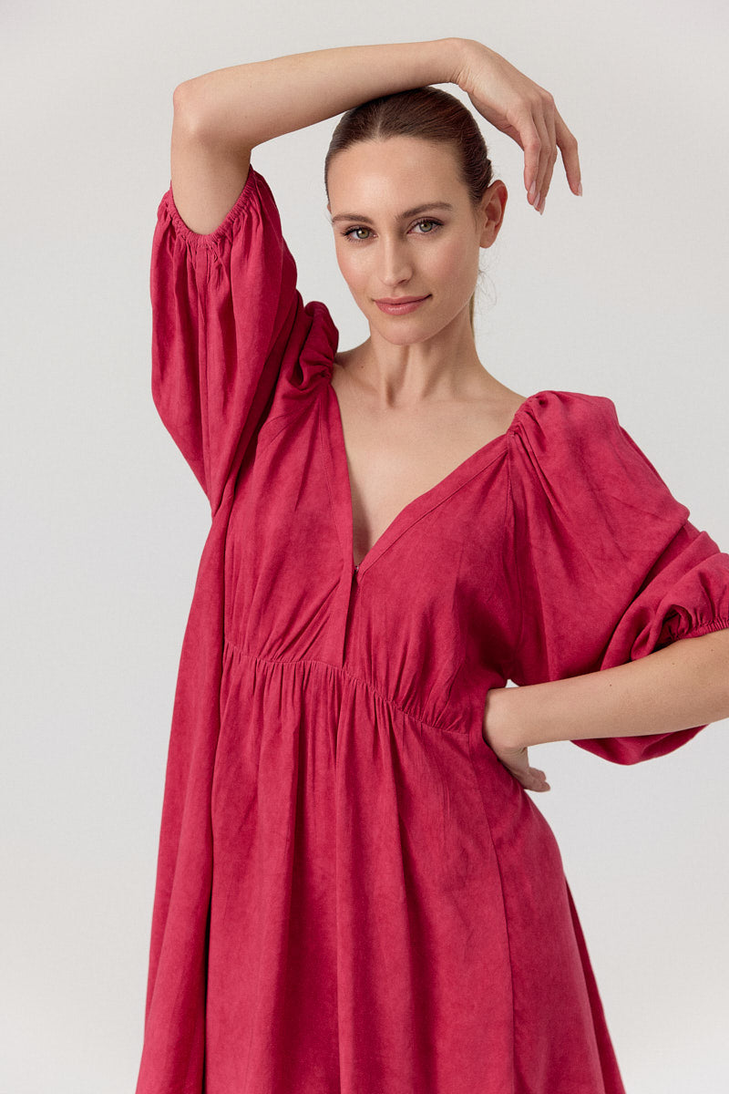 Une robe ample avec des manches bouffantes et un décolleté en V plongeant. Idéale pour un look bohème chic, cette pièce offre une silhouette fluide et une allure sophistiquée.