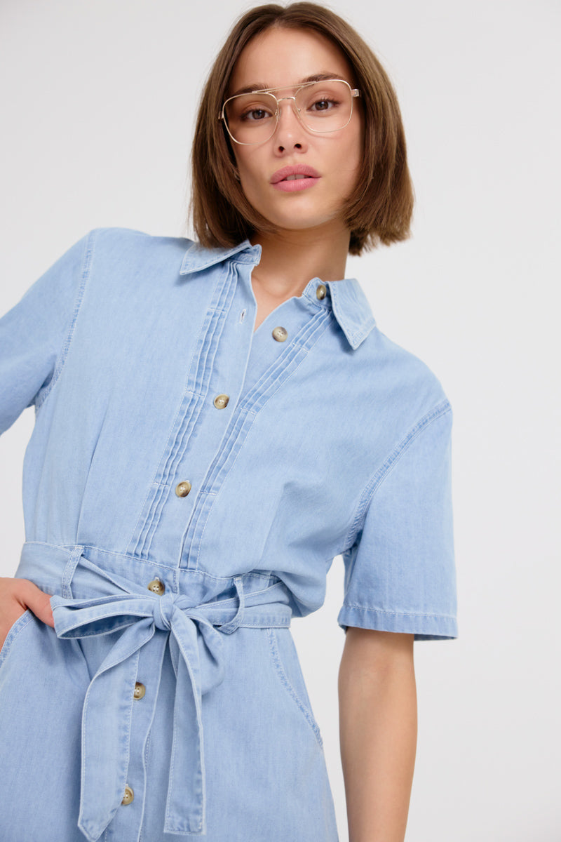 Robe-chemise moderne avec une coupe ajustée et une ceinture à nouer. Polyvalente et chic, elle s'adapte aussi bien à un look casual qu'à une tenue plus habillée. Un incontournable de la garde-robe.