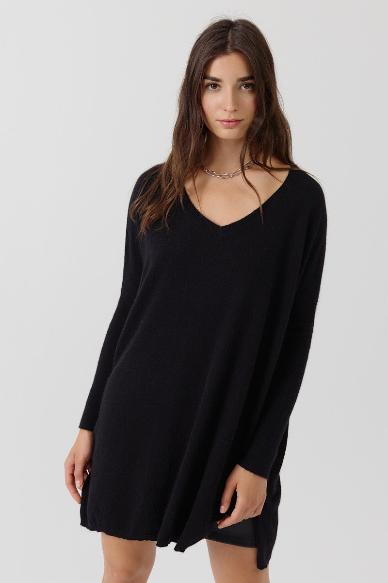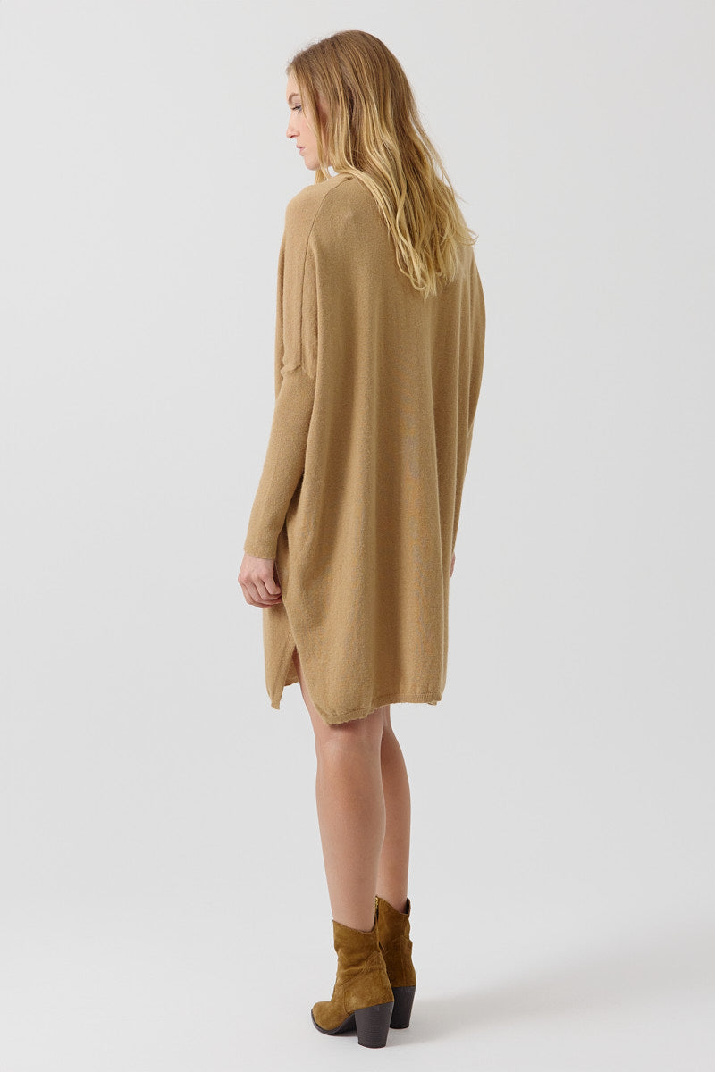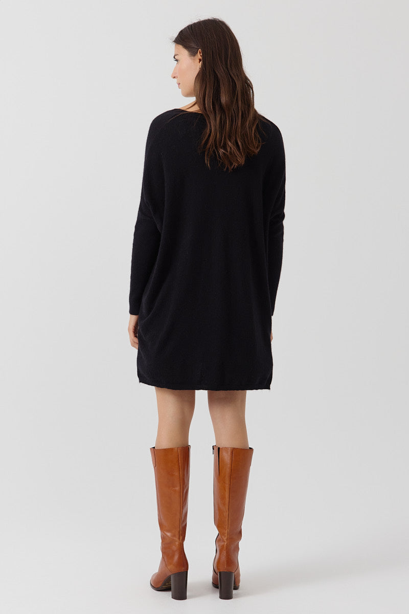 Robe pull ample à col V, en maille douce et chaude, idéale pour l’hiver. Coupe droite et manches longues avec emmanchures descendues.